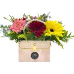 Arreglo floral en caja lila con tonos alegres y delicados, ideal para decirle a tu pareja cuánto la amas. Un detalle tierno y significativo que celebra su amor y sabiduría.