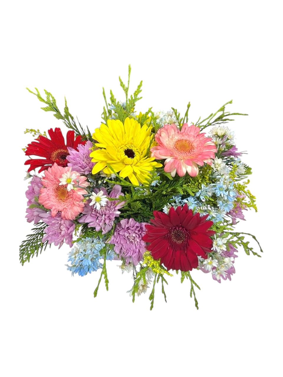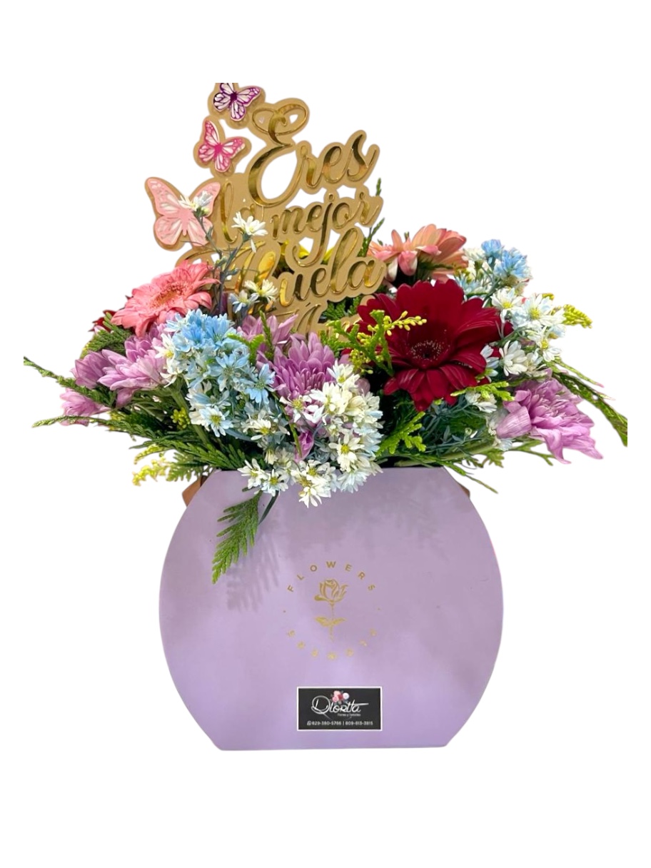 Arreglo floral en caja lila con tonos alegres y delicados, ideal para decirle a tu pareja cuánto la amas. Un detalle tierno y significativo que celebra su amor y sabiduría.