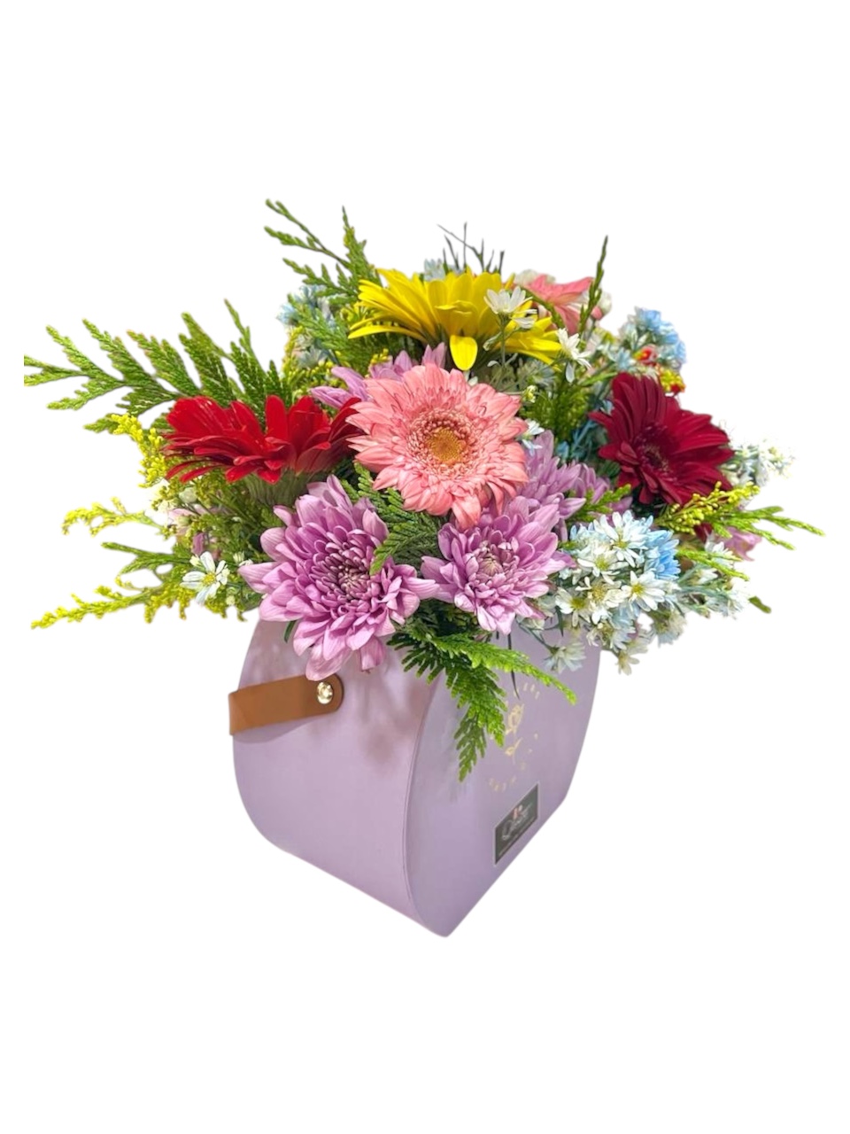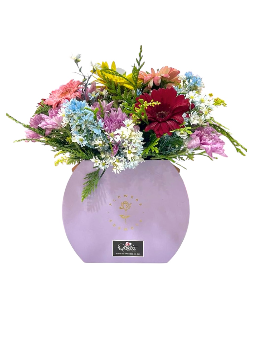 Arreglo floral en caja lila con tonos alegres y delicados.