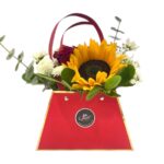 Un hermoso bolso floral con rosas y claveles en tonos naranja, ideal para decirle a mamá cuánto la amas con un detalle lleno de color, elegancia y cariño.