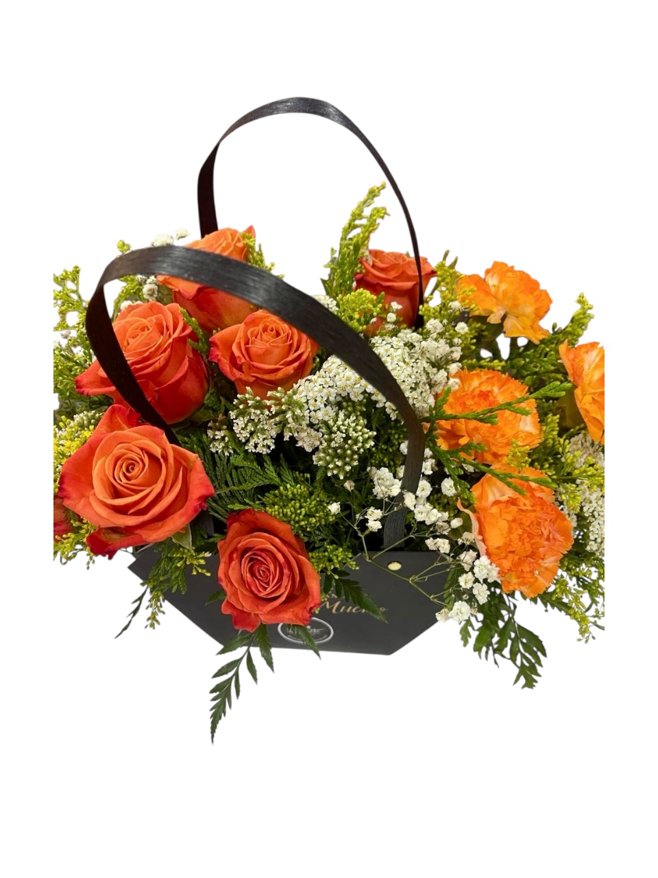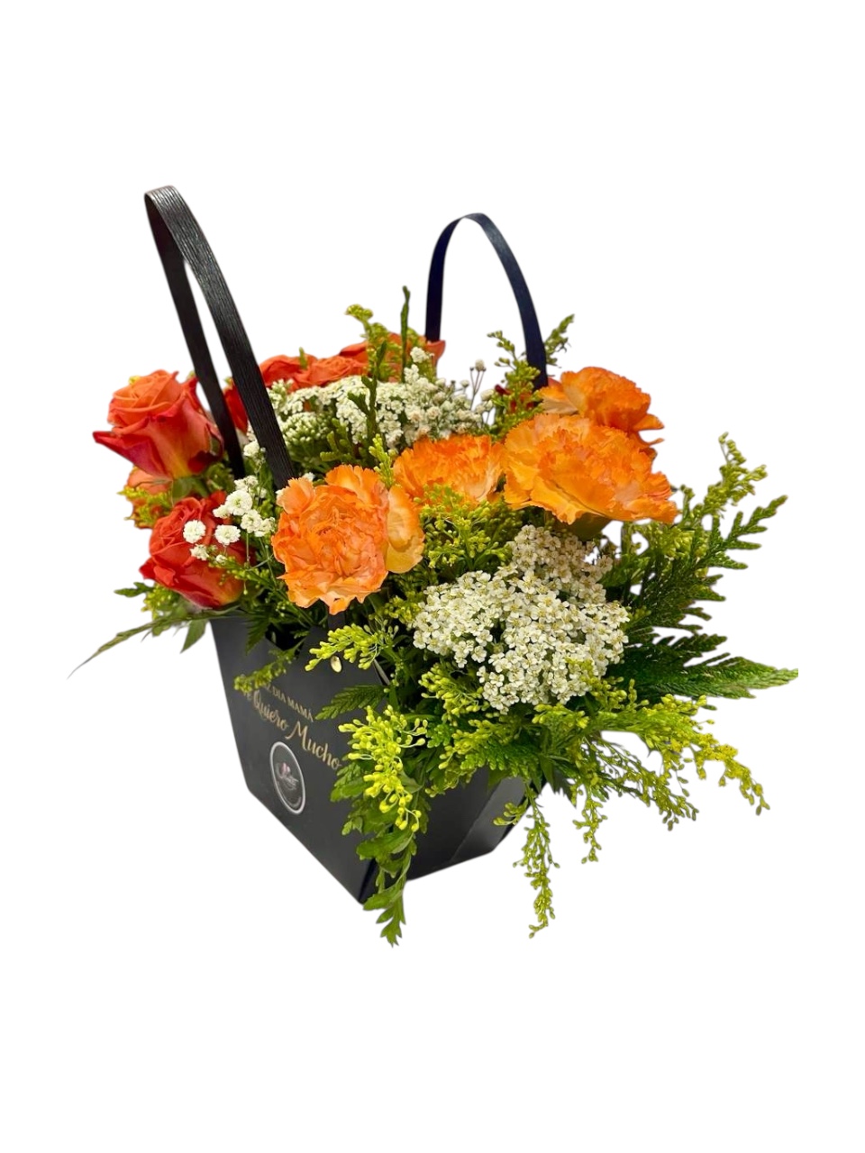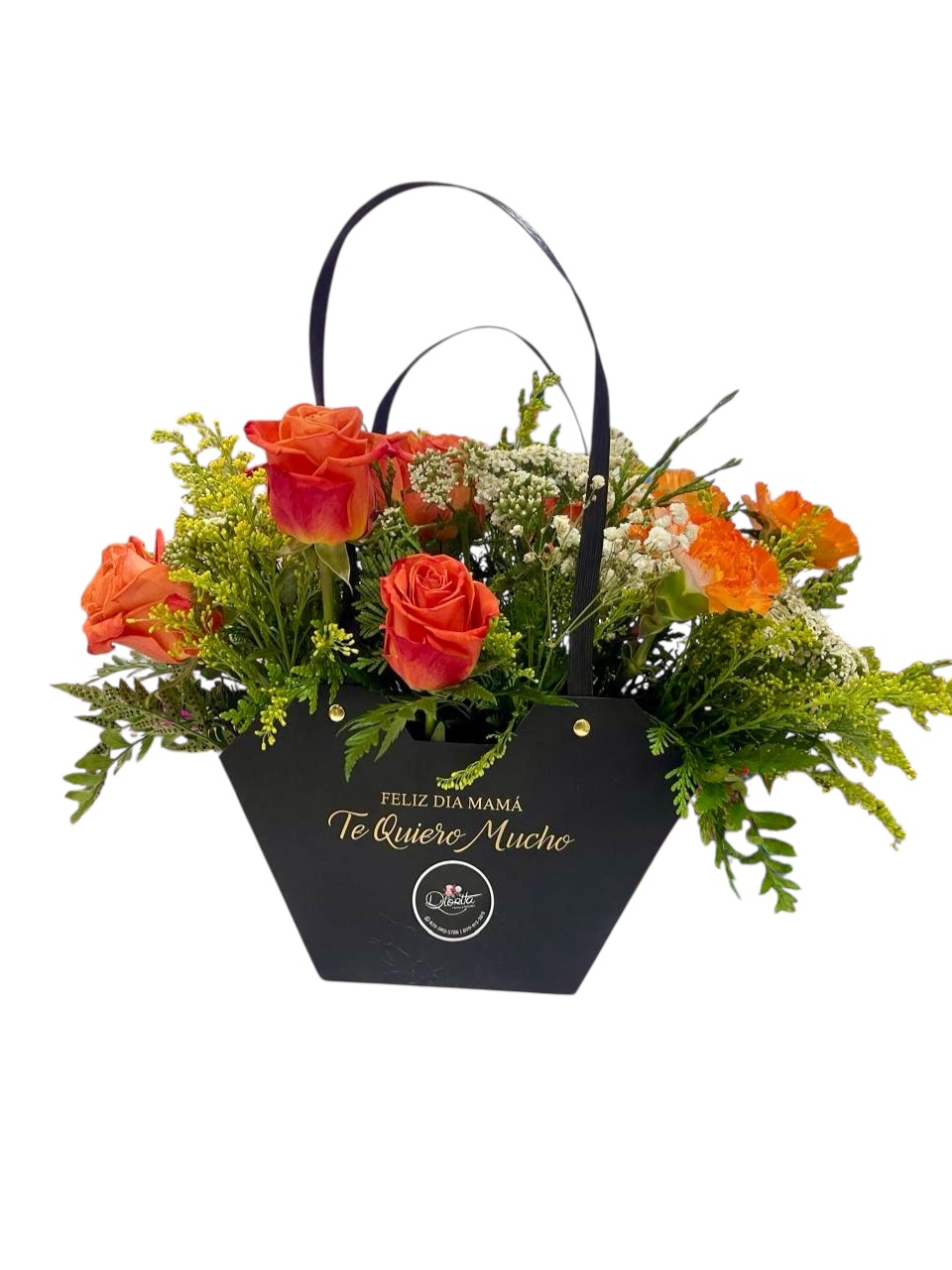 Un hermoso bolso floral con rosas y claveles en tonos naranja, ideal para decirle a mamá cuánto la amas con un detalle lleno de color, elegancia y cariño.