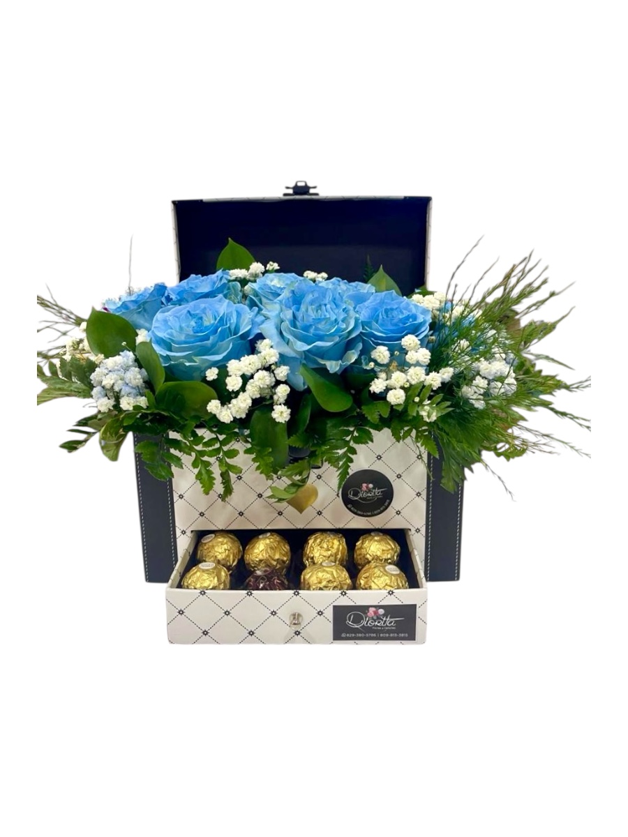 Caja elegante con rosas azules naturales y compartimiento de chocolates. Una combinación perfecta de dulzura y distinción para sorprender a lo grande.