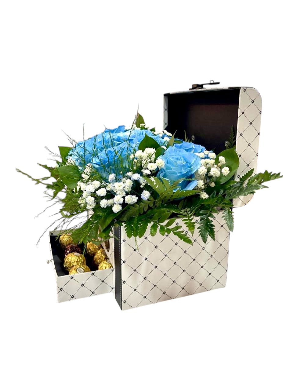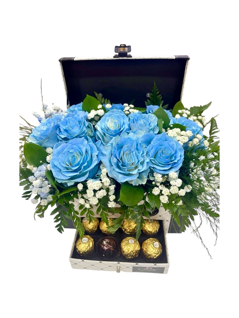 Caja elegante con rosas azules naturales y compartimiento de chocolates.