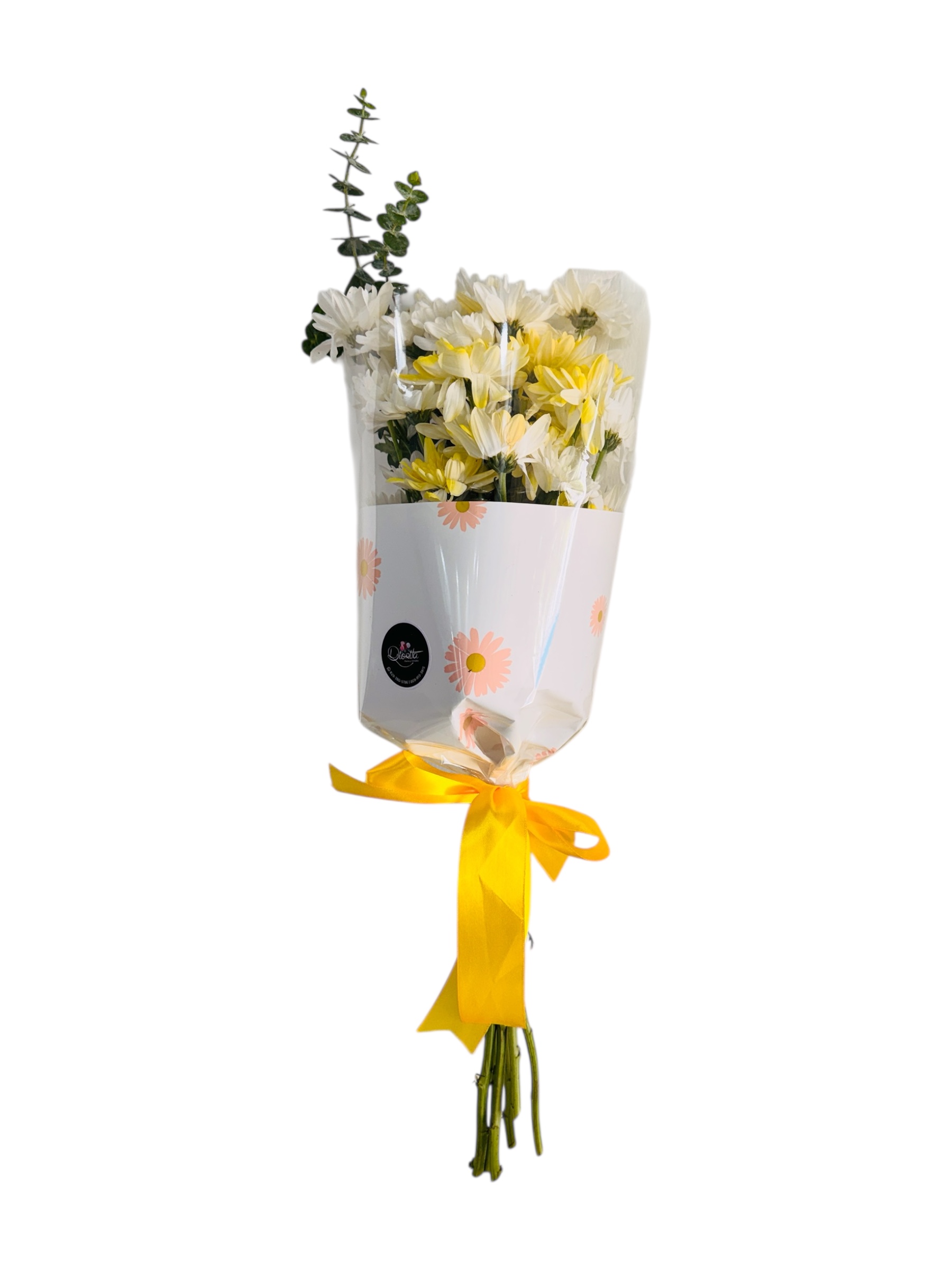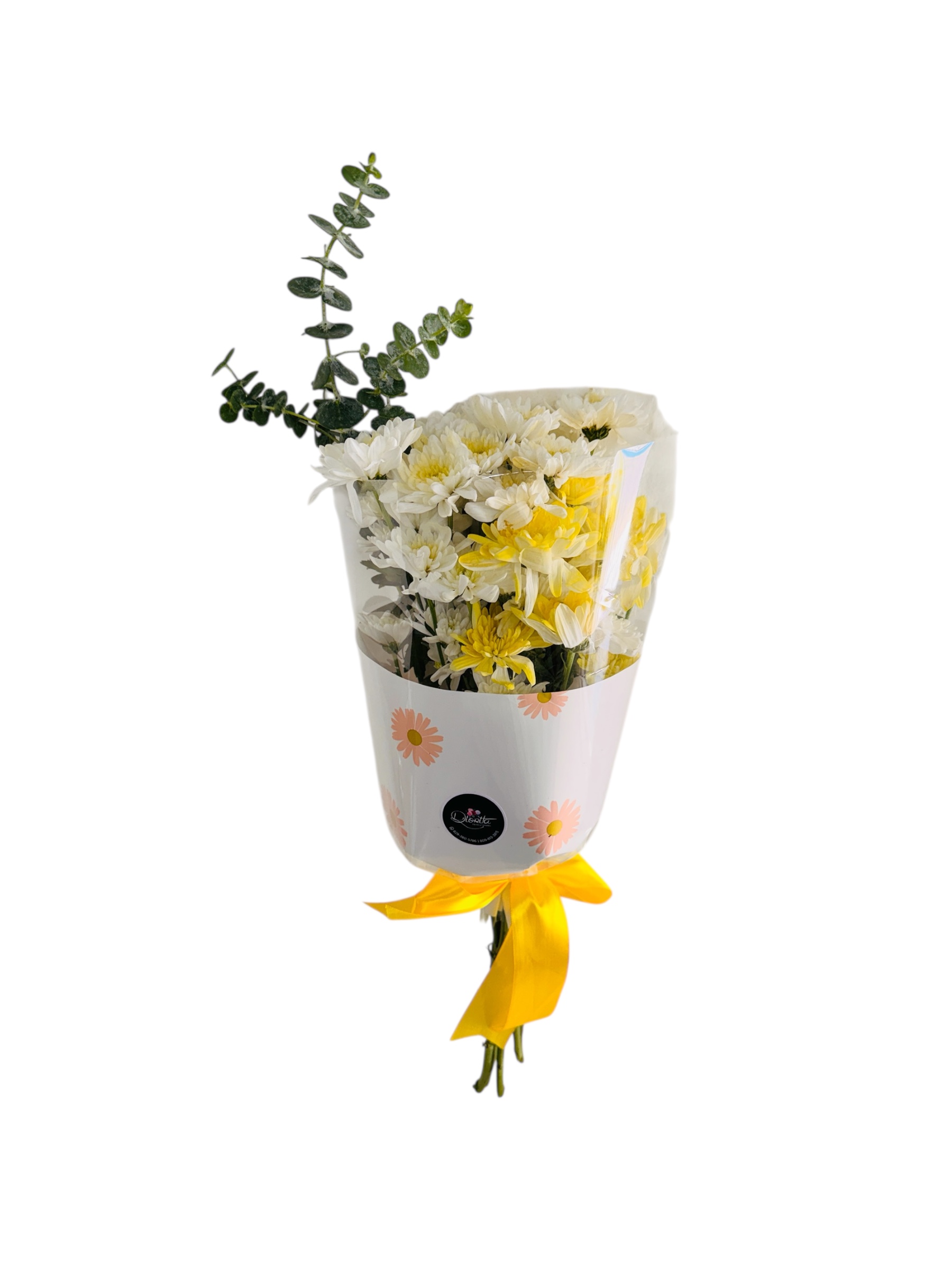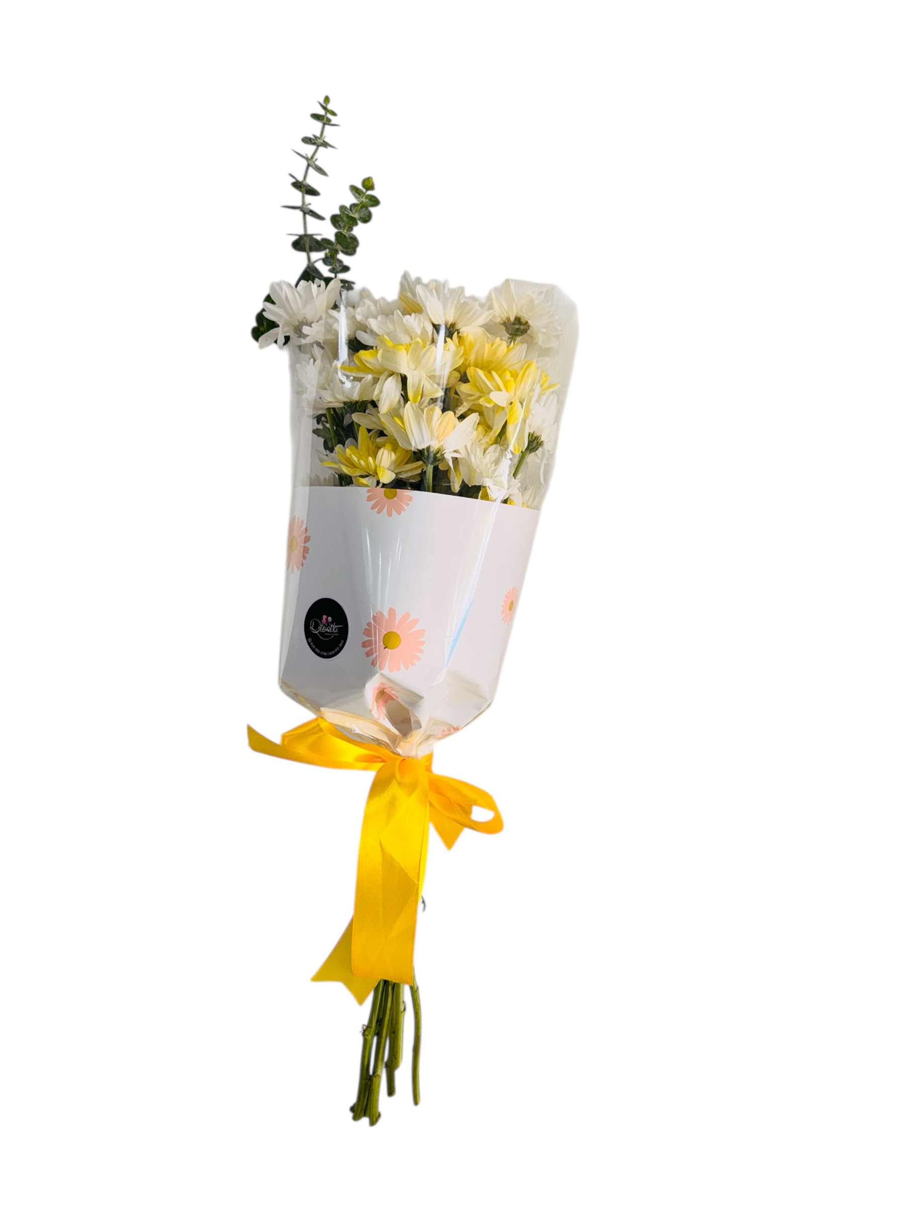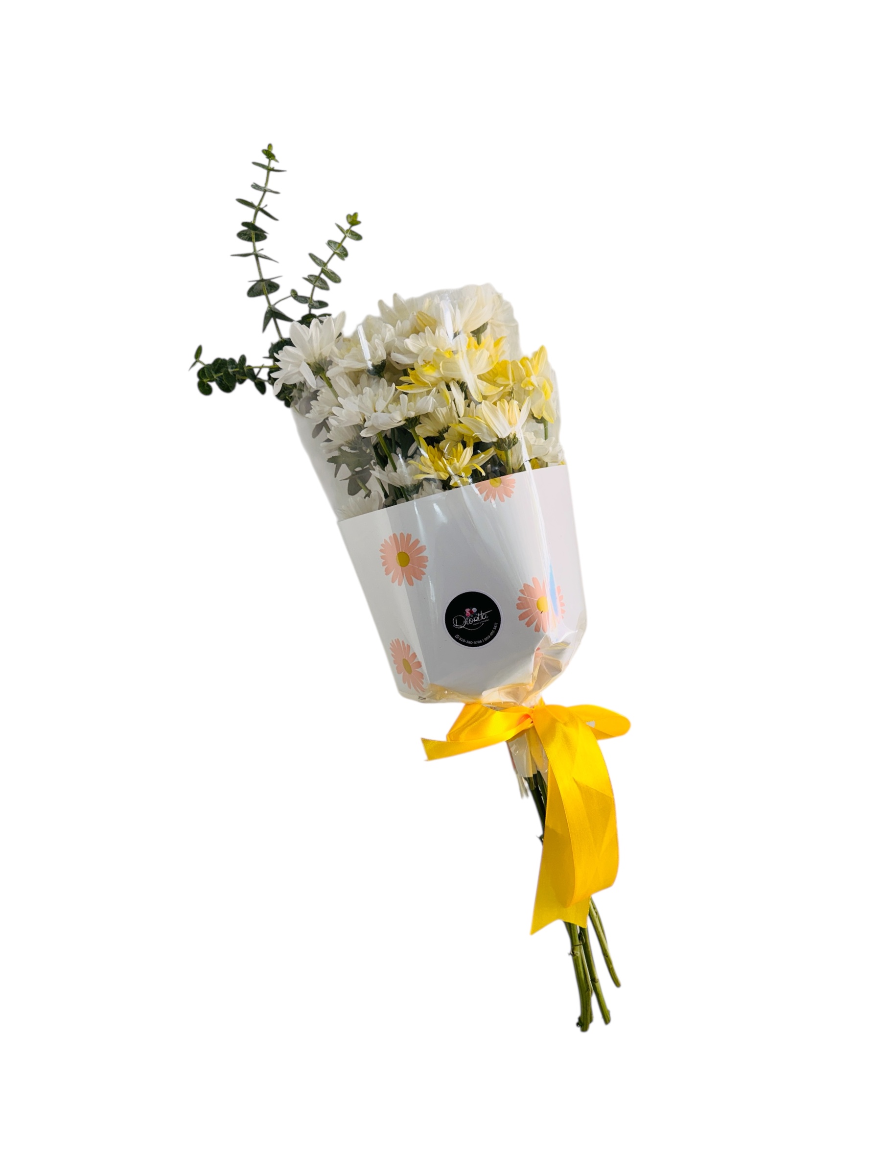 01 Porciones de pompones o margaritas con un detalle de eucalipto.(Variable a solicitud del cliente y sujeto a disponibilidad)