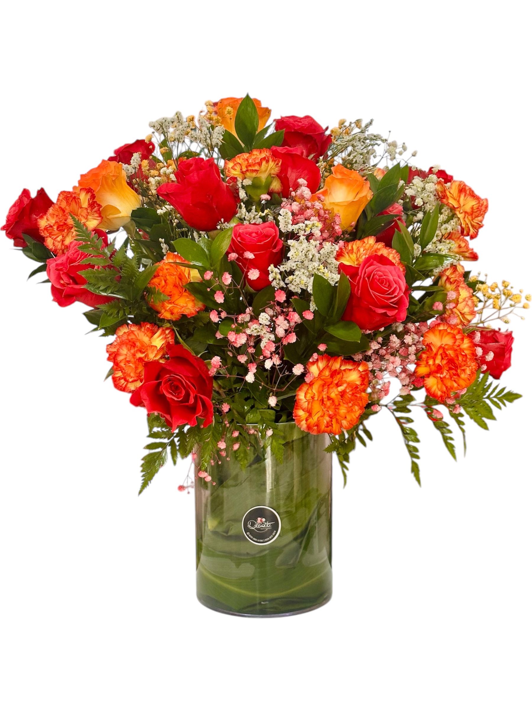 Este cautivador arreglo en un elegante florero de cristal es una celebración de color y textura, diseñado para iluminar cualquier espacio. Compuesto por claveles color naranja y rosas rojas, símbolo eterno del amor y la pasión. . Todo esto bordeado de dulces detalles de baby breath, ruscus y leather, que añaden una dimensión sin igual y una textura rica al arreglo.