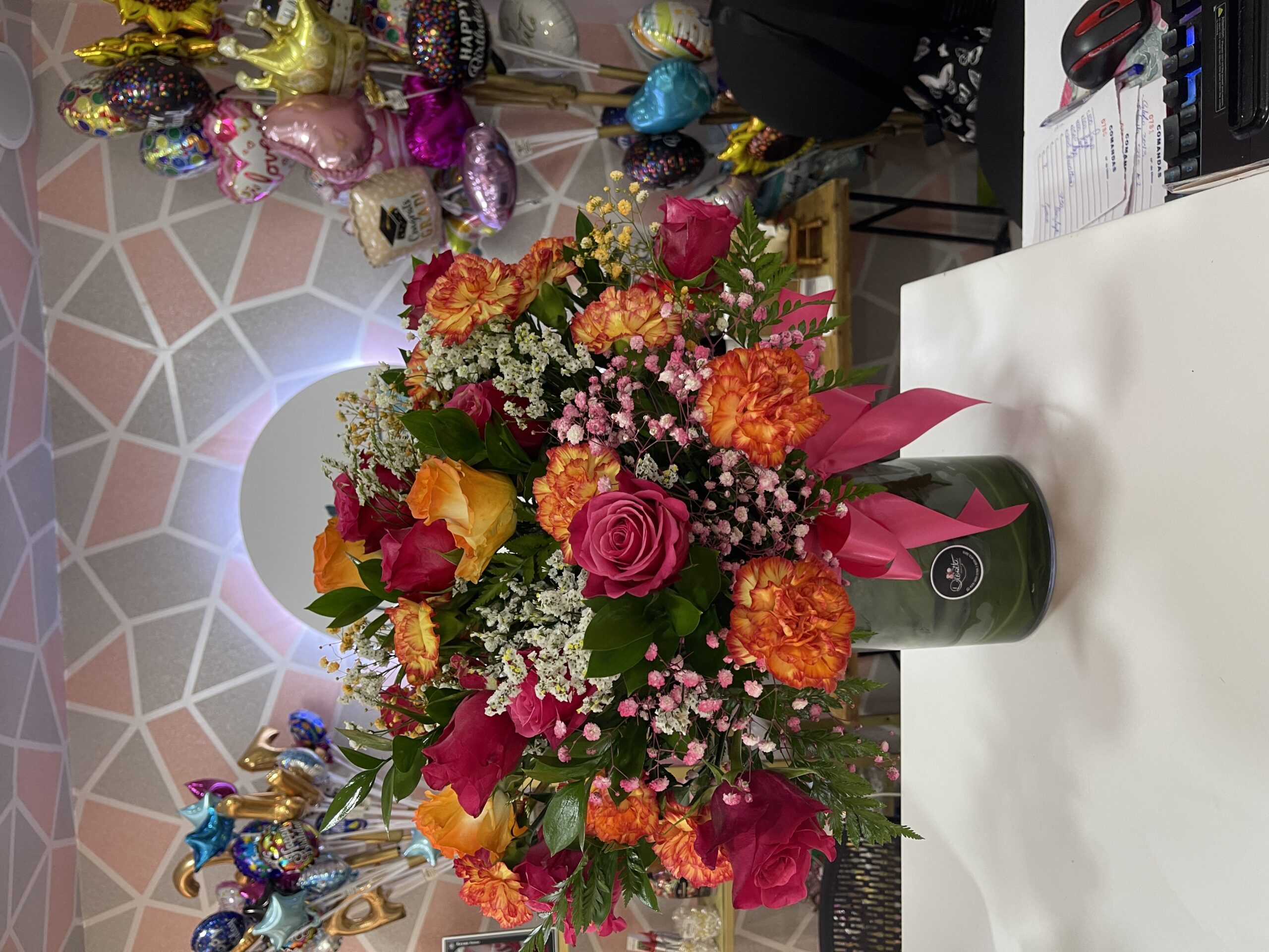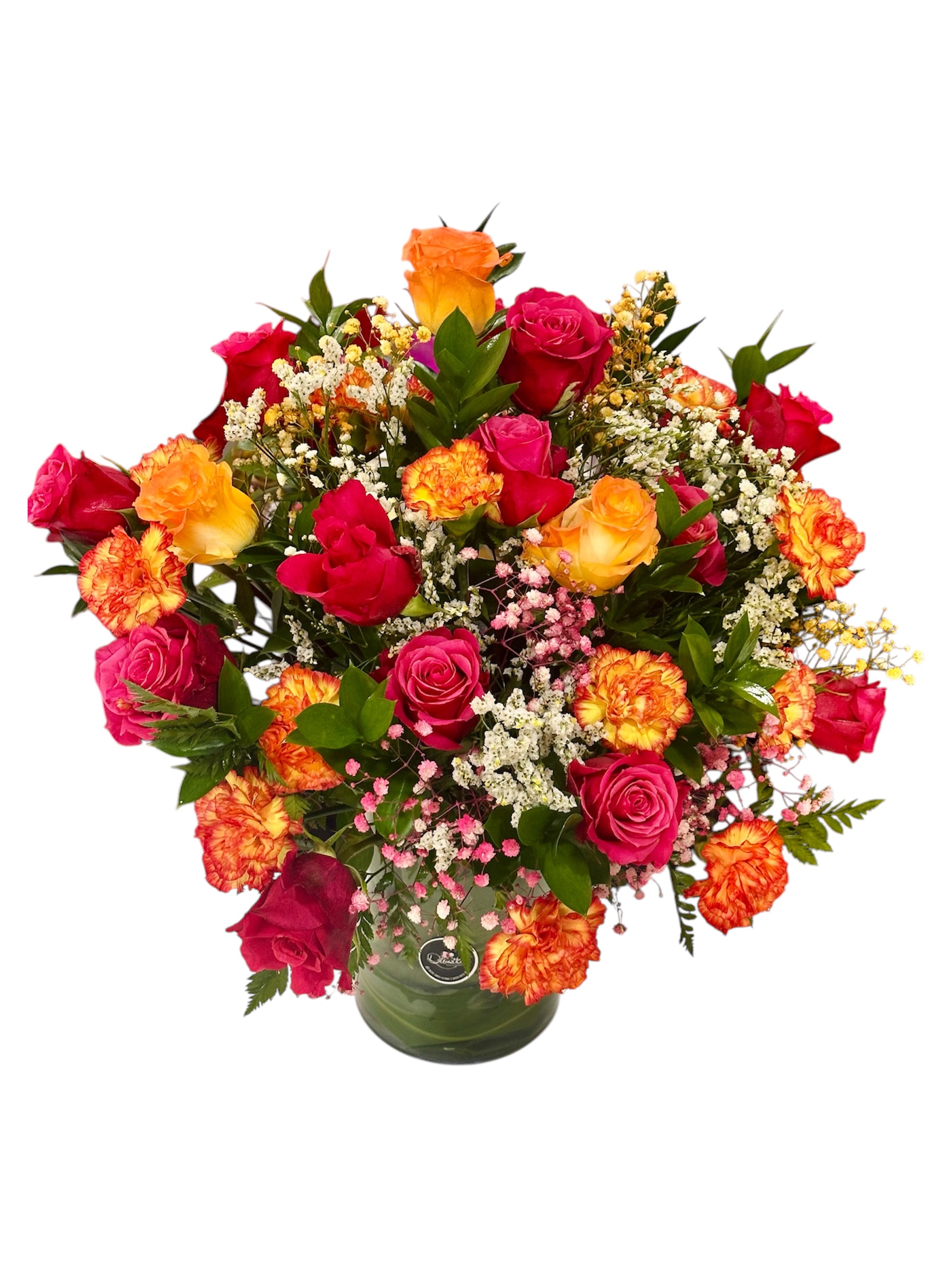 Este cautivador arreglo en un elegante florero de cristal es una celebracion de color y textura, diseñado para iluminar cualquier espacio. Compuesto por claveles color naranja, que aportan un toque vibrante y alegre, y rosas rojas, simbolo eterno del amor y la pasión. Este conjunto crea un contraste espectacular y seductor. Todo esto bordeado de dulces detalles de baby breath, ruscus y leather, que añaden una dimensión sin igual y una textura rica al arreglo.