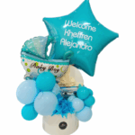 Sorprende con este tierno arreglo en suaves tonos azules y blancos, decorado con un adorable elefantito de peluche y delicados detalles en cintas. Ideal para dar la bienvenida a un bebé, decorar su habitación o regalar en un baby shower. ¡Un detalle lleno de dulzura y amor!