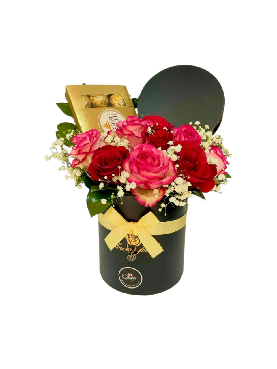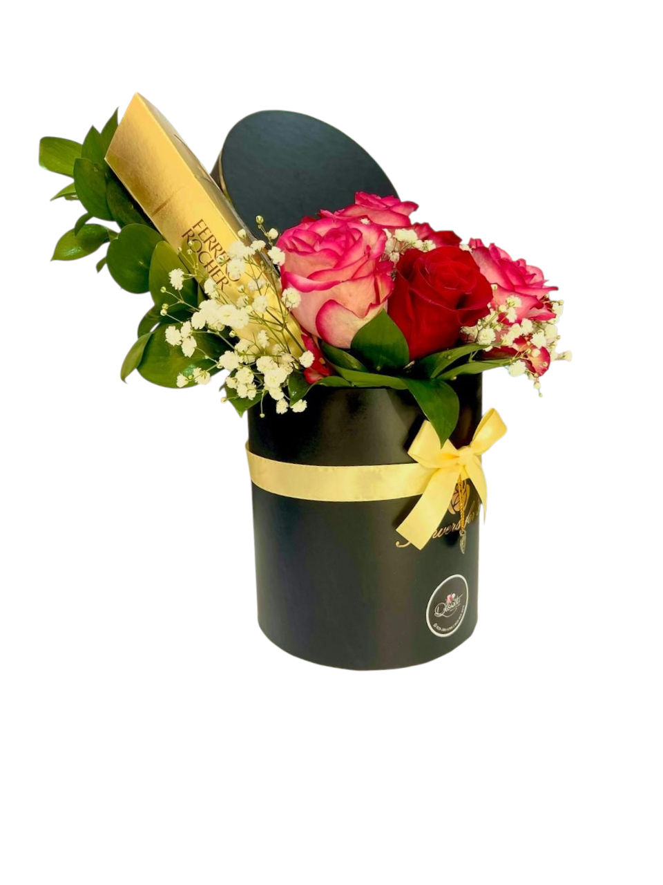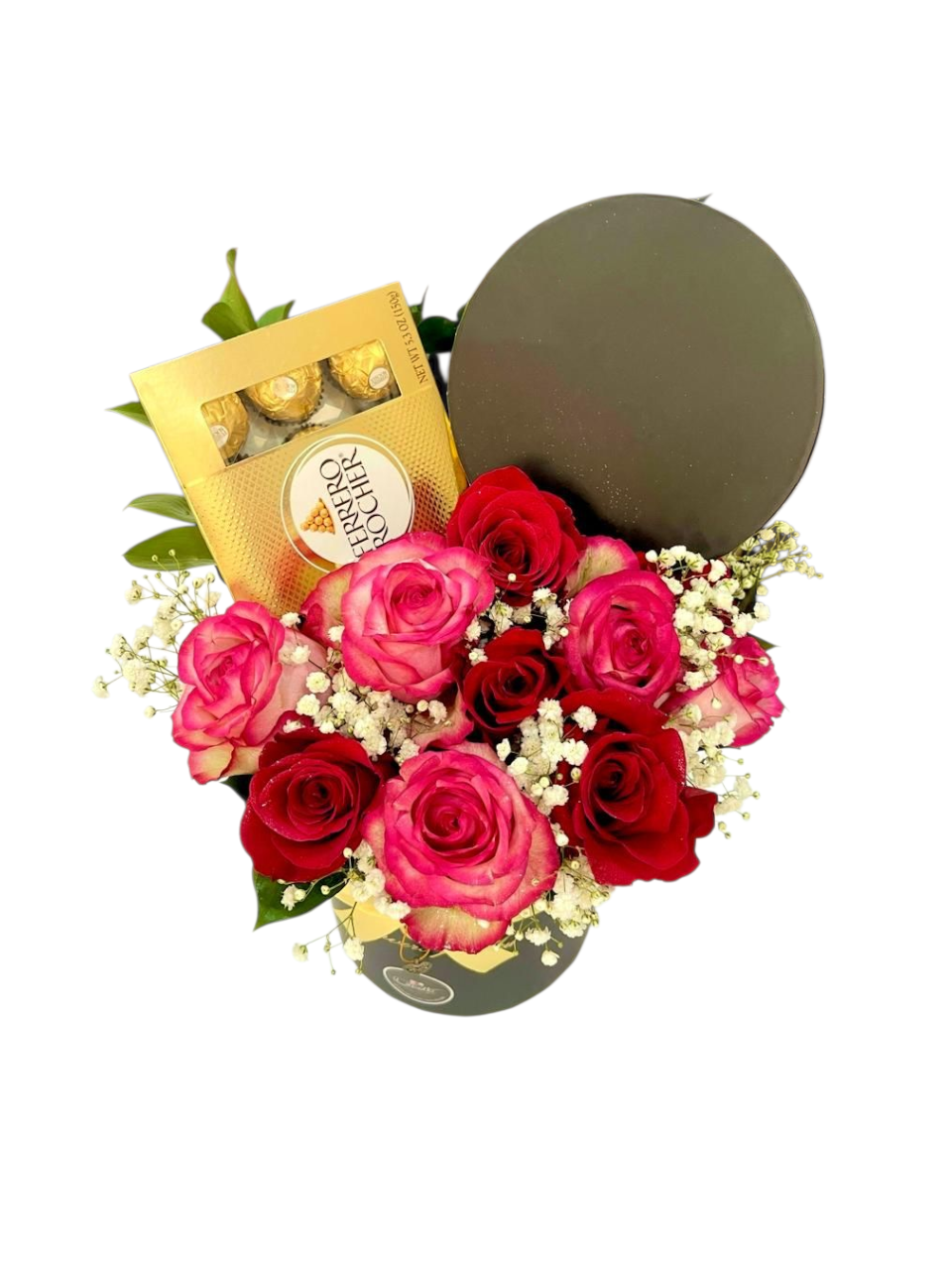 Un regalo que combina dulzura y elegancia: rosas frescas acompañadas de baby breath, ruscus y una deliciosa caja de bombones Ferrero.