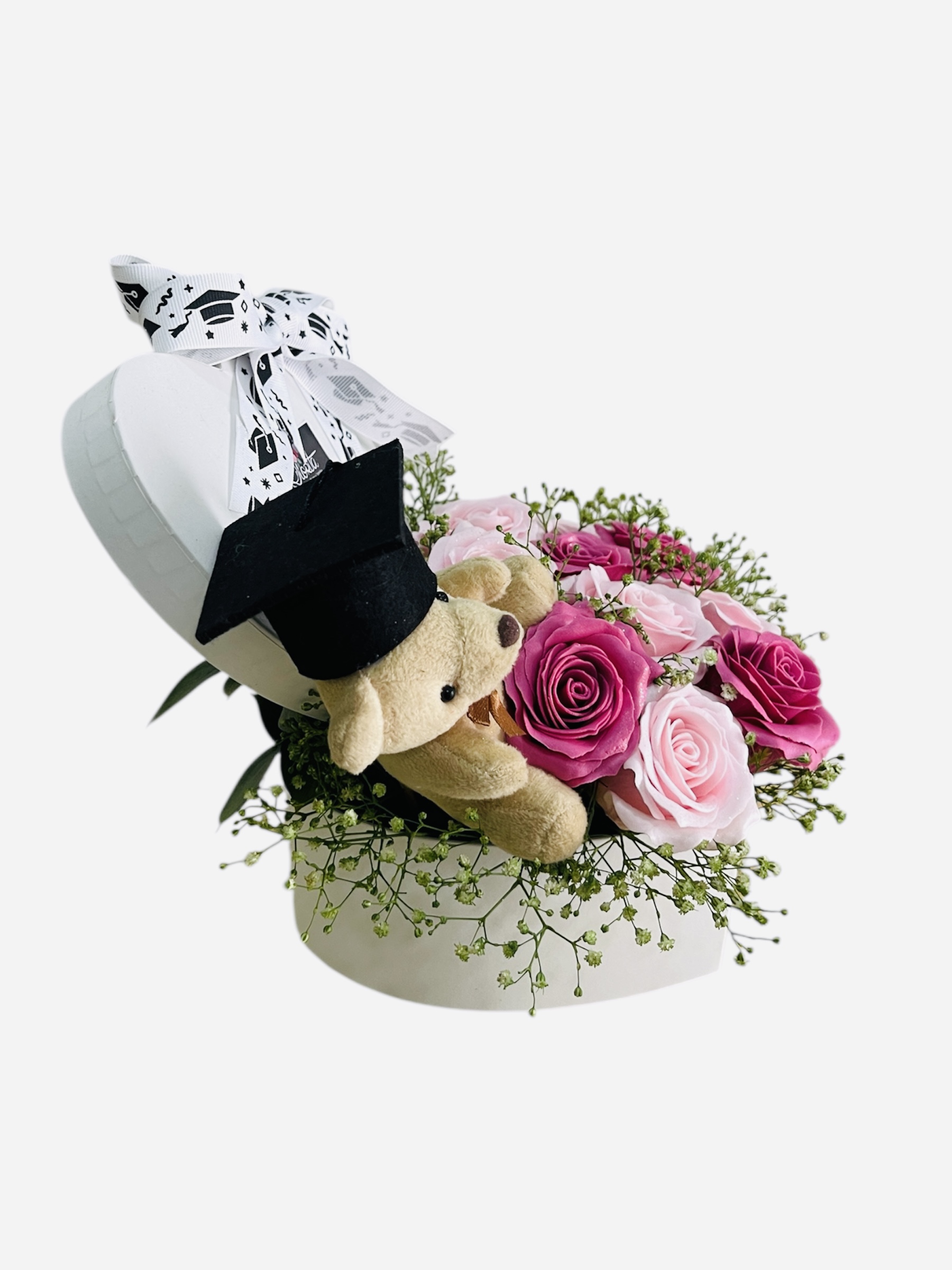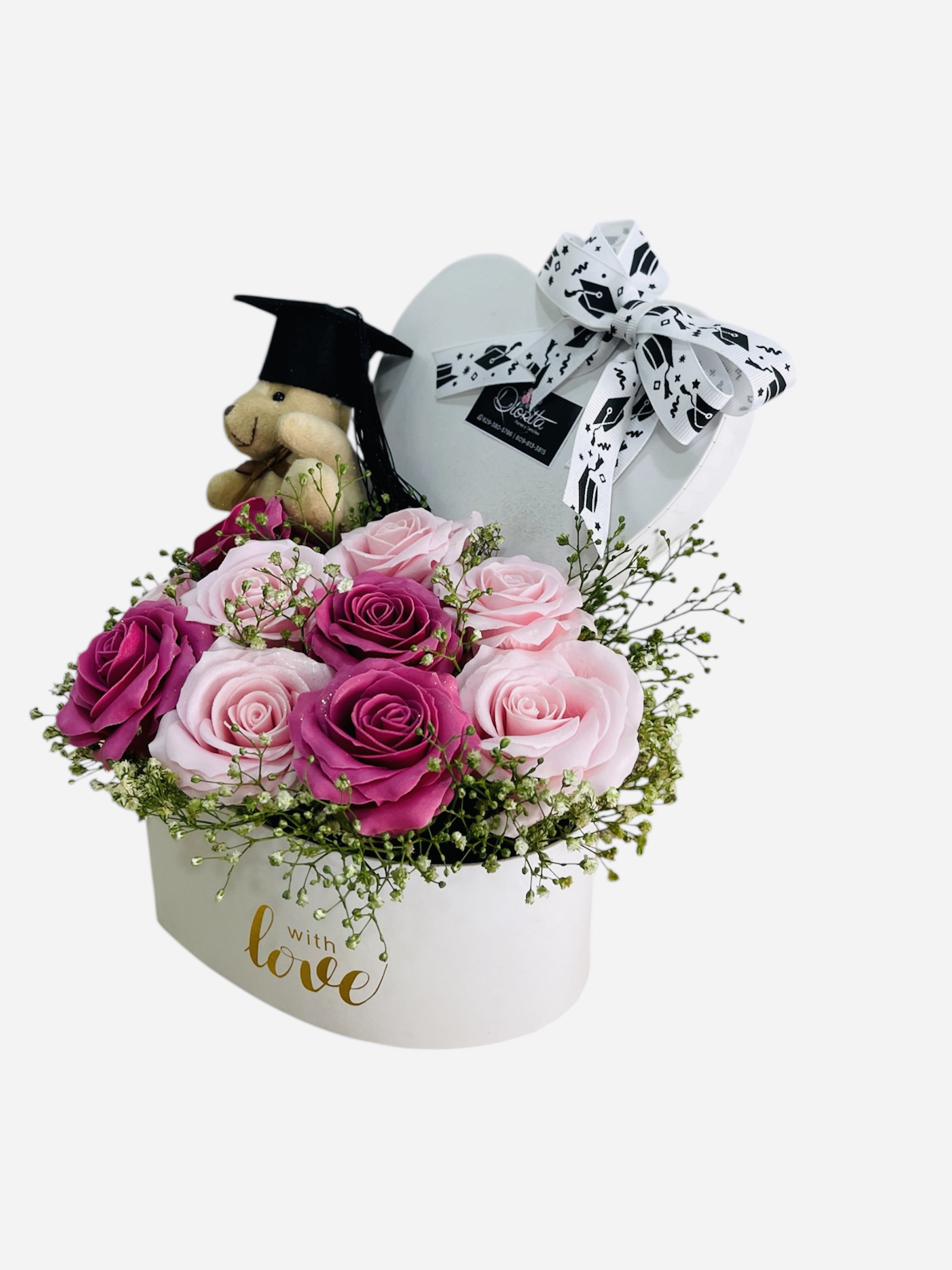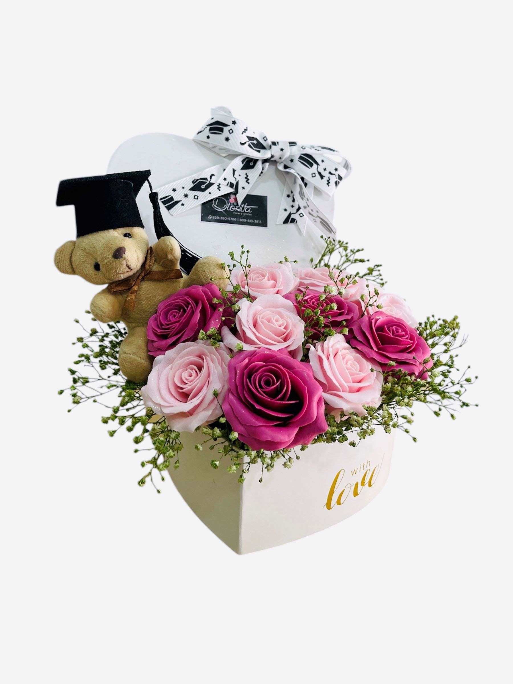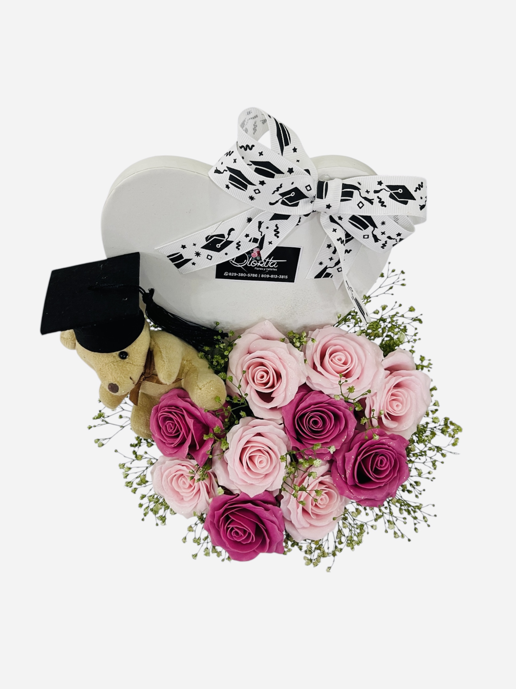 Celebra los logros con amor: nuestro arreglo en caja con forma de corazón combina elegantes rosas permanentes en tonos rosado y fucsia, acompañado de un tierno osito con birrete. El detalle perfecto para graduaciones llenas de cariño y orgullo.