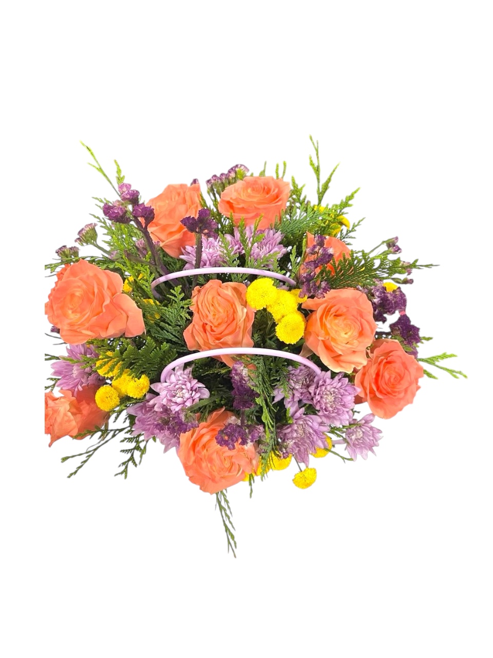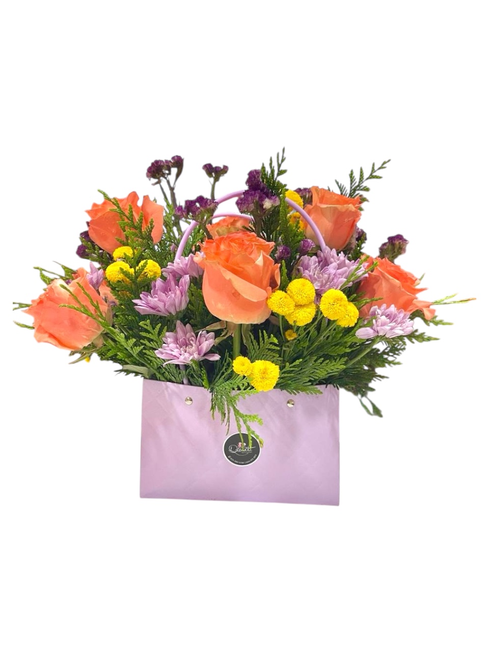 Un bolso floral en tonos lila y naranja con flores vibrantes y frescas. Ideal para regalar felicidad en forma de flores y celebrar con un detalle lleno de encanto.