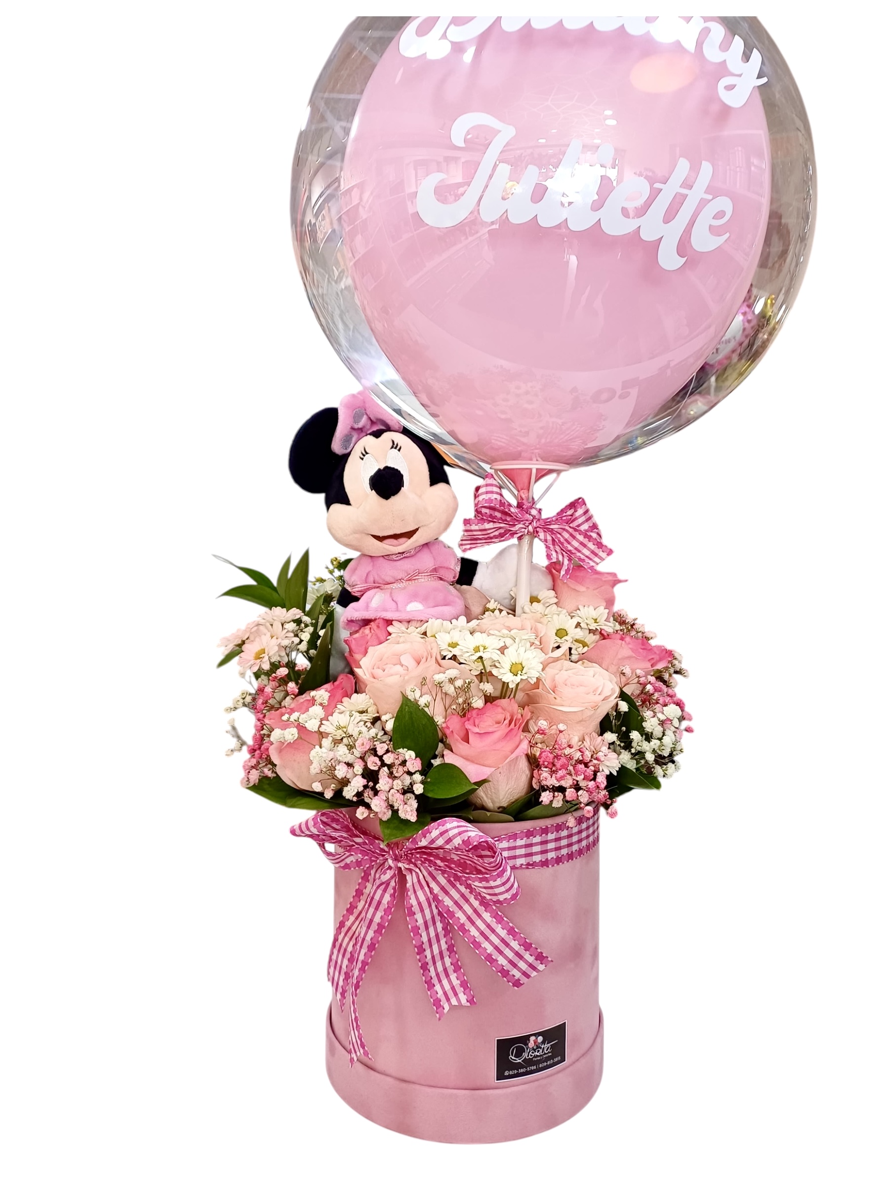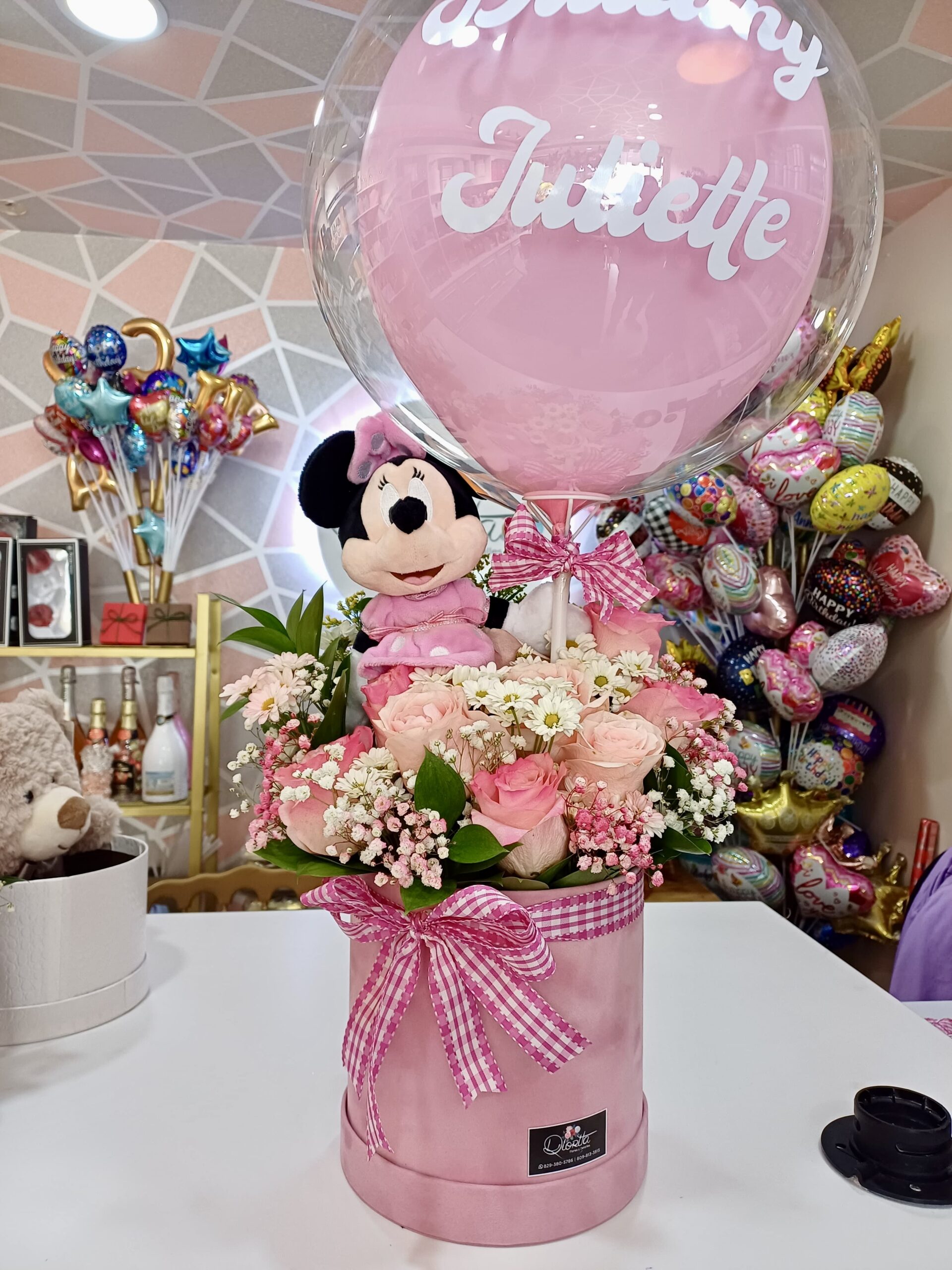 Precioso detalle elaborado en caja redonda con rosas, baby breath y ruscus; y el detalla del mini peluche Minnie Mouse.