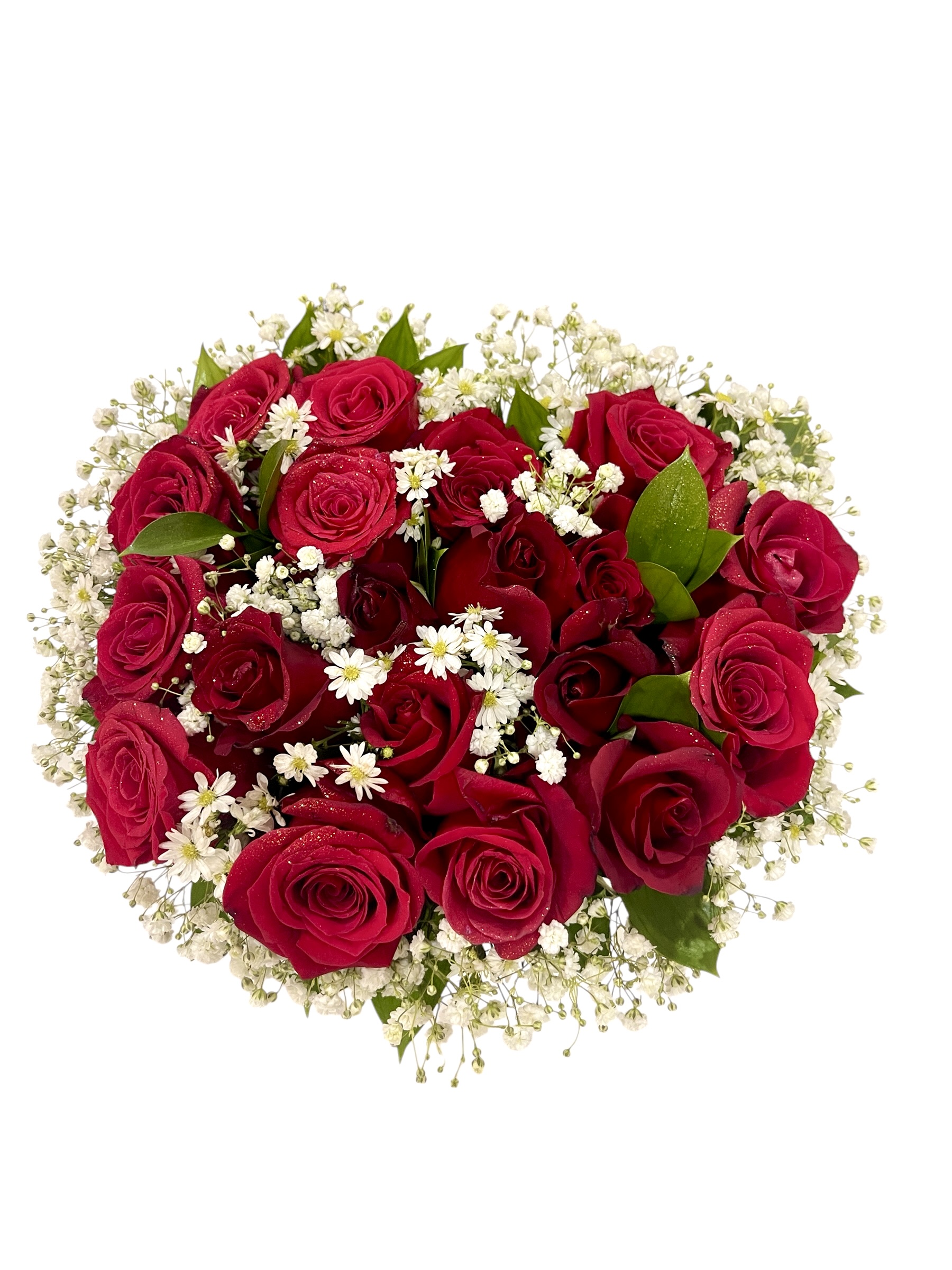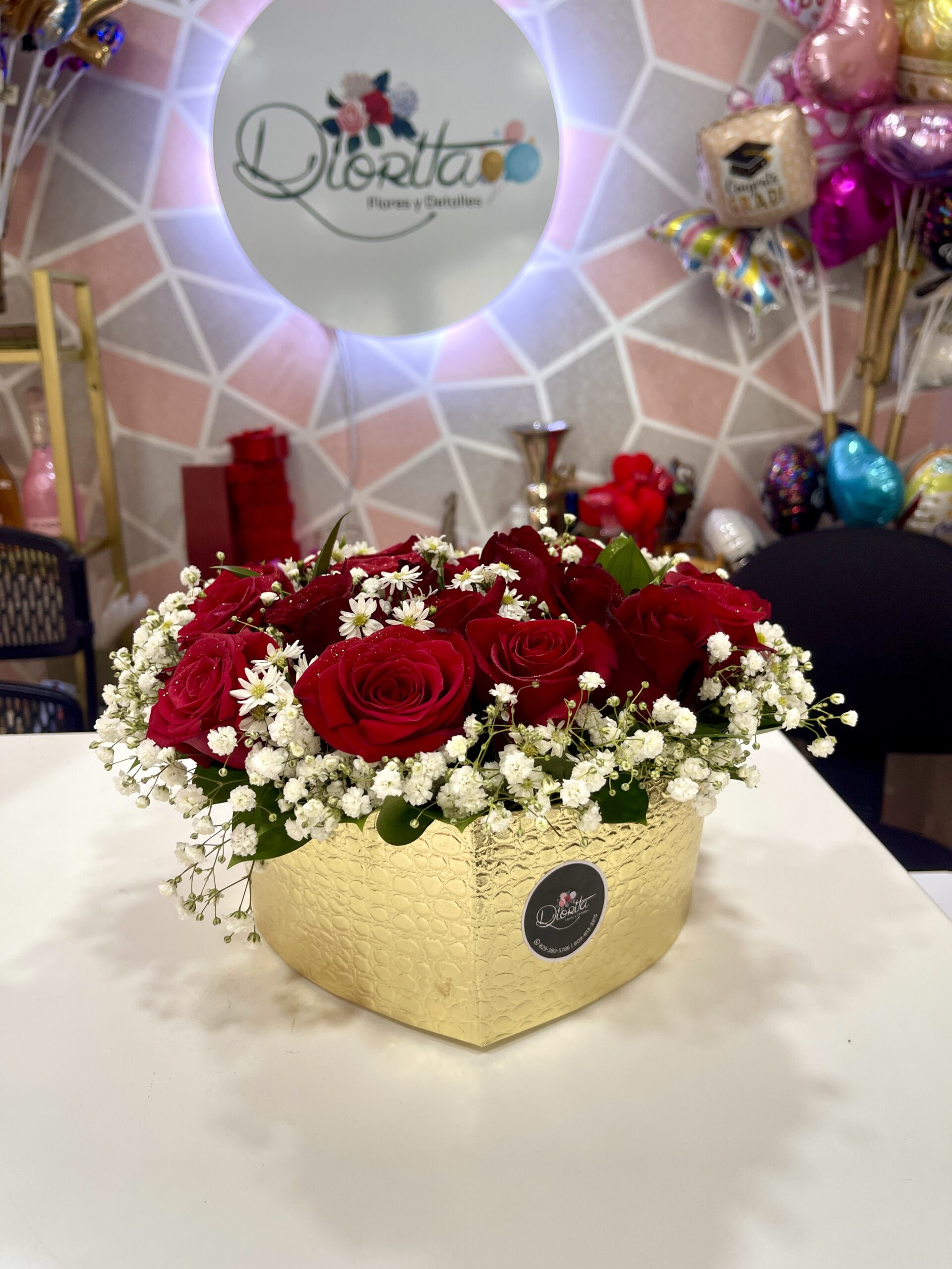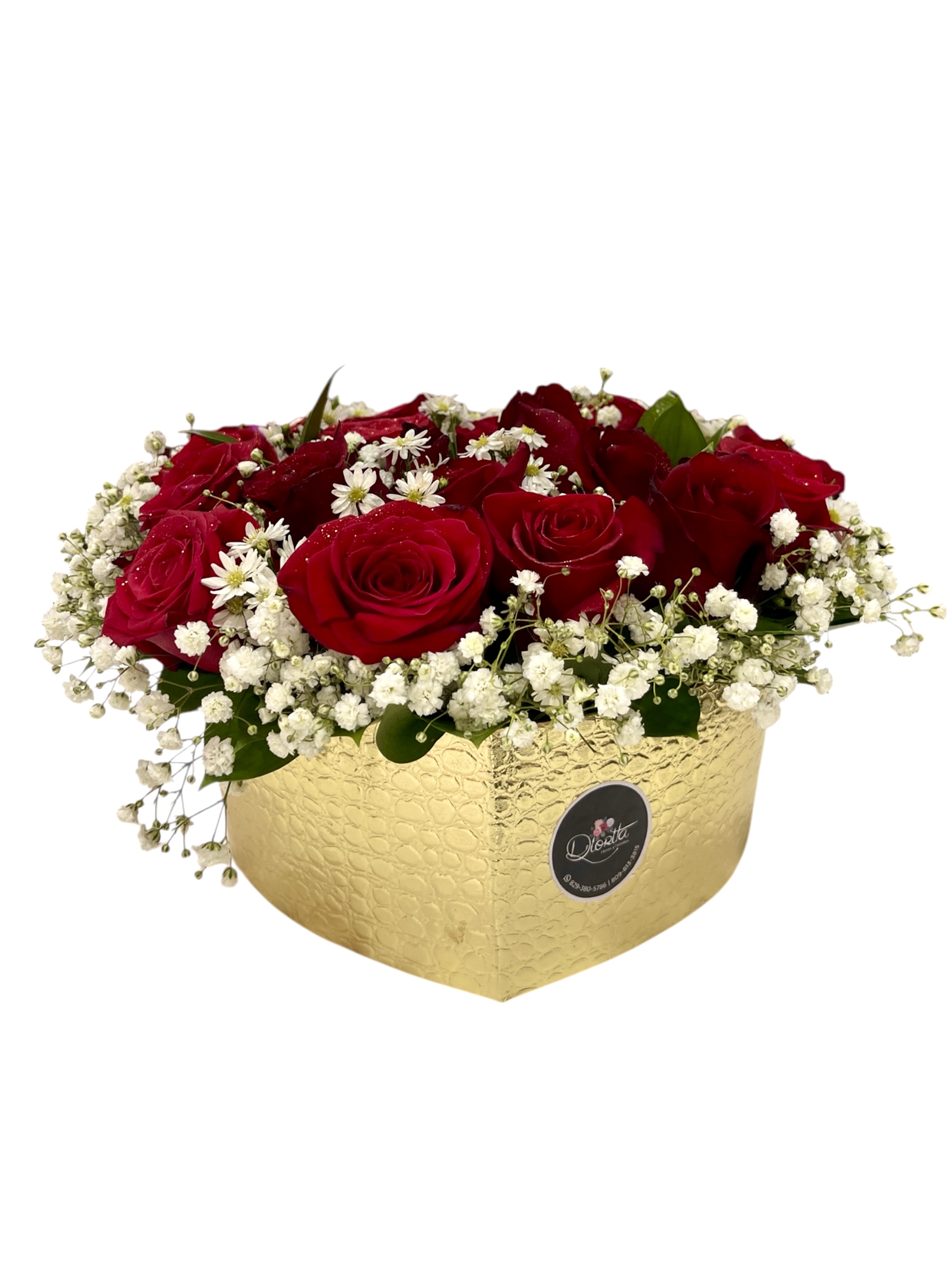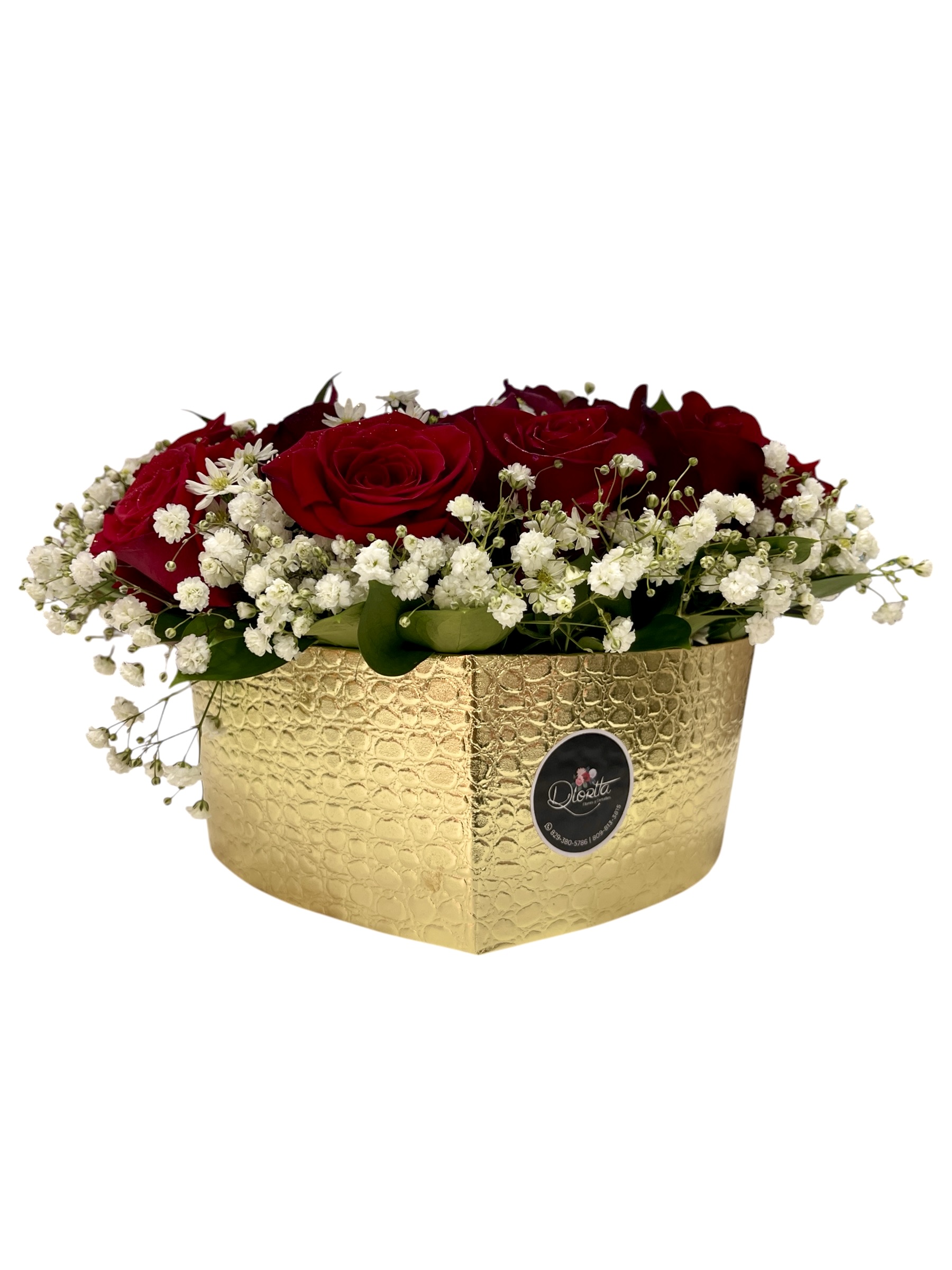 Fabuloso arreglo de rosas rojas bordeadas de baby breath y sonrío, posando en preciosa base dorada forma corazón.