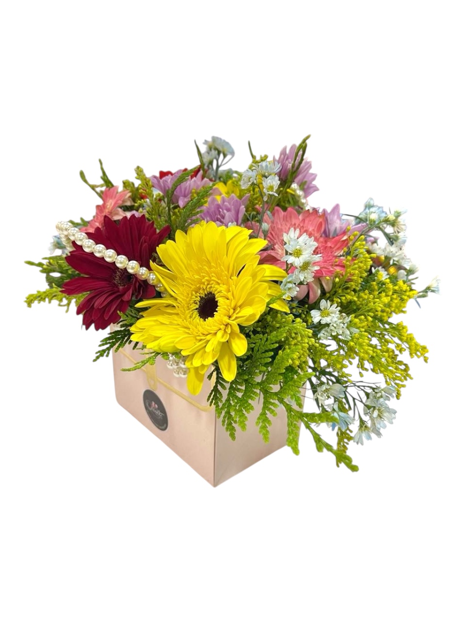 Un elegante bolso floral con asa de perlas y gerberas en tonos vibrantes. Un regalo alegre, femenino y sofisticado para celebrar con estilo.