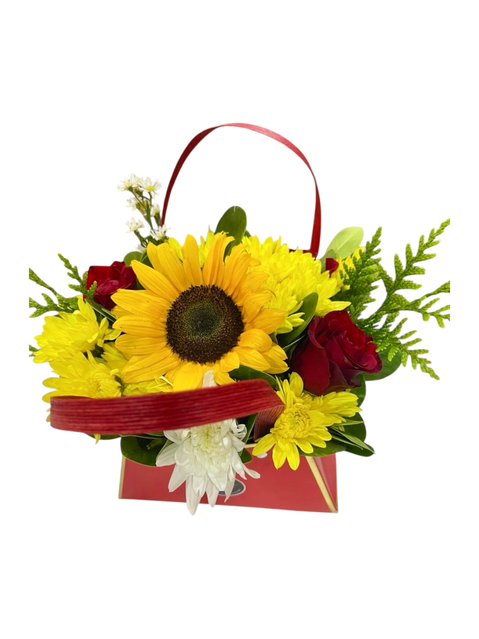 Un bolso floral con flores radiantes y un toque de elegancia. Su empaque rojo vibrante y girasol central lo hacen ideal para sorprender con fuerza, alegría y color.