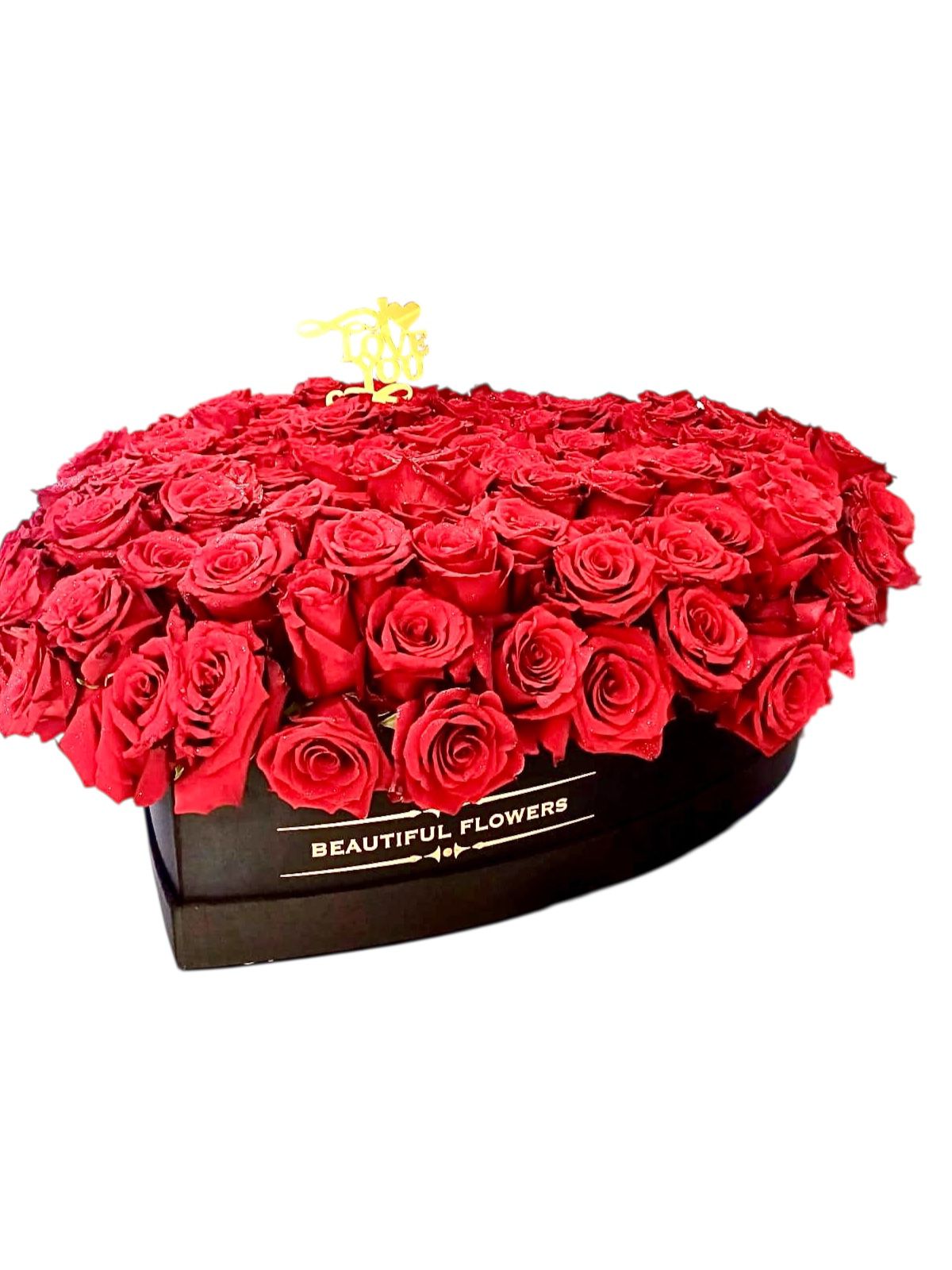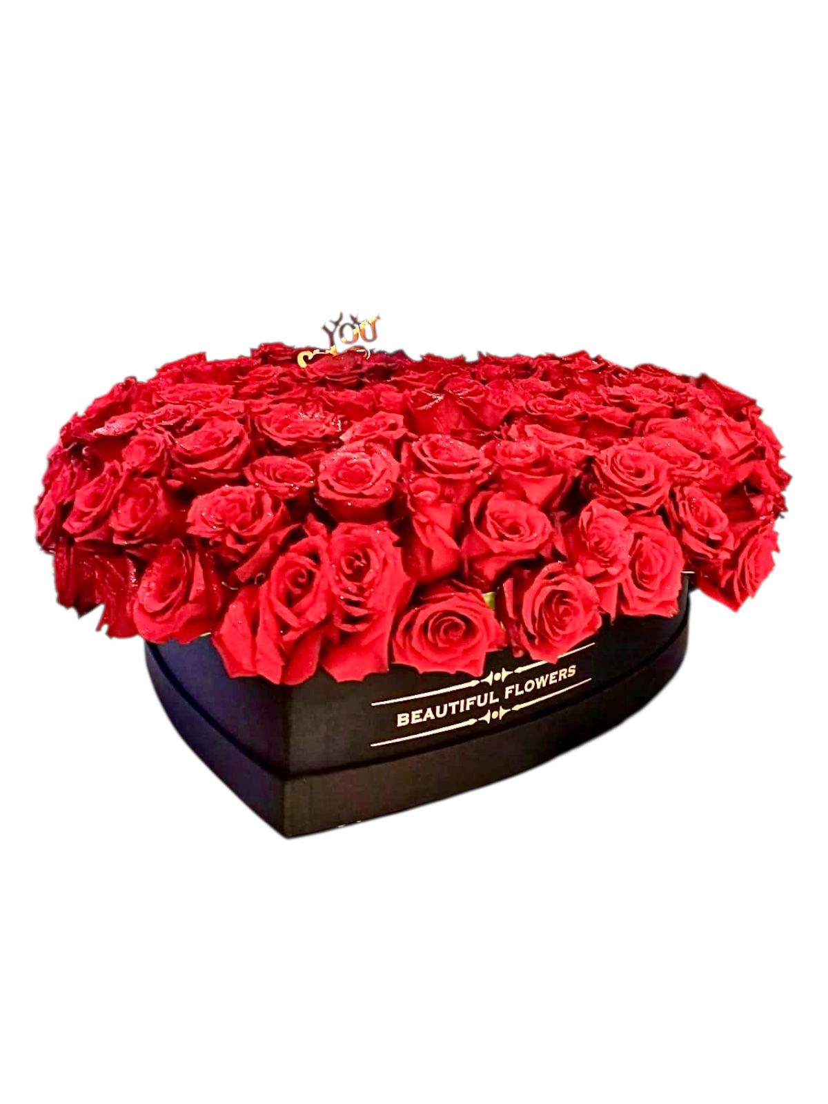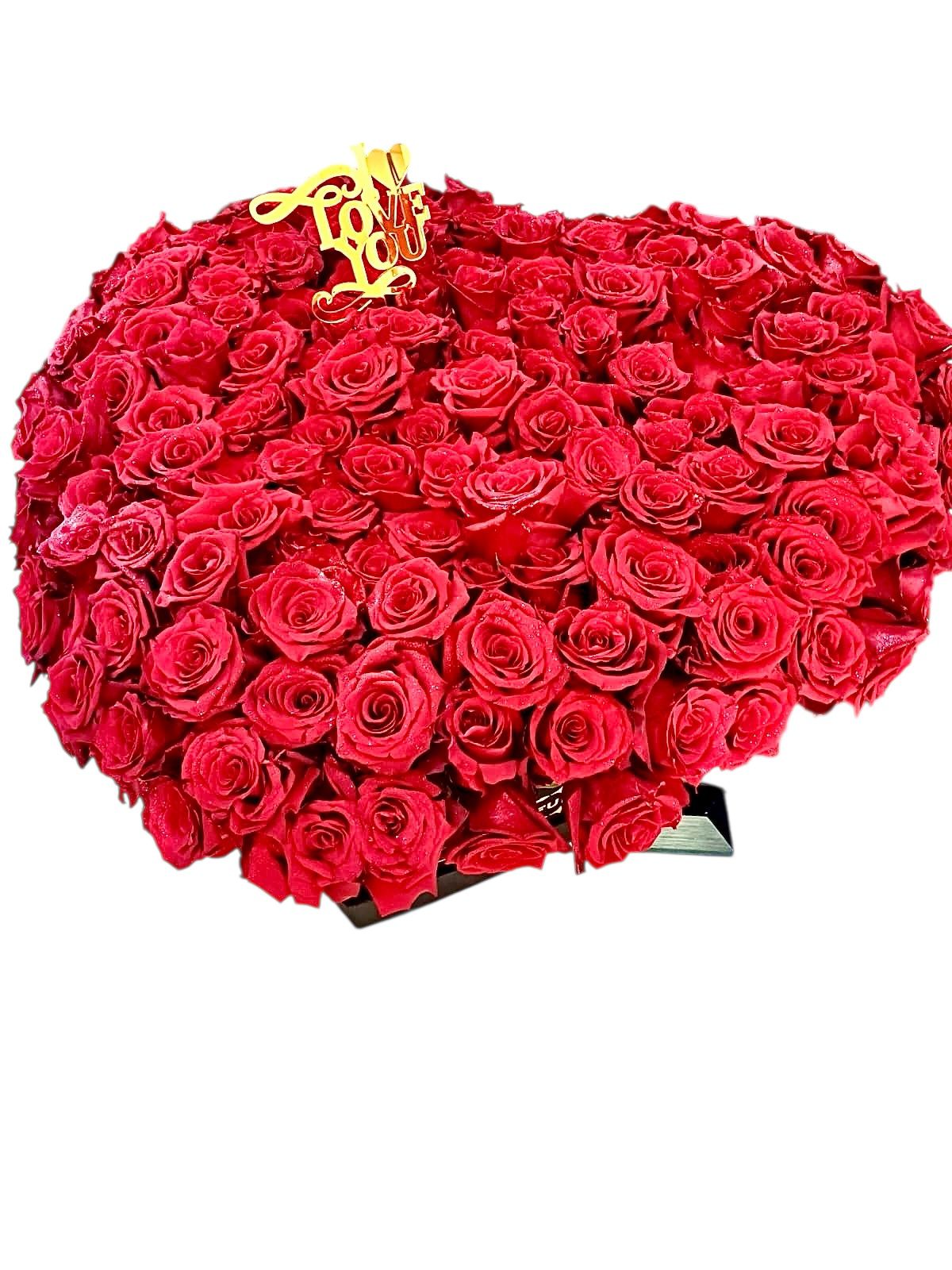 Una obra maestra de intensas rosas rojas. Diseñado para quienes aman sin medida, creado para quienes merecen lo mejor, un corazón de rosas que redefine la palabra romance.