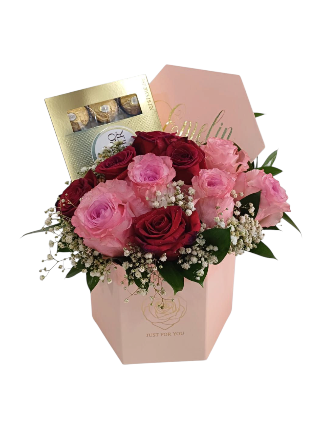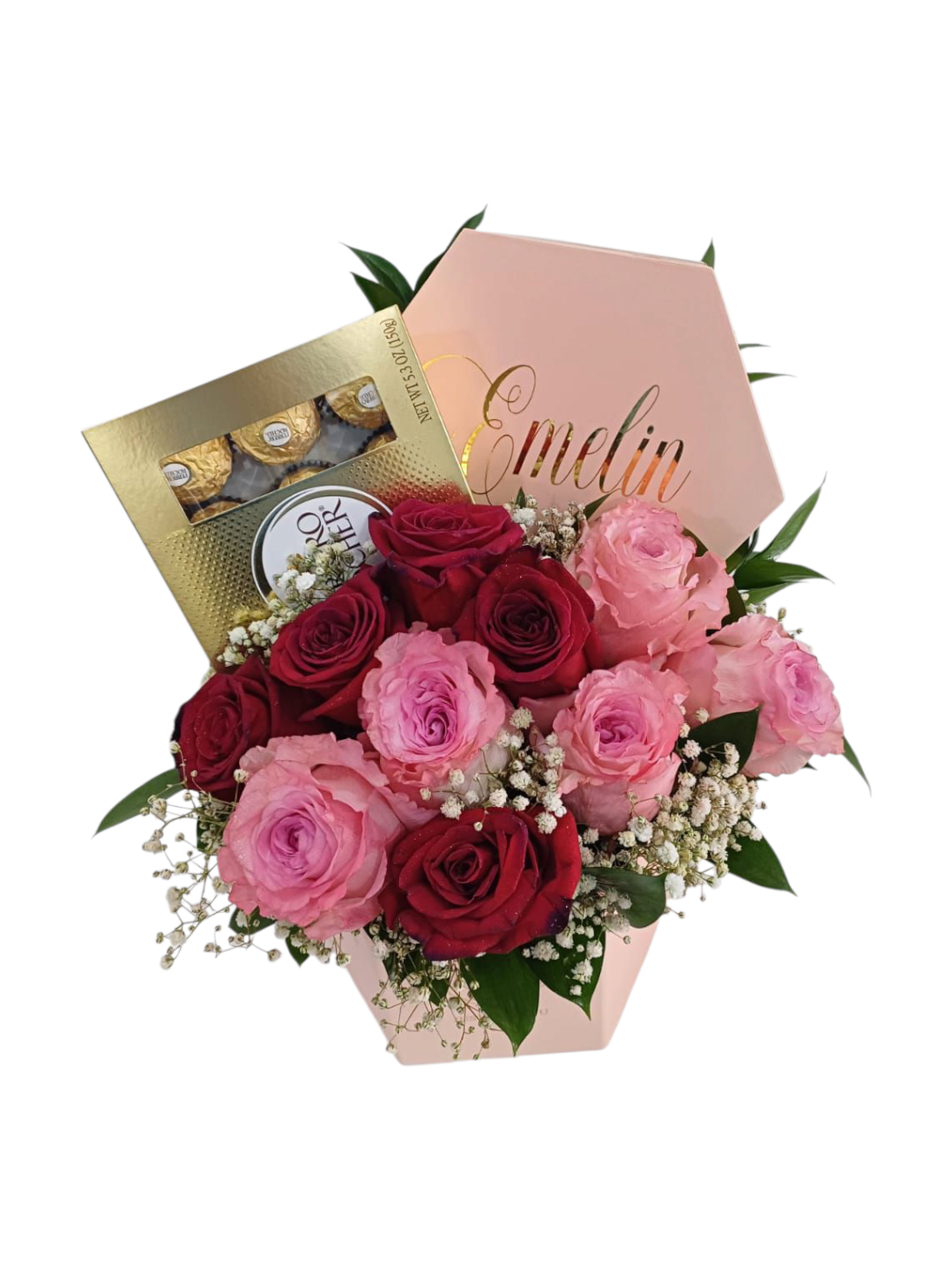 Un regalo que combina dulzura y elegancia: rosas frescas acompañadas de baby breath, ruscus y una deliciosa caja de bombones Ferrero Rocher. Presentado con un detalle personalizado que lo hace único y perfecto para conquistar corazones.
