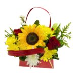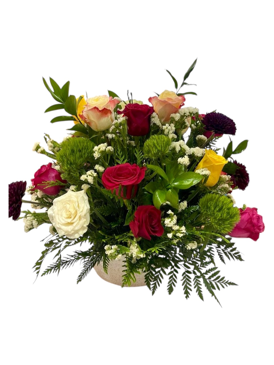 Arreglo vibrante y elegante con rosas y flores mixtas en tonos intensos y suaves. Presentado en base de cerámica, ideal para expresar amor, gratitud o celebrar momentos especiales con un detalle lleno de color y frescura.