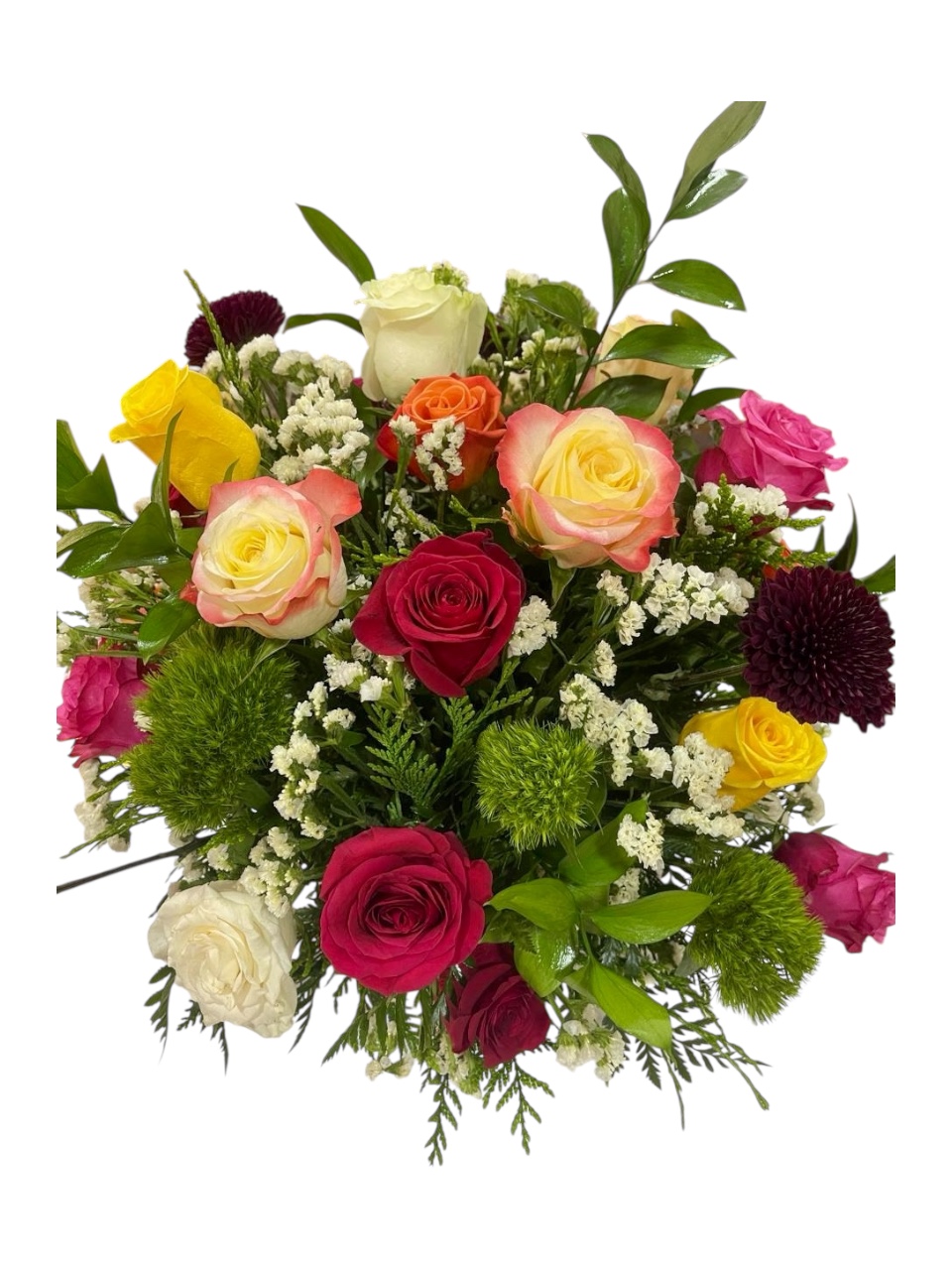 Arreglo vibrante y elegante con rosas y flores mixtas en tonos intensos y suaves.