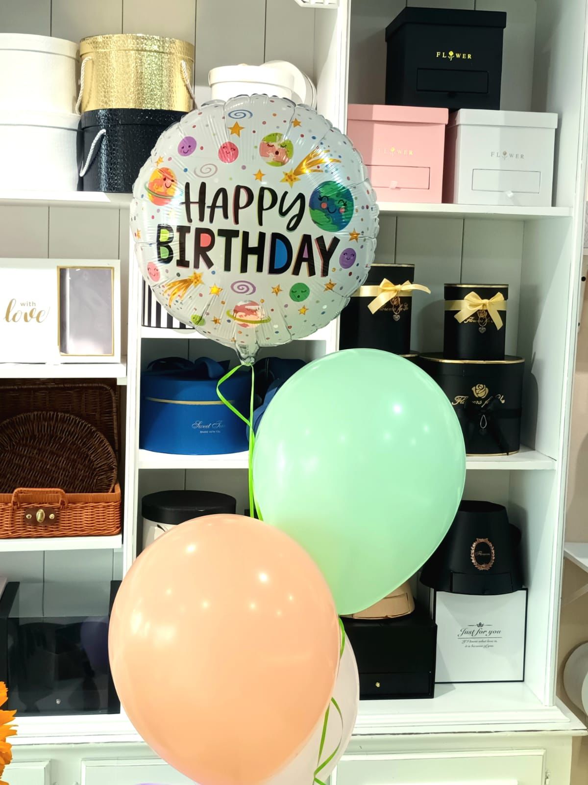 Celebra con estilo este cumpleaños: un globo metálico con divertidos planetas y globos pastel en melón y verde menta. ¡Perfecto para decorar y regalar!