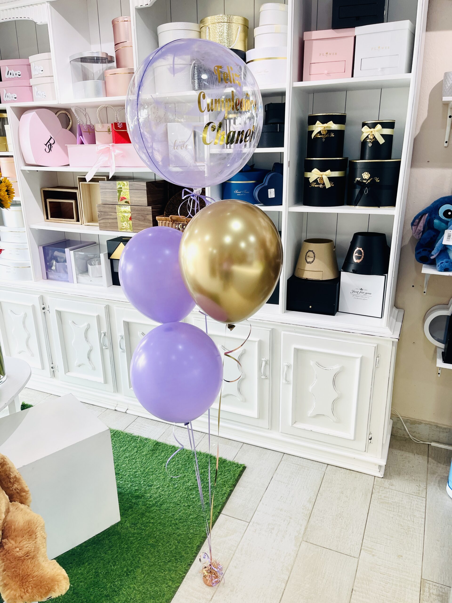 Precioso bonche compuesto por tres coloridos globos latex, combinado con un fabuloso globo burbuja con siluetas plumas; Y el detalle de la personalización del globo. Listo para festejar.
