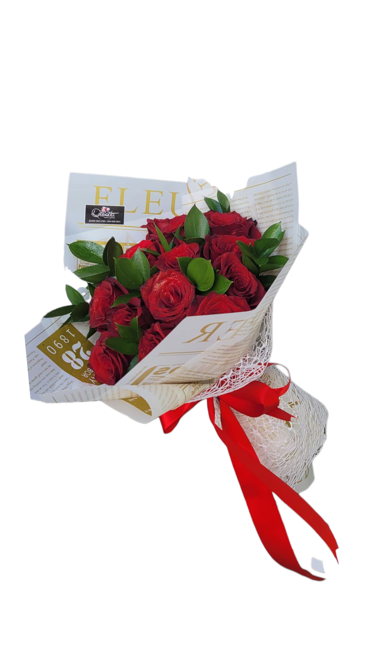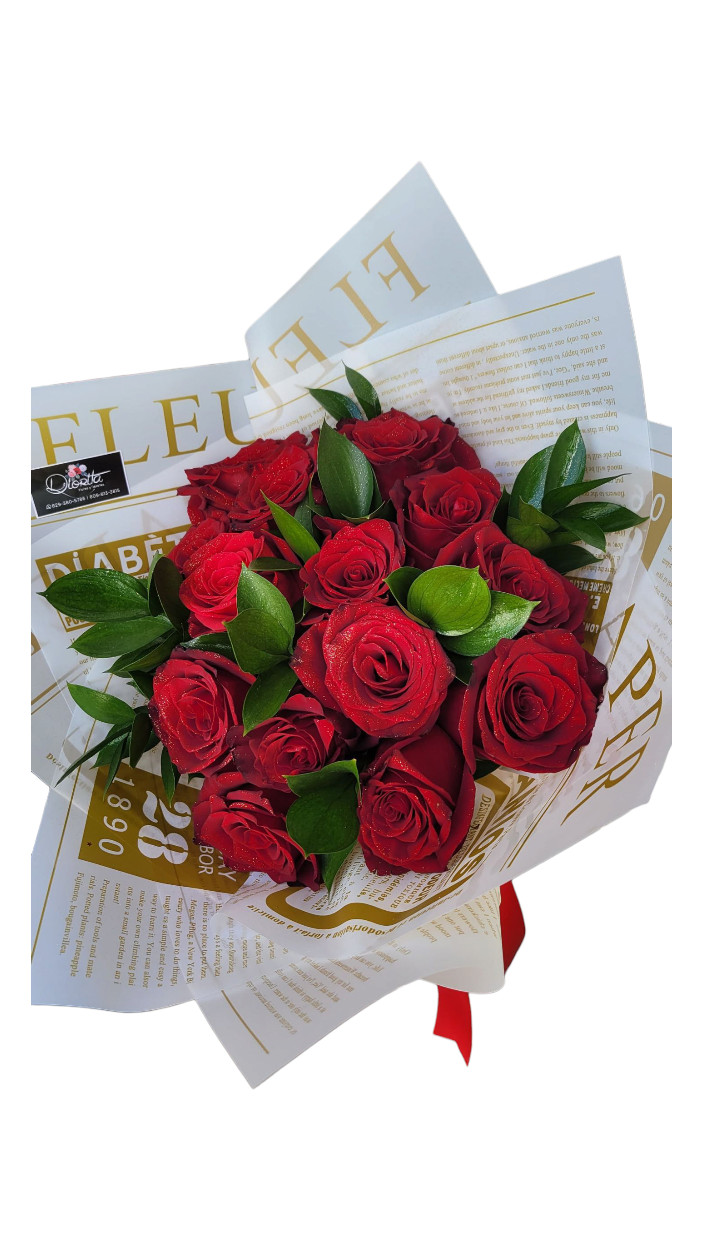 Envueltas en elegancia, trece rosas rojas vibrantes se entrelazan con ramas de ruscus fresco, creando un equilibrio perfecto entre pasión y sofisticación.