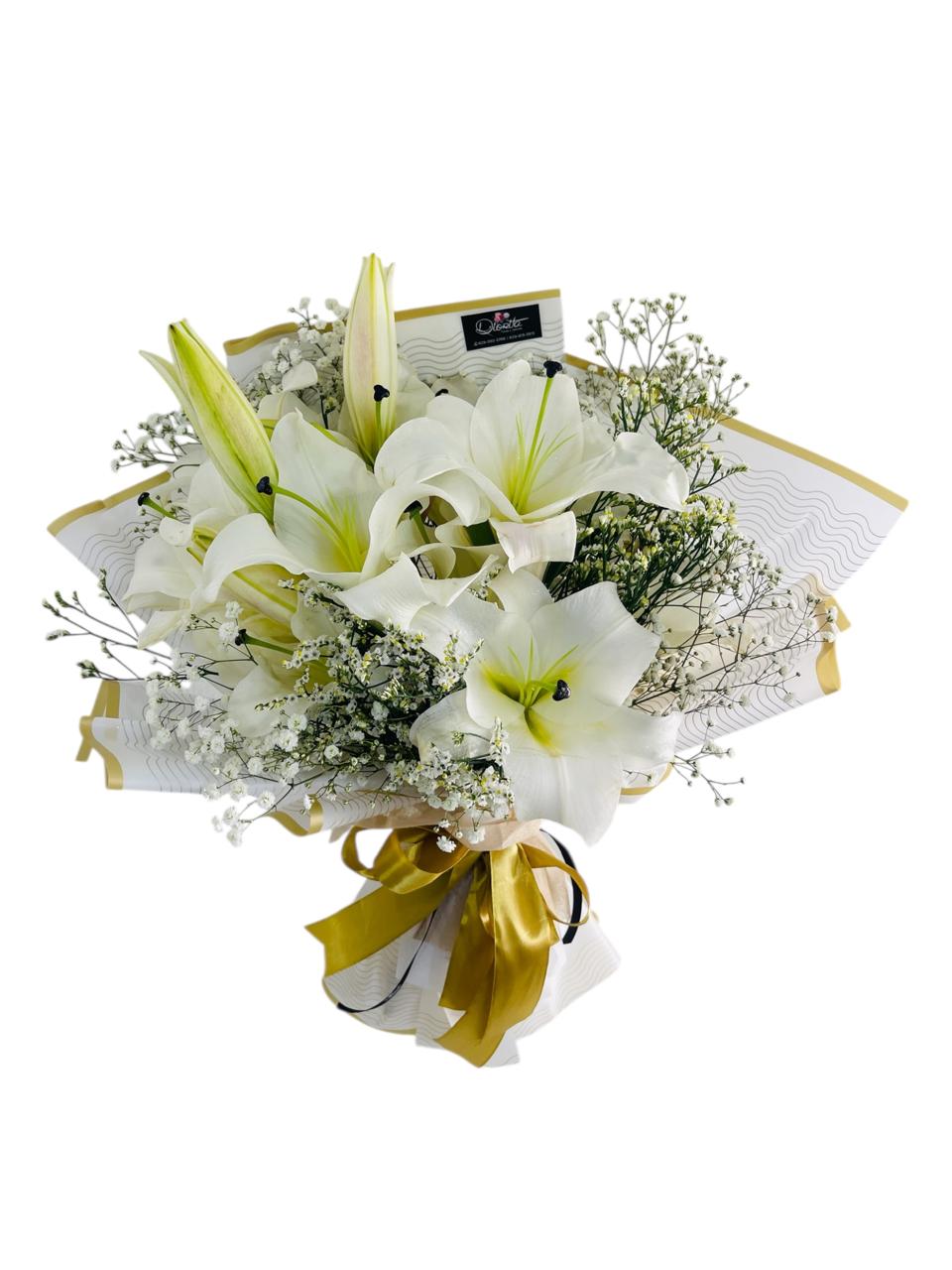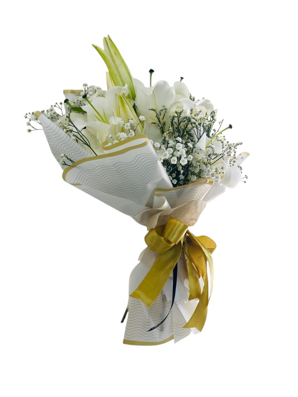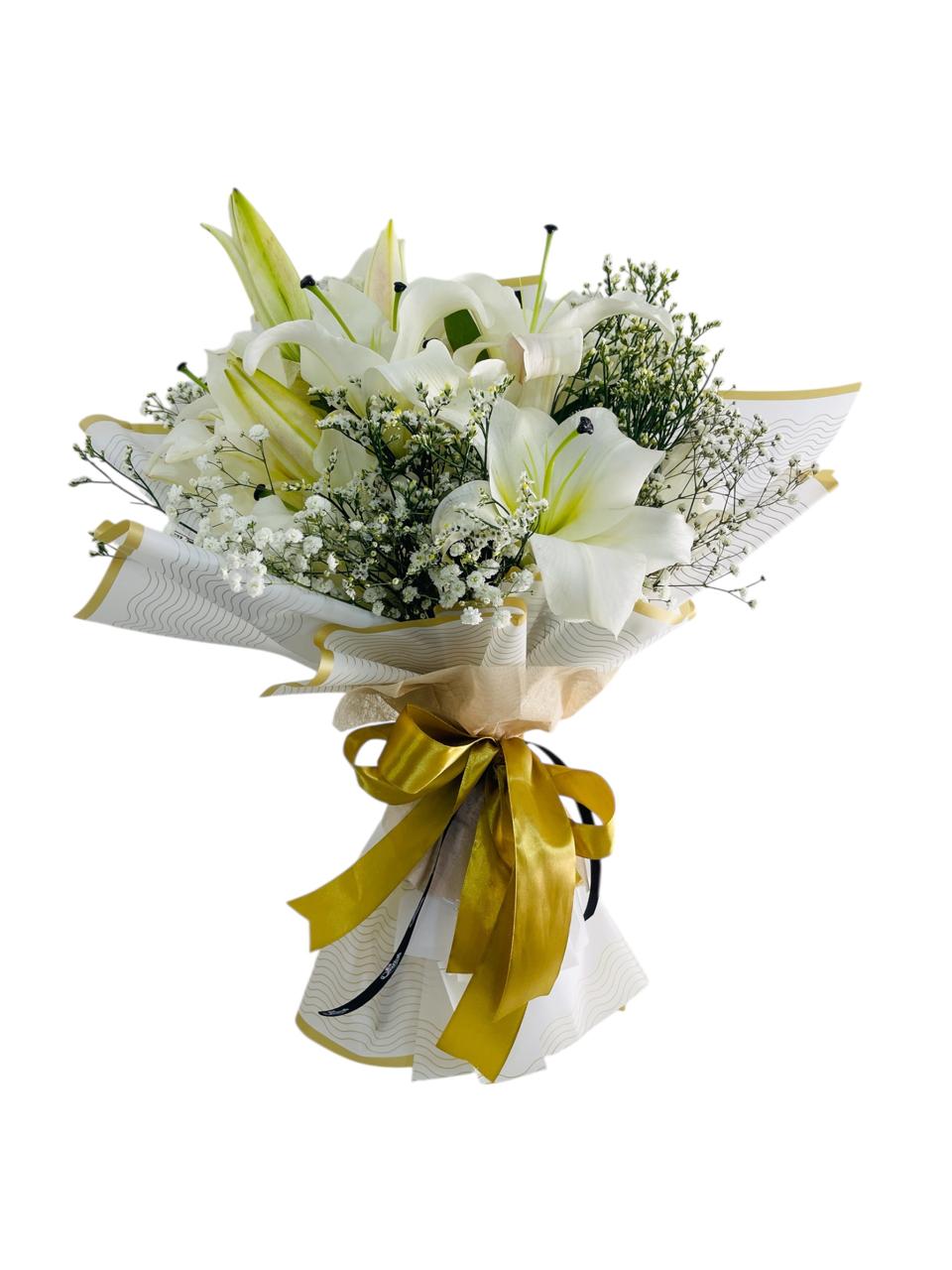 Un ramo sofisticado de lirios frescos y baby breath, envuelto en delicado papel coreano y terminado con un lazo decorativo. Perfecto para expresar amor, gratitud o admiración con un toque de elegancia natural.