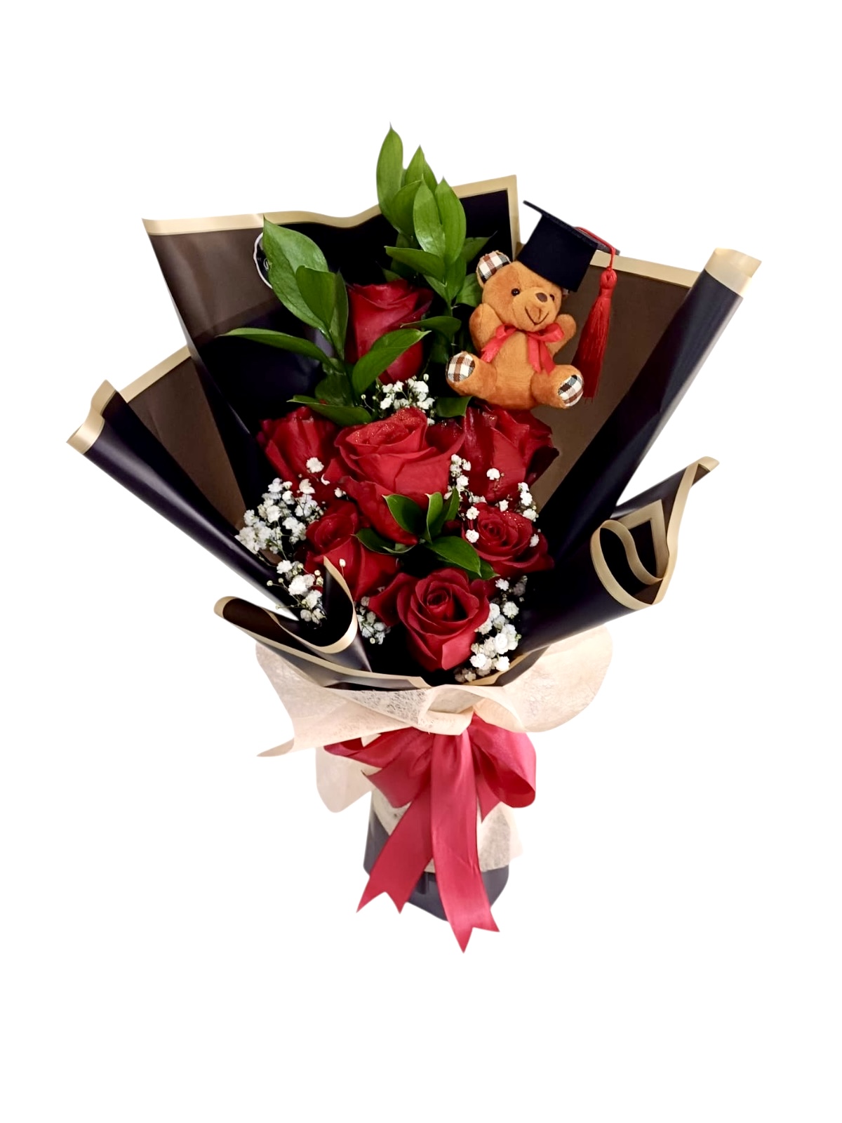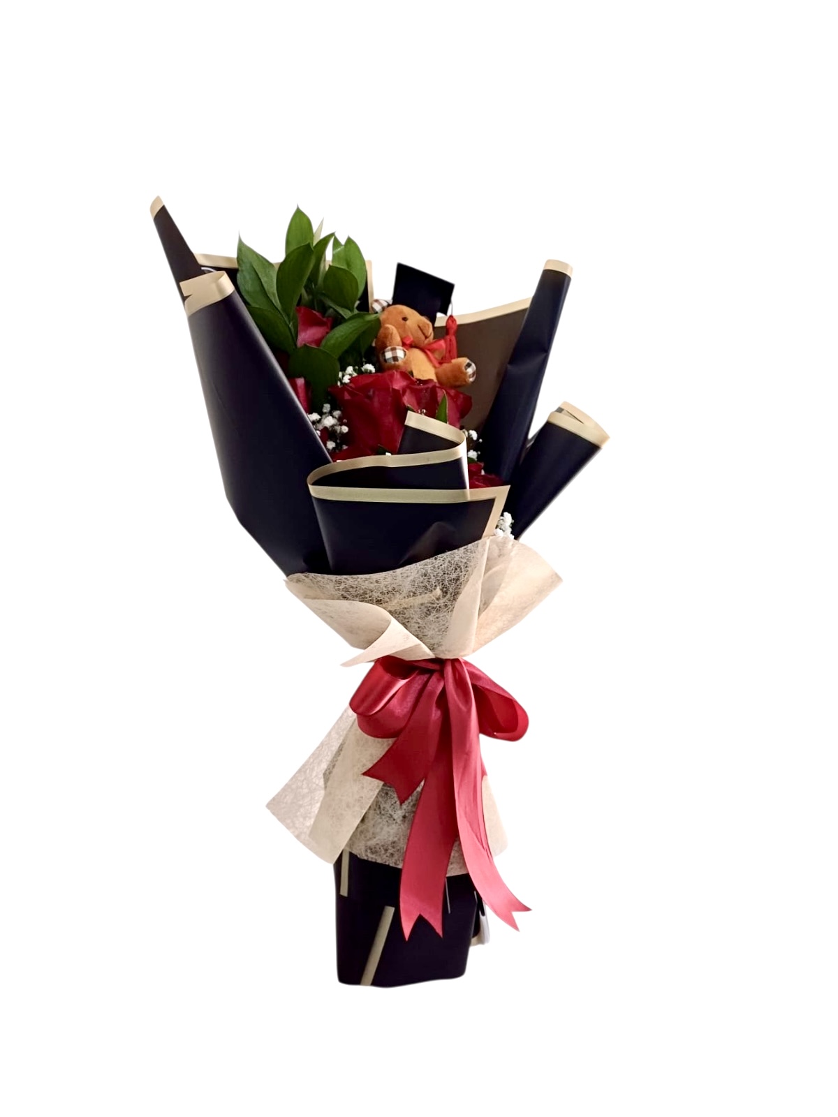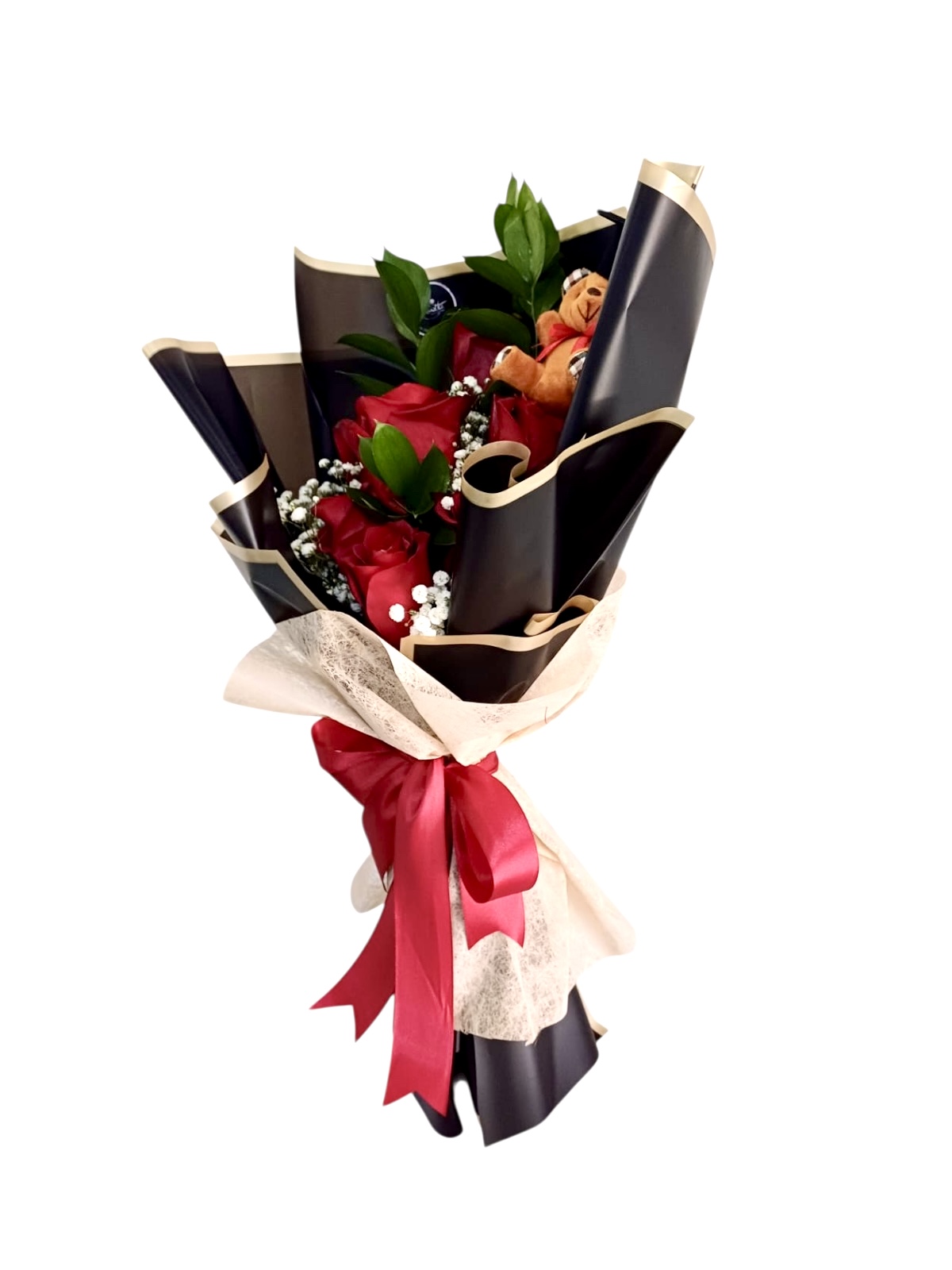 Un osito con elegancia profesional: seis rosas rojas rodeadas de delicado baby breath y ruscus; en una envoltura color negro con detalles dorados que refleja sofisticación y profesionalidad.