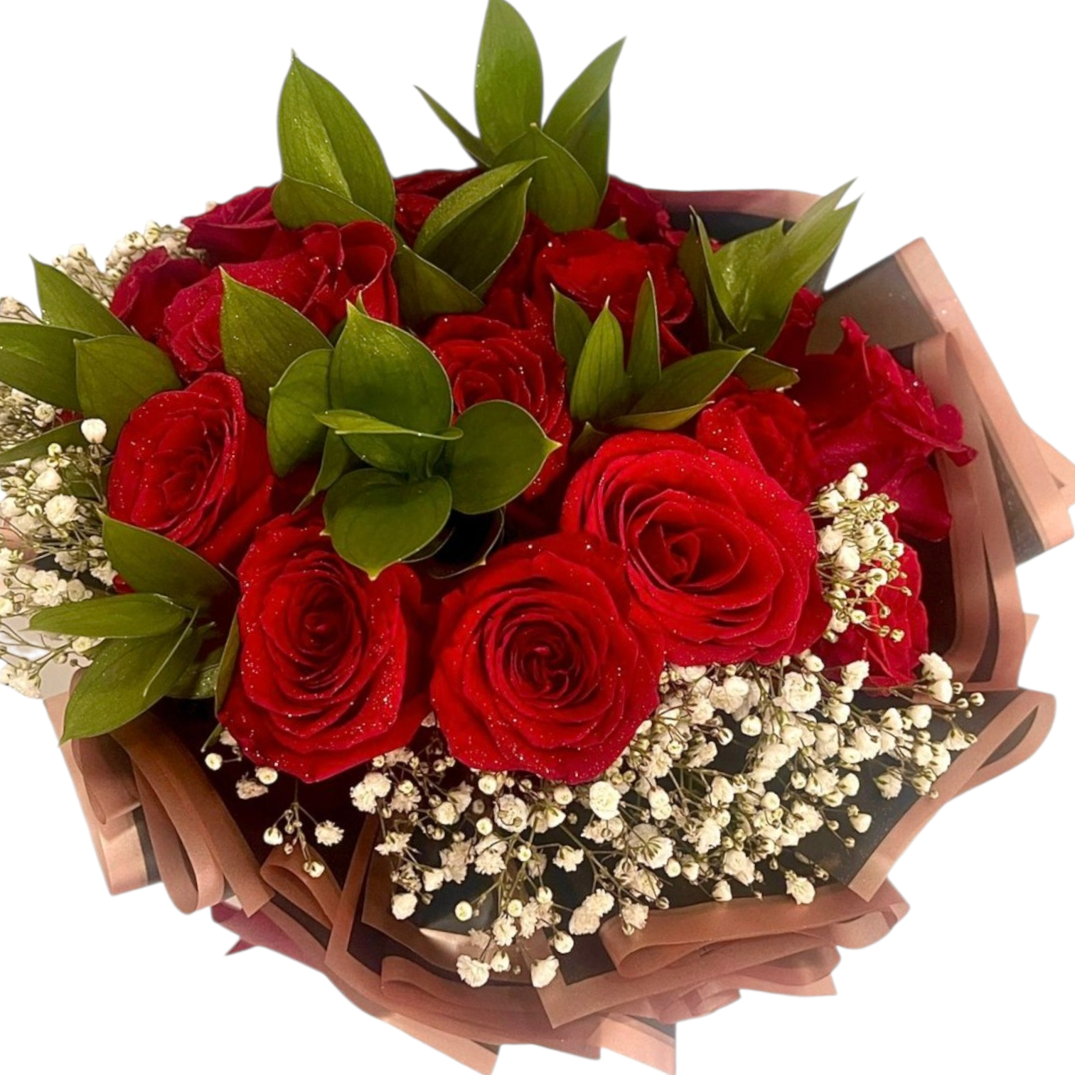 Bouquet de 16 rosas rojas bordeadas de ruscus y baby breath, con envoltura en papel coreano y lazo decorativo.
