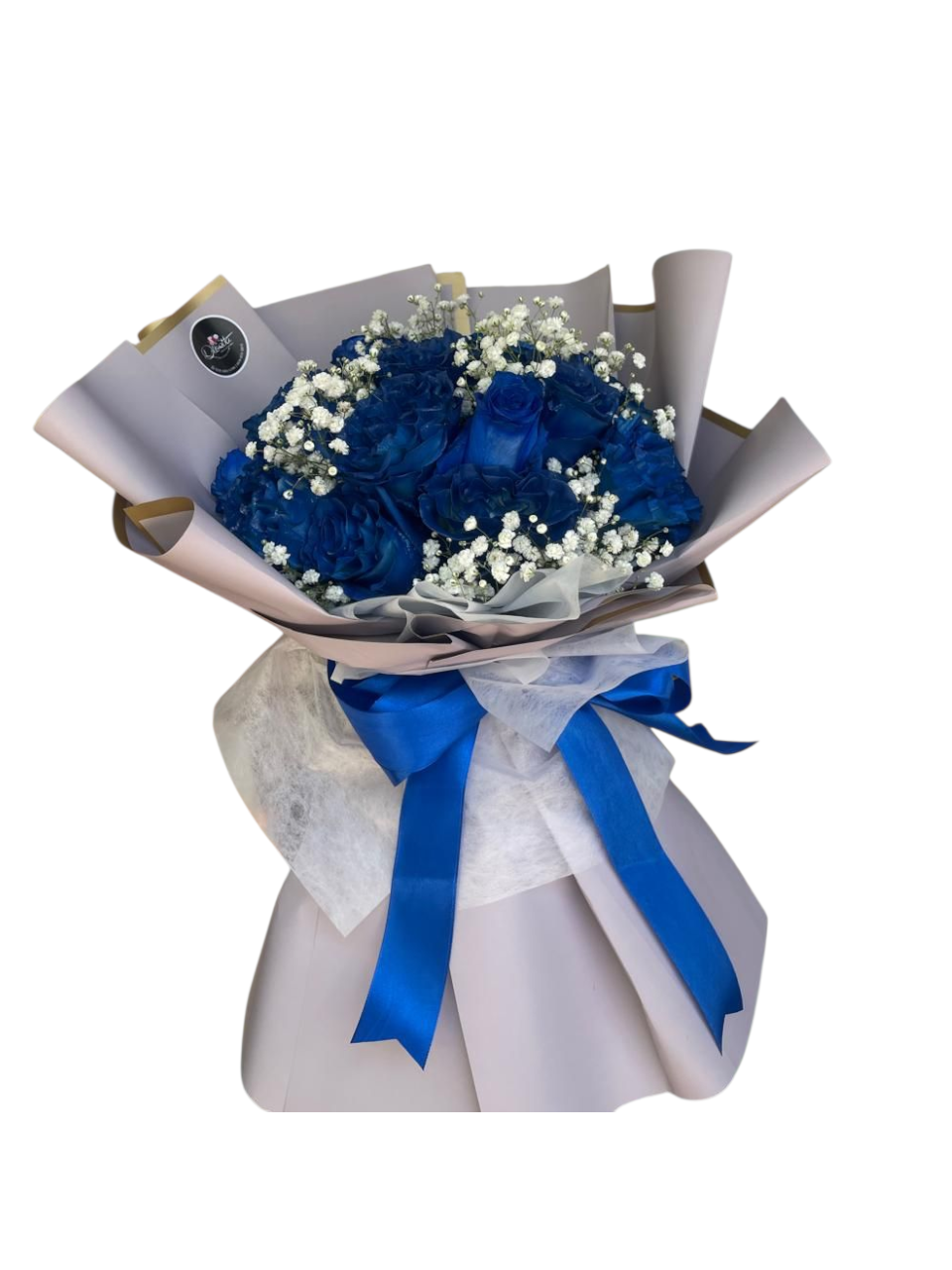 20 rosas azules como símbolo de misterio, confianza y admiración. Con baby breath que aporta delicadeza, este ramo es perfecto para alguien que brilla con luz propia.