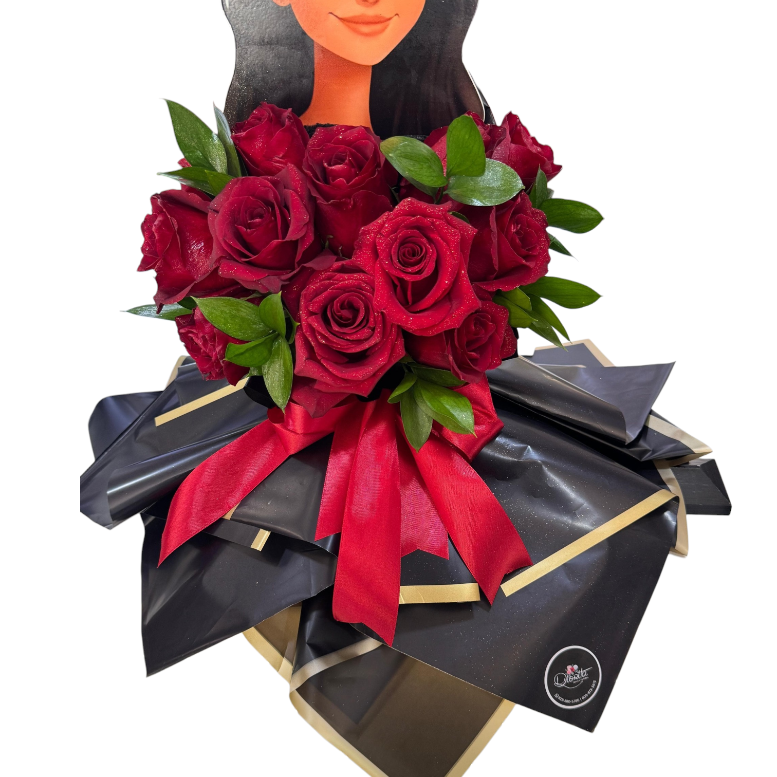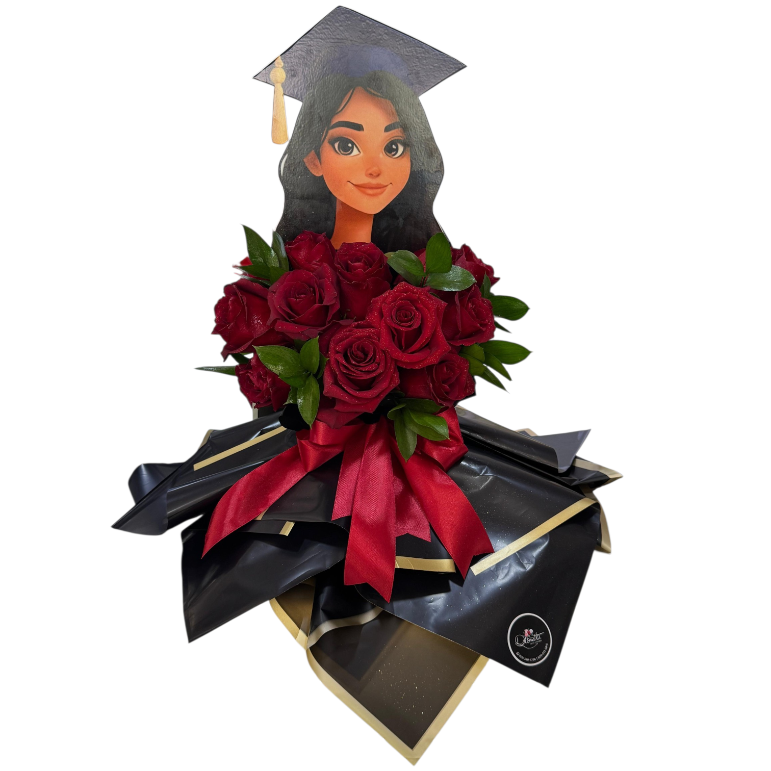 Doce rosas que simbolizan amor y éxito, envueltas en negro sofisticado y decoradas con una muñeca graduada para celebrar este momento único.