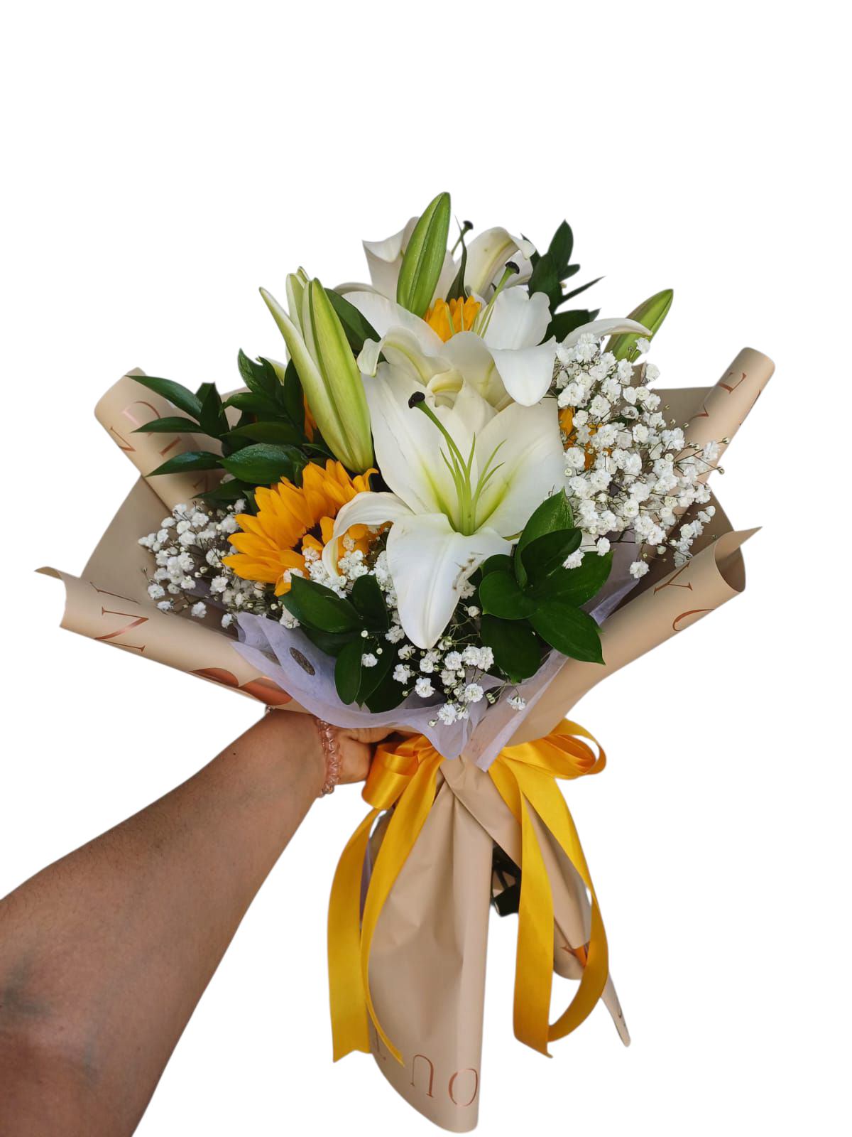 Un arreglo que ilumina cualquier espacio con la fuerza del girasol, la delicadeza del baby breath y el toque silvestre de las espigas de lirio. Perfecto para regalar luz, alegría y un pedacito de naturaleza.