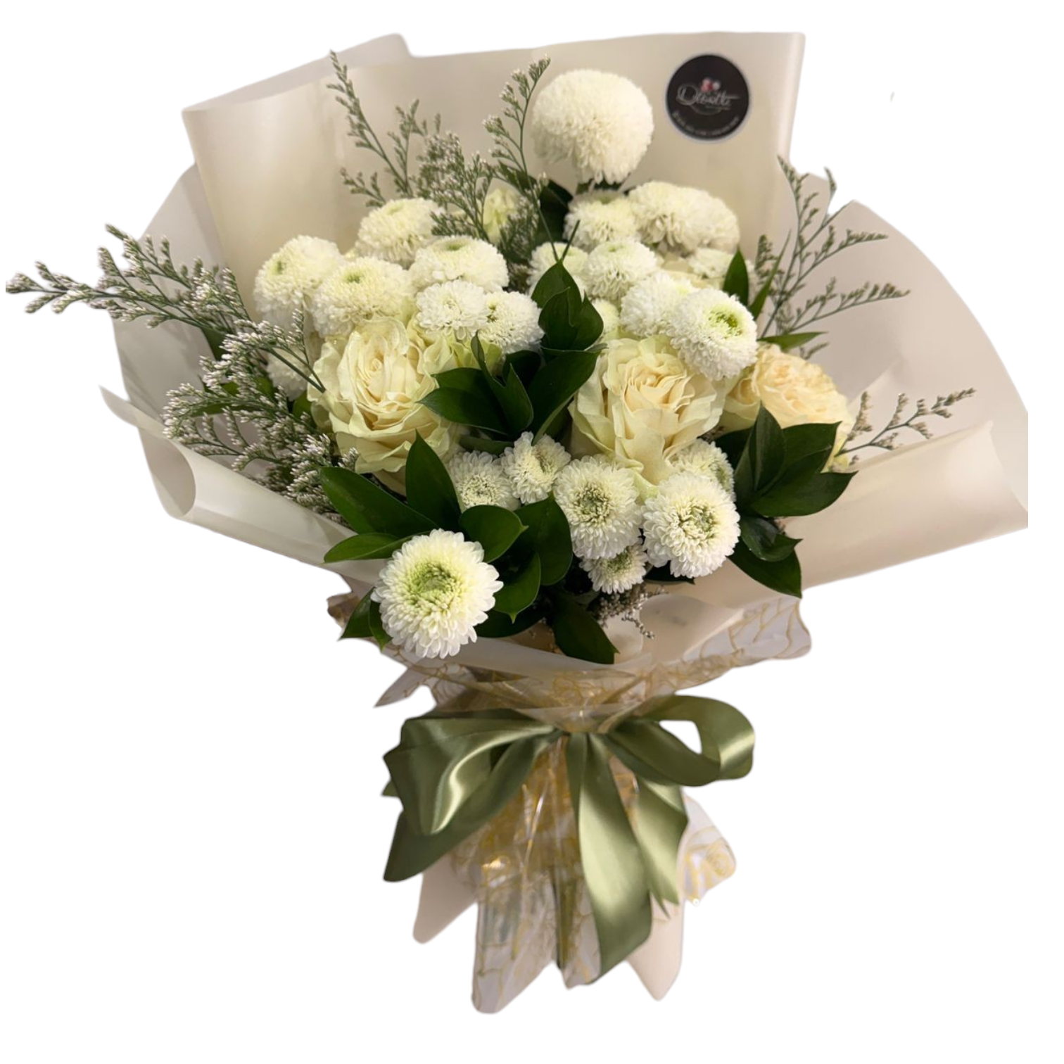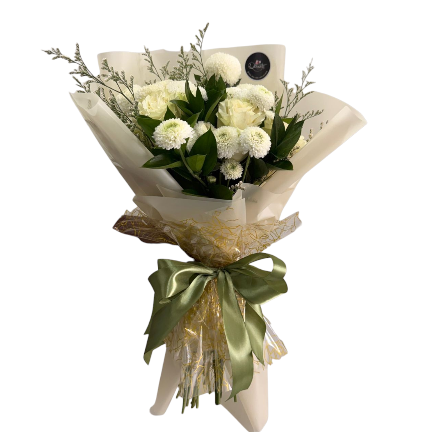 Un bouquet que transmite paz y elegancia: 6 rosas blancas acompañadas de suaves pompones, ruscus fresco y delicados toques de limonium