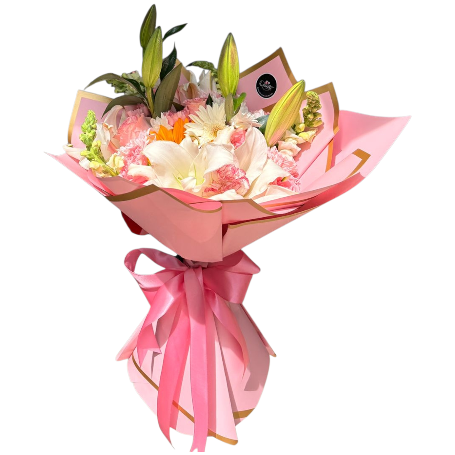 Una composición equilibrada de rosas, lirios, claveles y girasol, con un toque verde y envoltura rosada que lo hace simplemente perfecto.