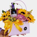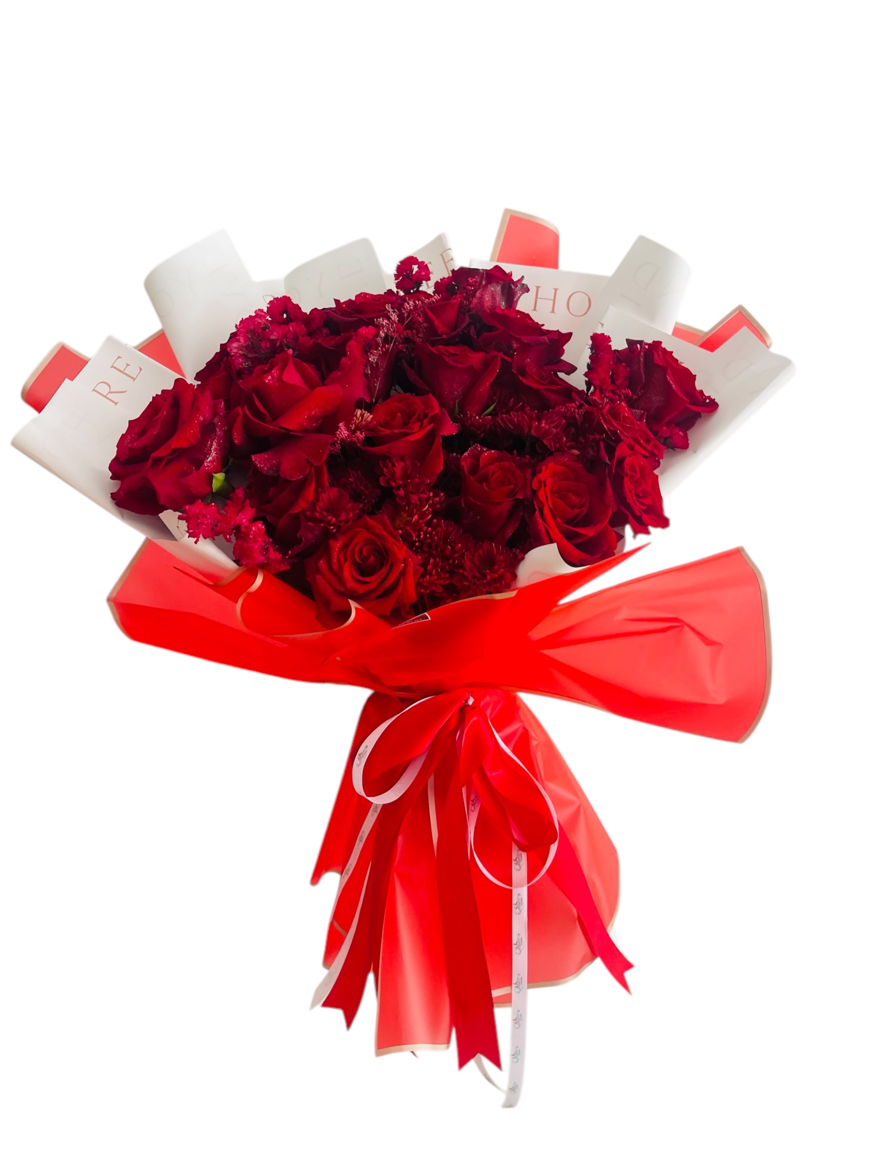 Este arreglo es el regalo perfecto para expresar amor y afecto en cualquier ocasión. Un bouquet vibrante y romántico que combina exquisitas rosas rojas con delicados statices pintados de rojo y encantadoras mini margaritas, y claveles frescos.