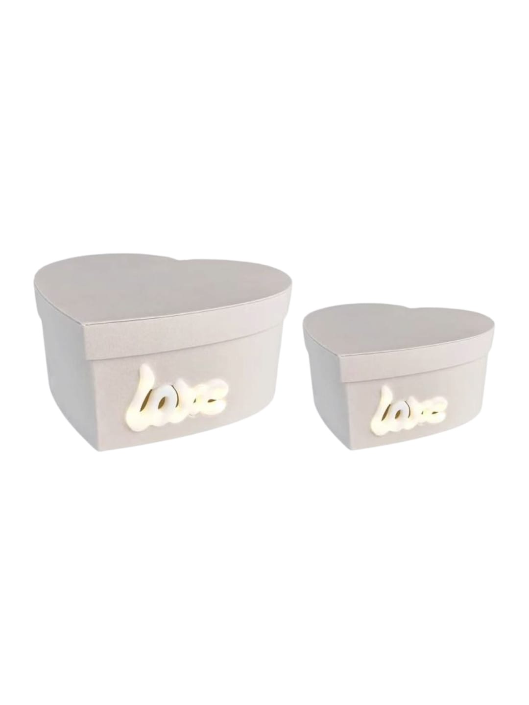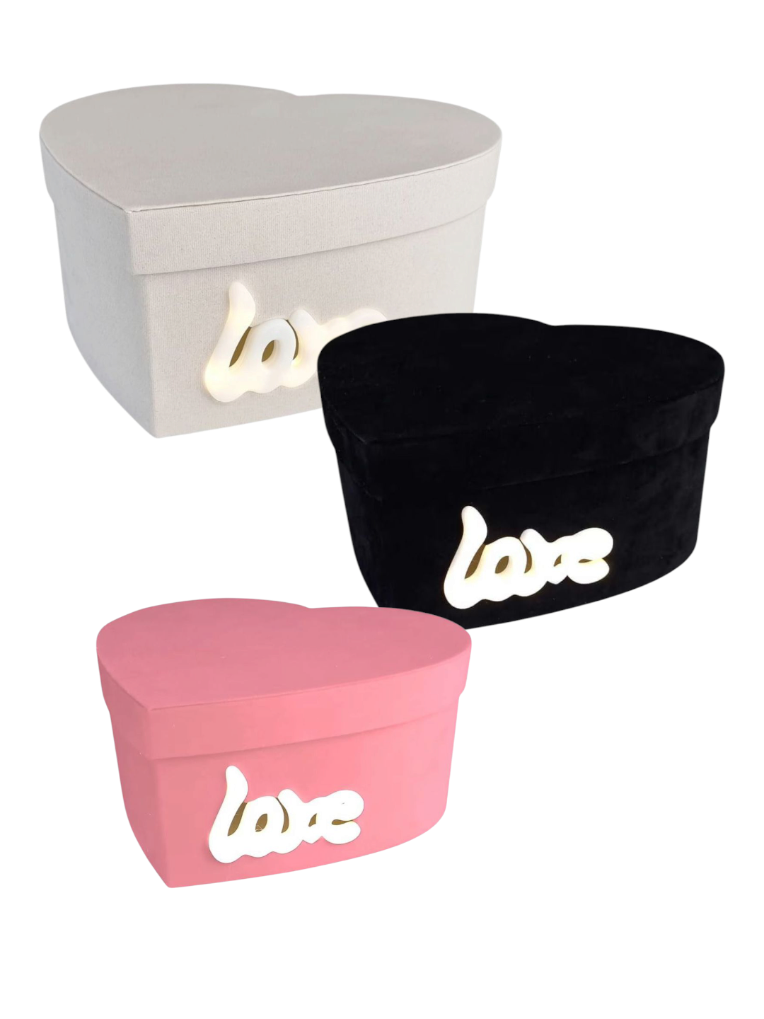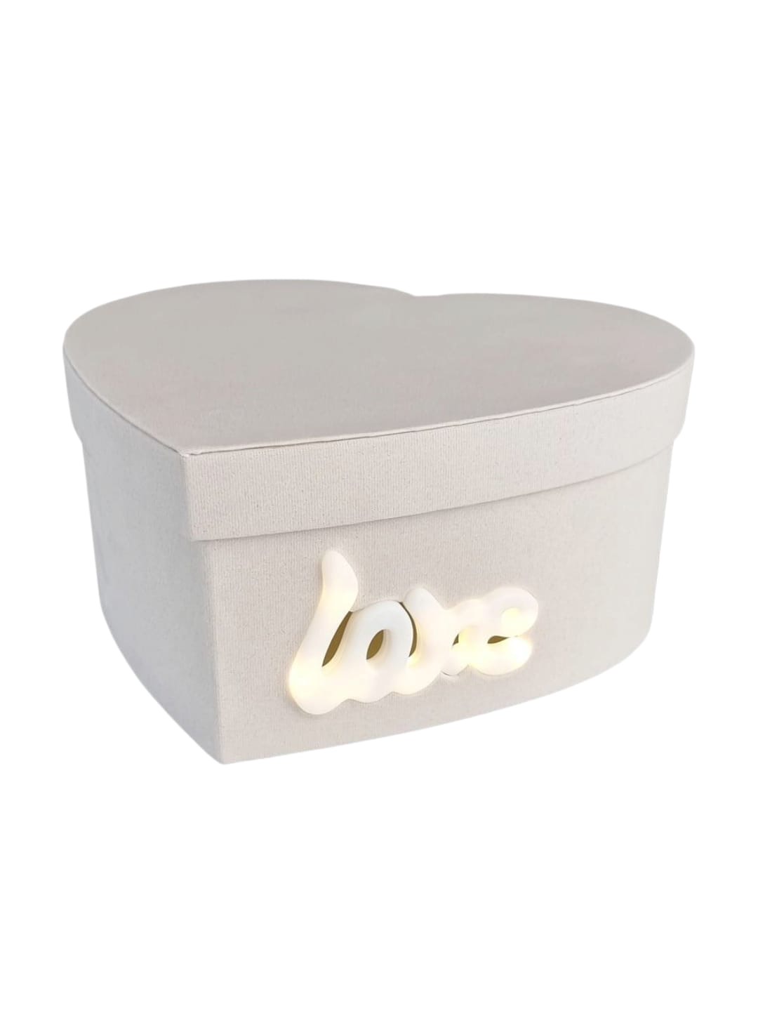 Caja decorativa en forma de corazón con la palabra «Love» iluminada en LED. Perfecta para sorprender con un detalle especial, disponible en distintos colores y tamaños. ¡Romántica, original y lista para brillar!