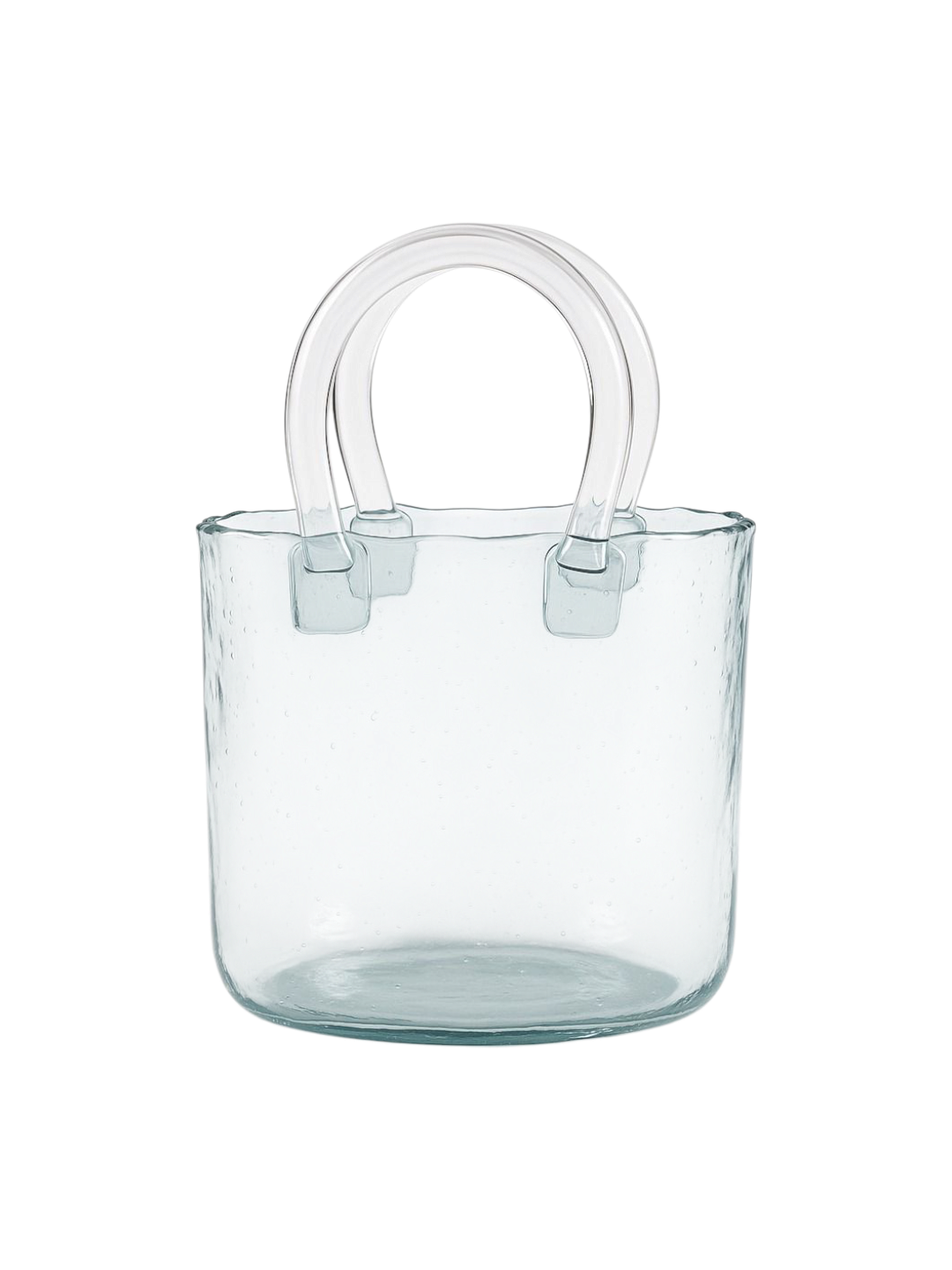 Caja macetero en cristal clear con forma de cartera y asas tipo manga. Un diseño moderno y elegante, ideal para presentar arreglos florales con estilo único.