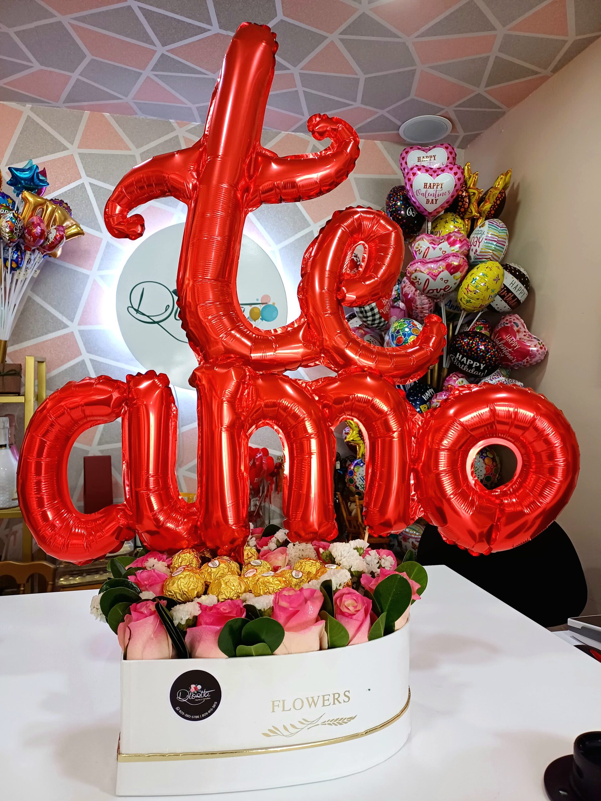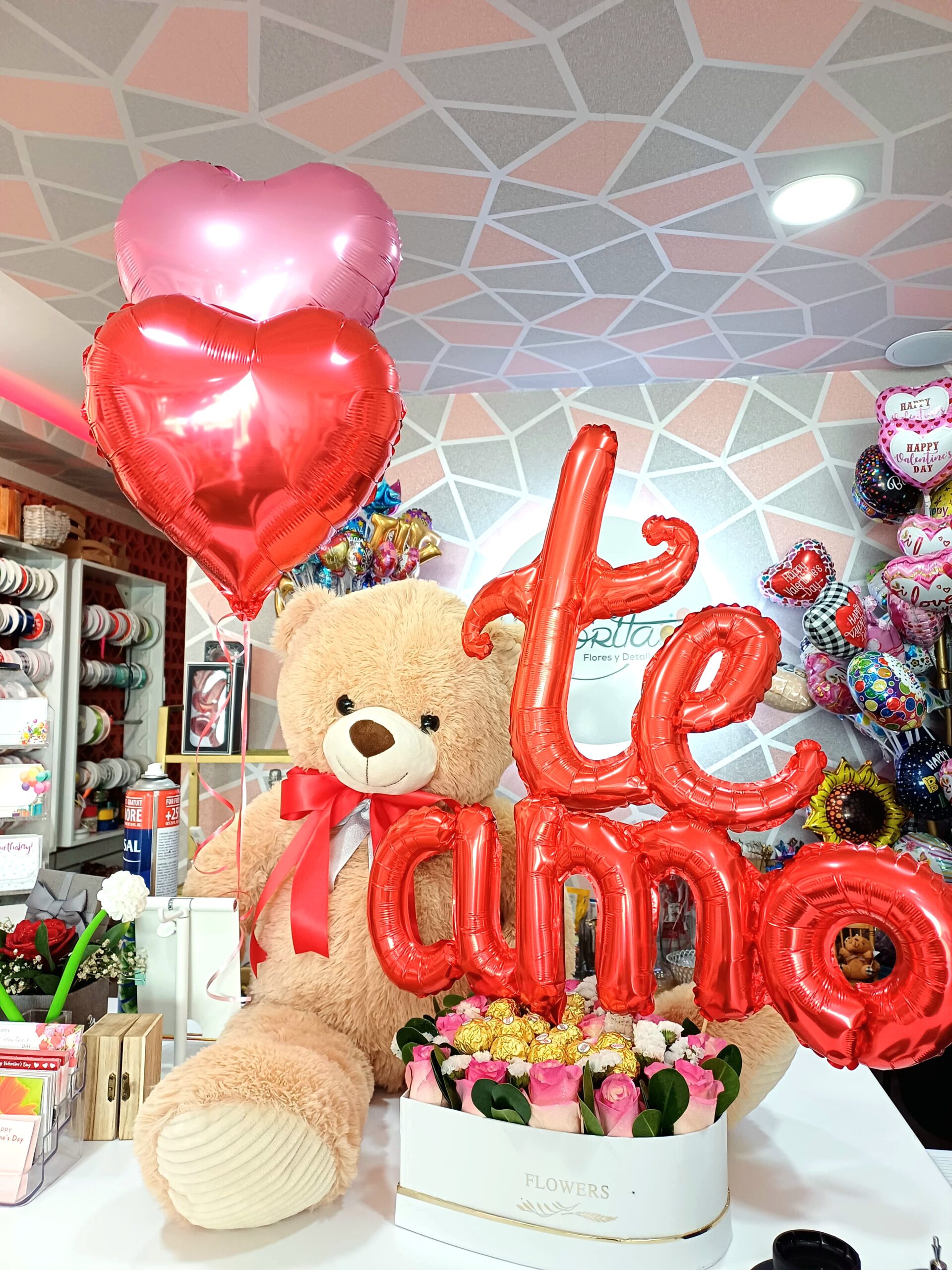 Un regalo que lo dice todo sin palabras. Caja en forma de corazón con rosas, bombones, ruscus y estatis, acompañada de globos con helio y un adorable oso de peluche. Ideal para expresar amor de la manera más dulce y especial.