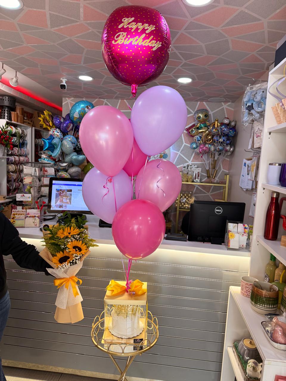 Detalles que hablan por ti. Un pastel elegante, globos en helio y un bouquet de girasoles para decir feliz cumpleaños de la forma más bonita.