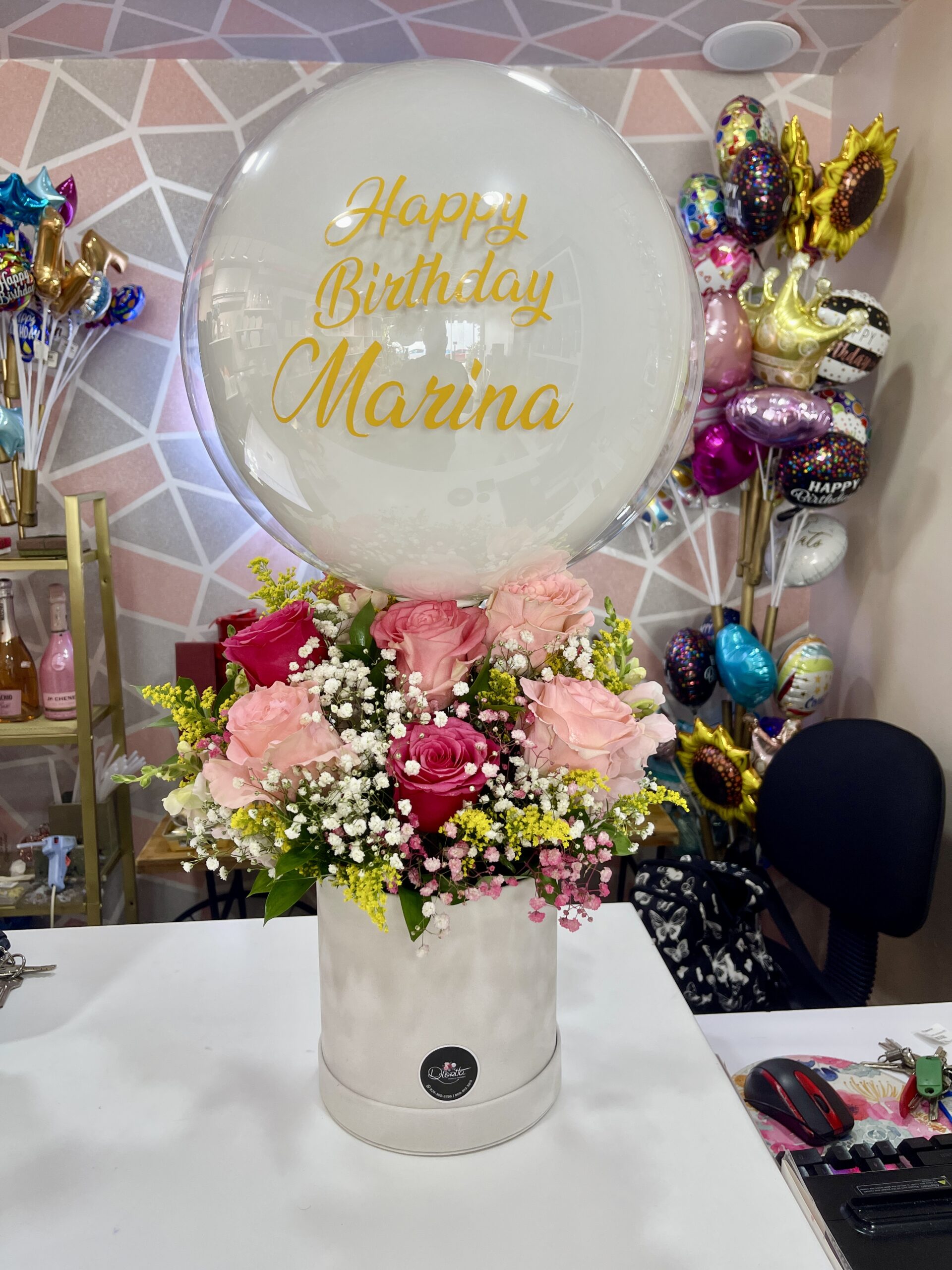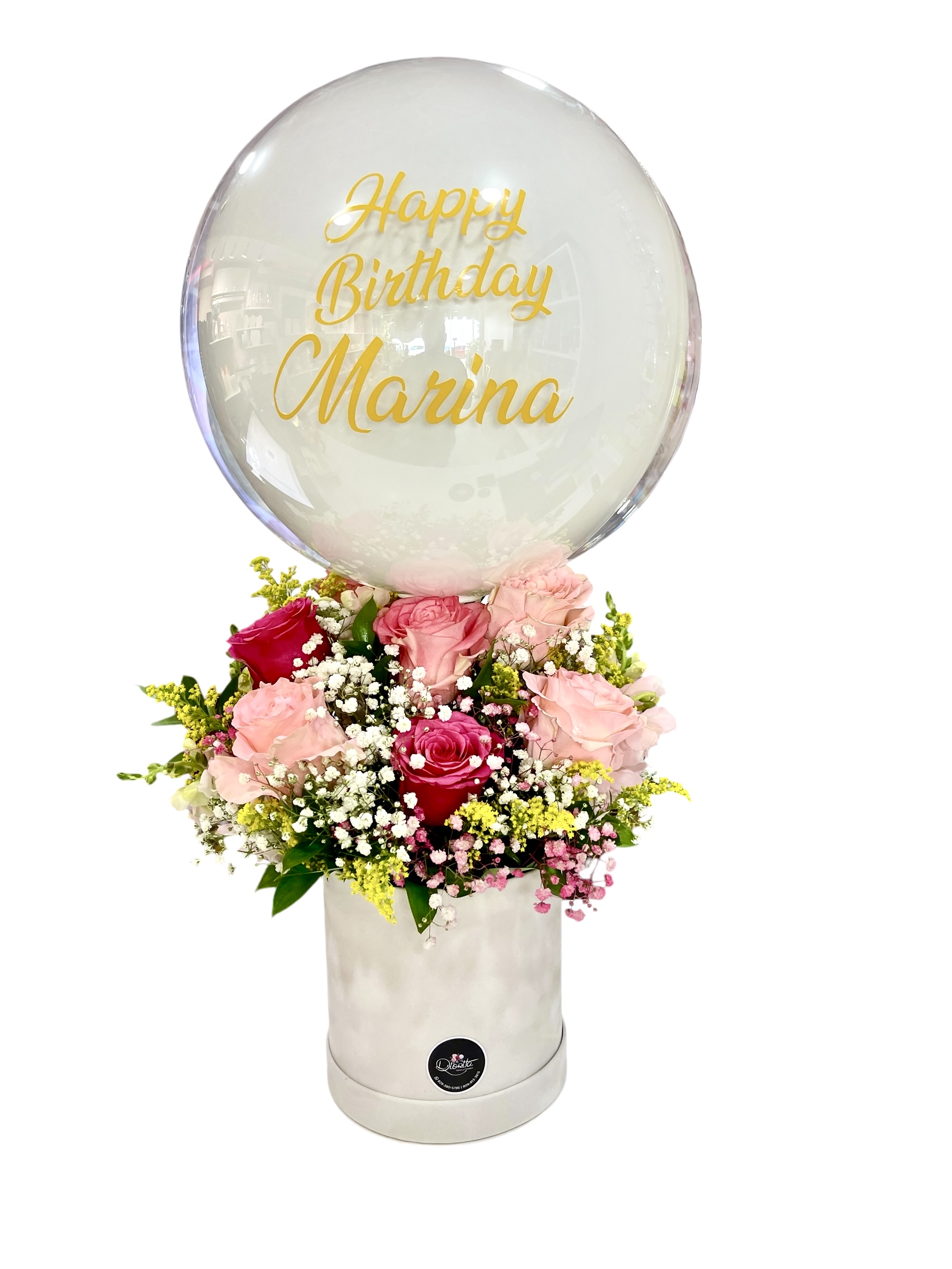 Con una cuidadosa selección de tonos de rosas rosadas y rojas bordeadas de frescos baby breath y ruscus, reposando sobre caja redonda en pana y un fabuloso globo burbuja personalizado.