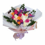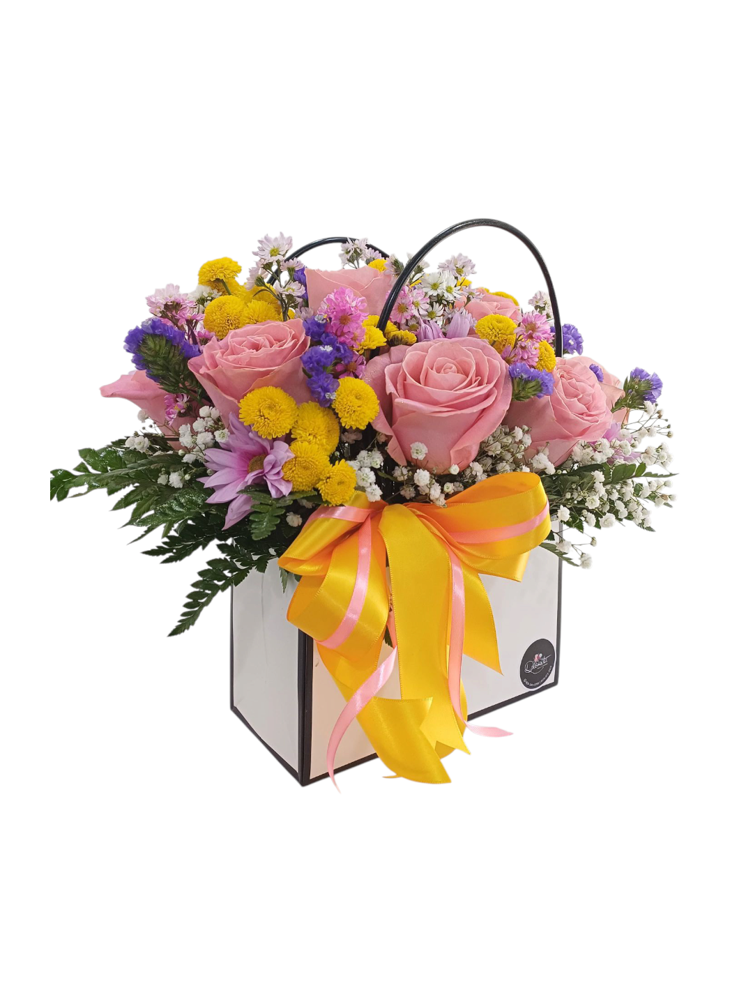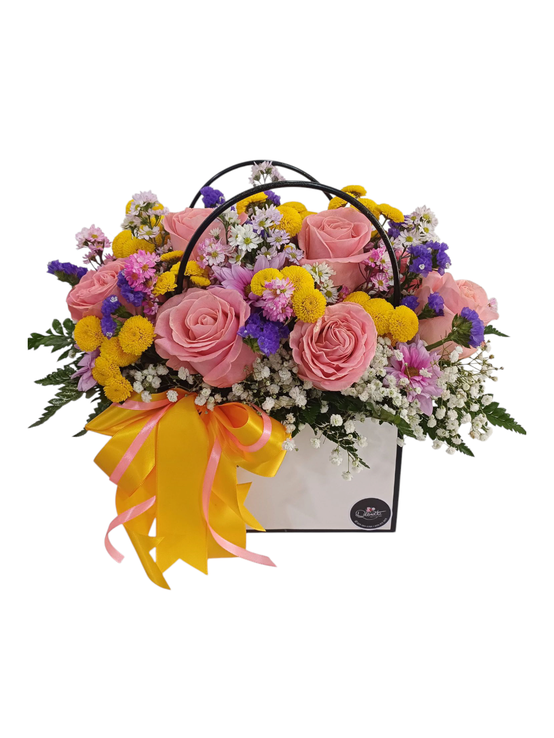 Un arreglo lleno de color y textura, donde las rosas se entrelazan con flores brillantes y toques silvestres. Cada elemento aporta calidez, alegría y una elegancia natural perfecta para sorprender con estilo.