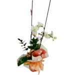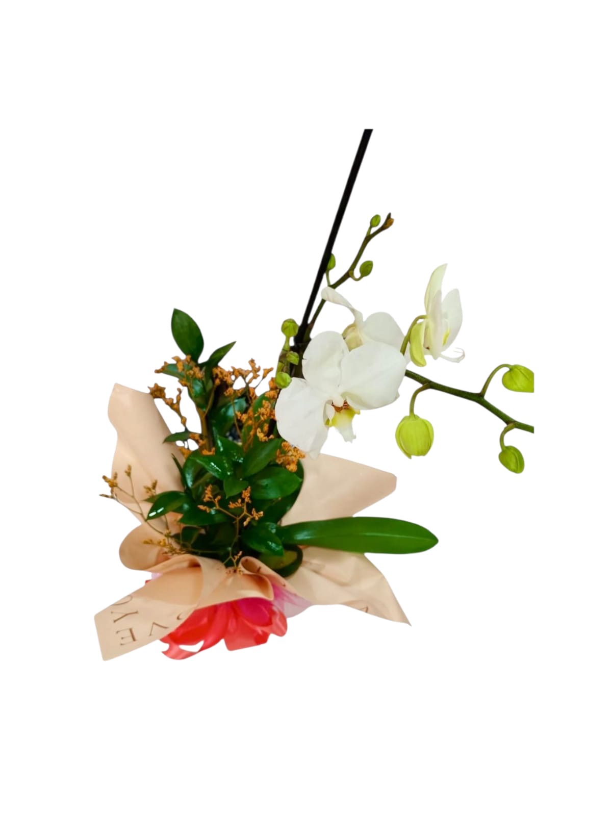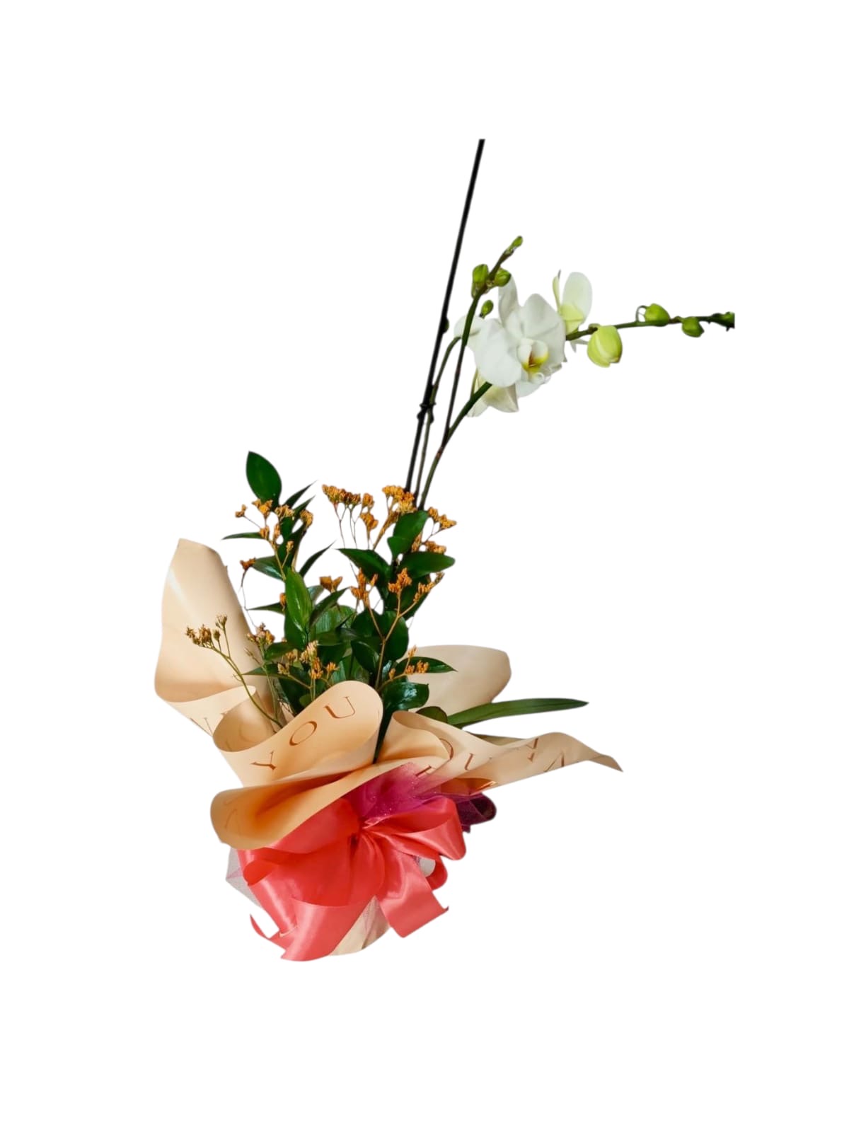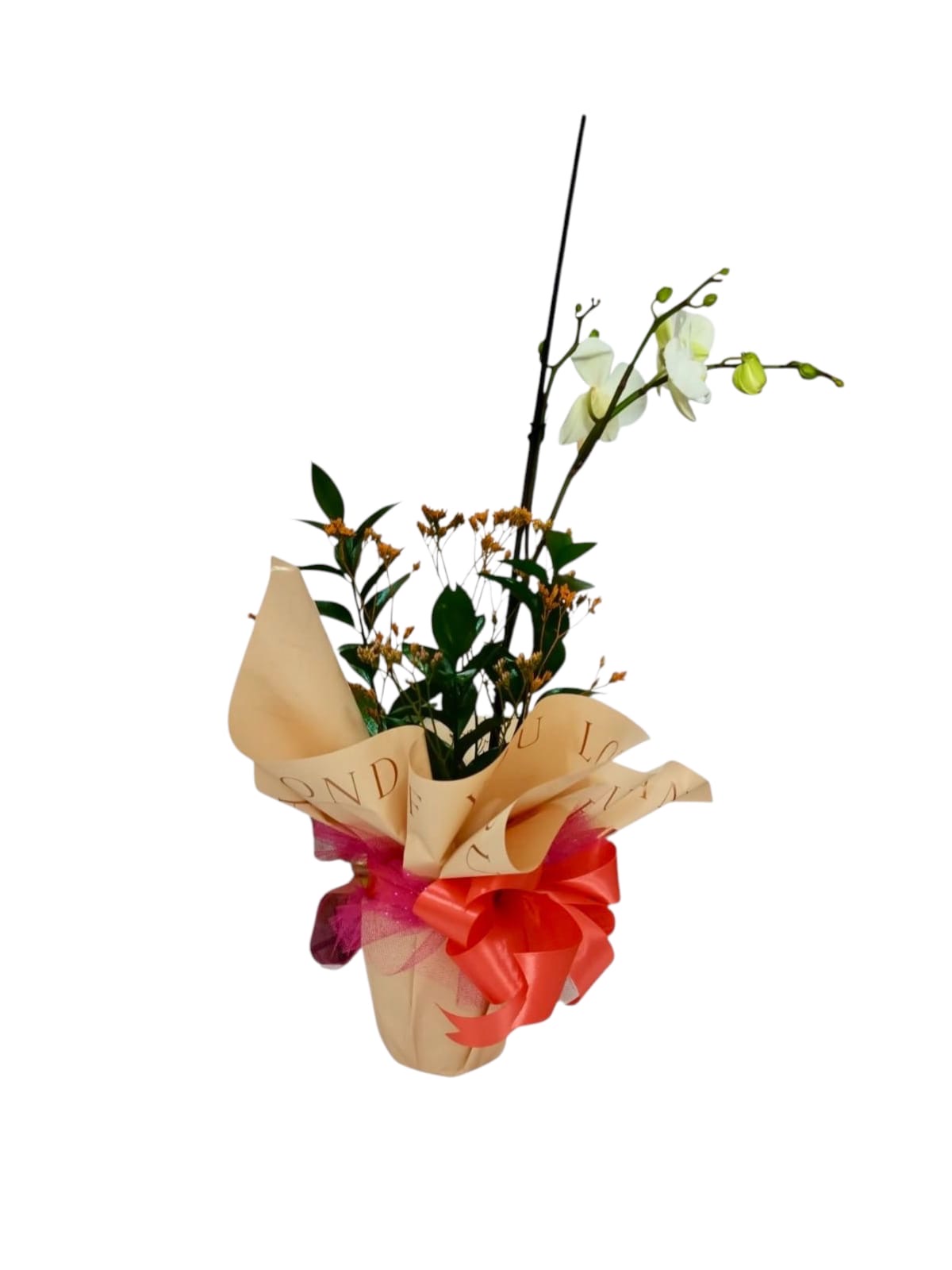 Orquídea blanca con detalles dorados, envuelta en tonos cálidos y lazo vibrante. Un detalle lleno de luz, elegancia y gratitud.