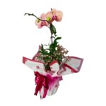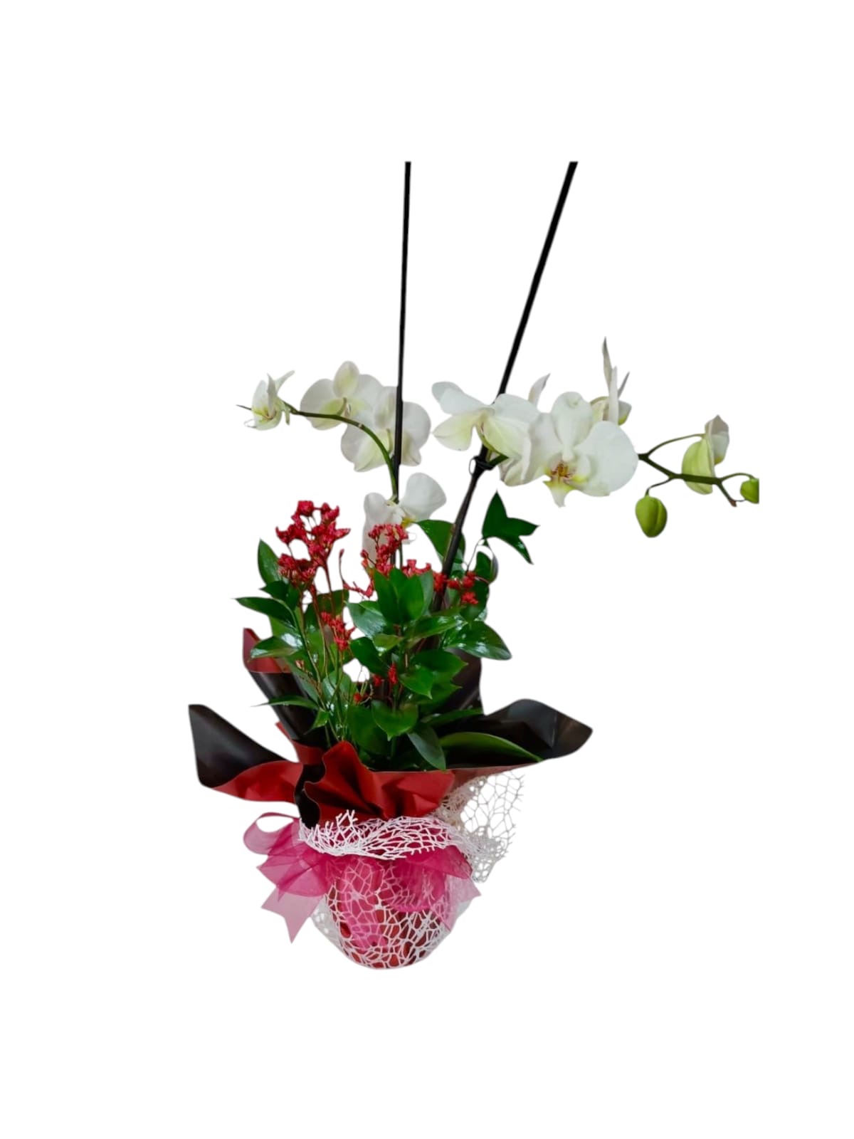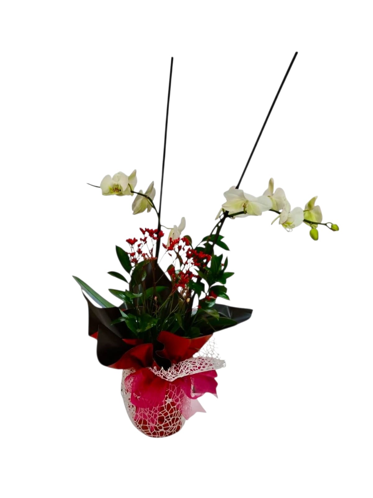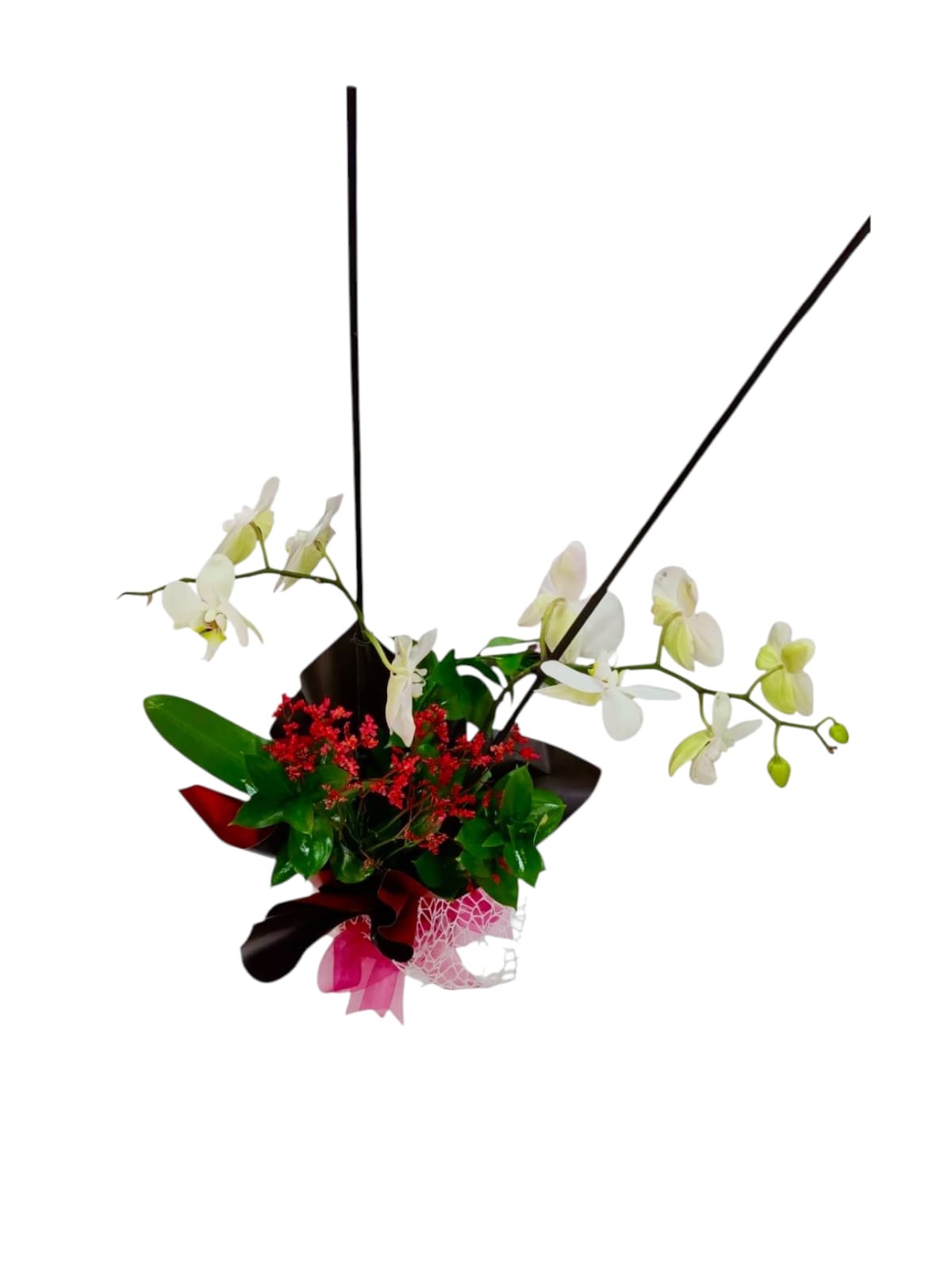 Orquídea blanca y flores rojas en armonía perfecta, vestidas con envoltura elegante y lazo en tonos rosa y blanco. Un detalle que cautiva a primera vista.