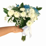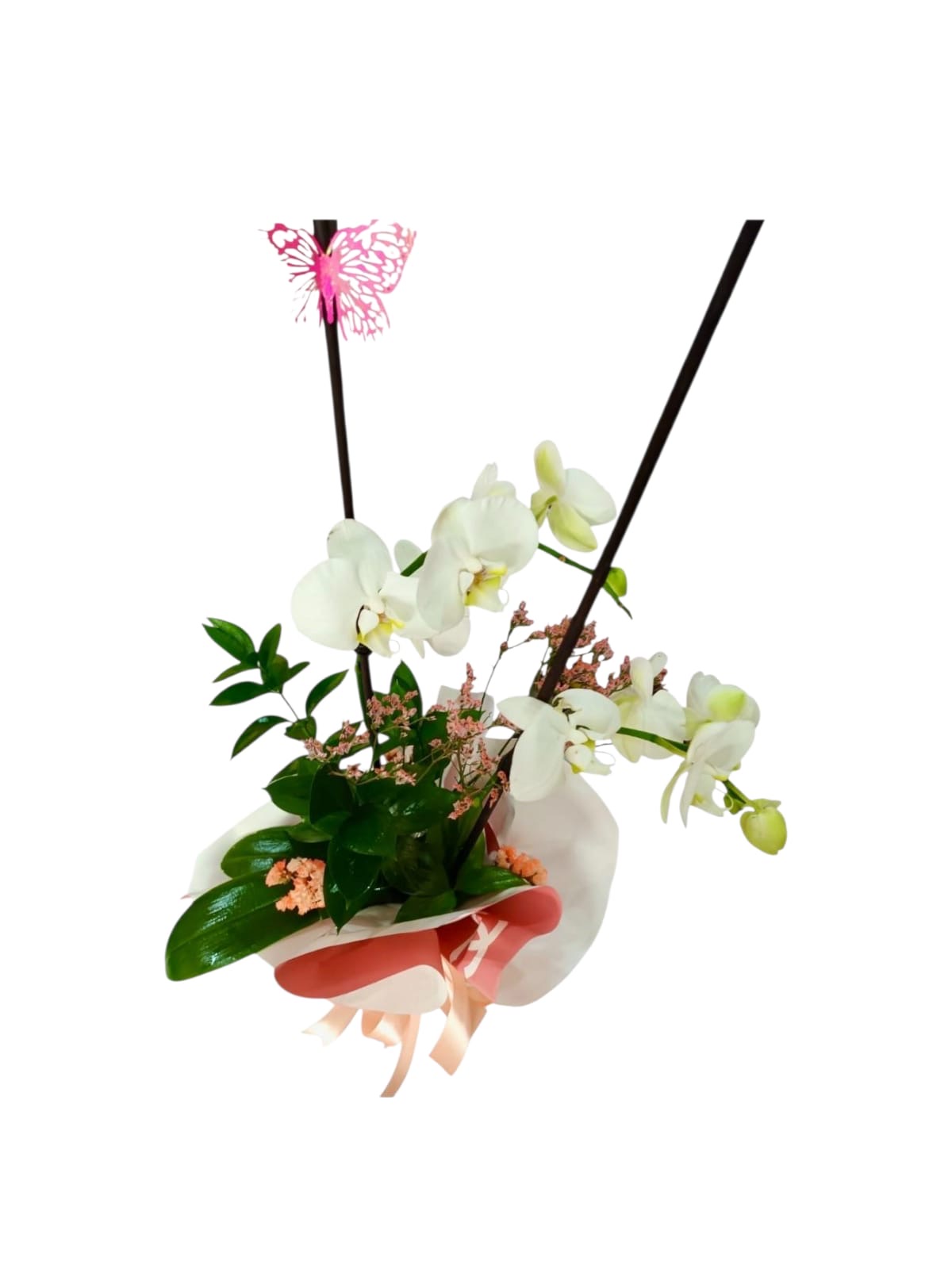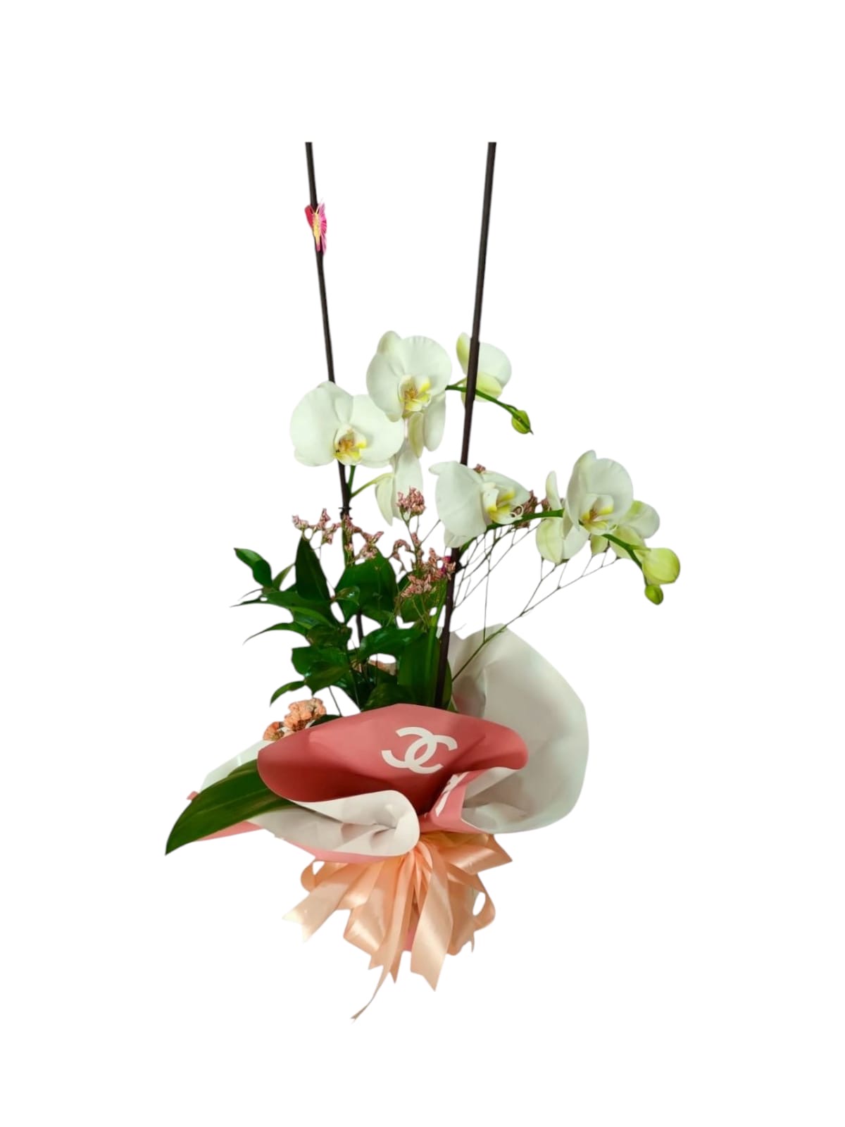 Orquídea blanca en envoltura elegante con detalles rosa durazno y lazo doble. Un detalle sutil, delicado y con aire de alta costura.