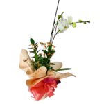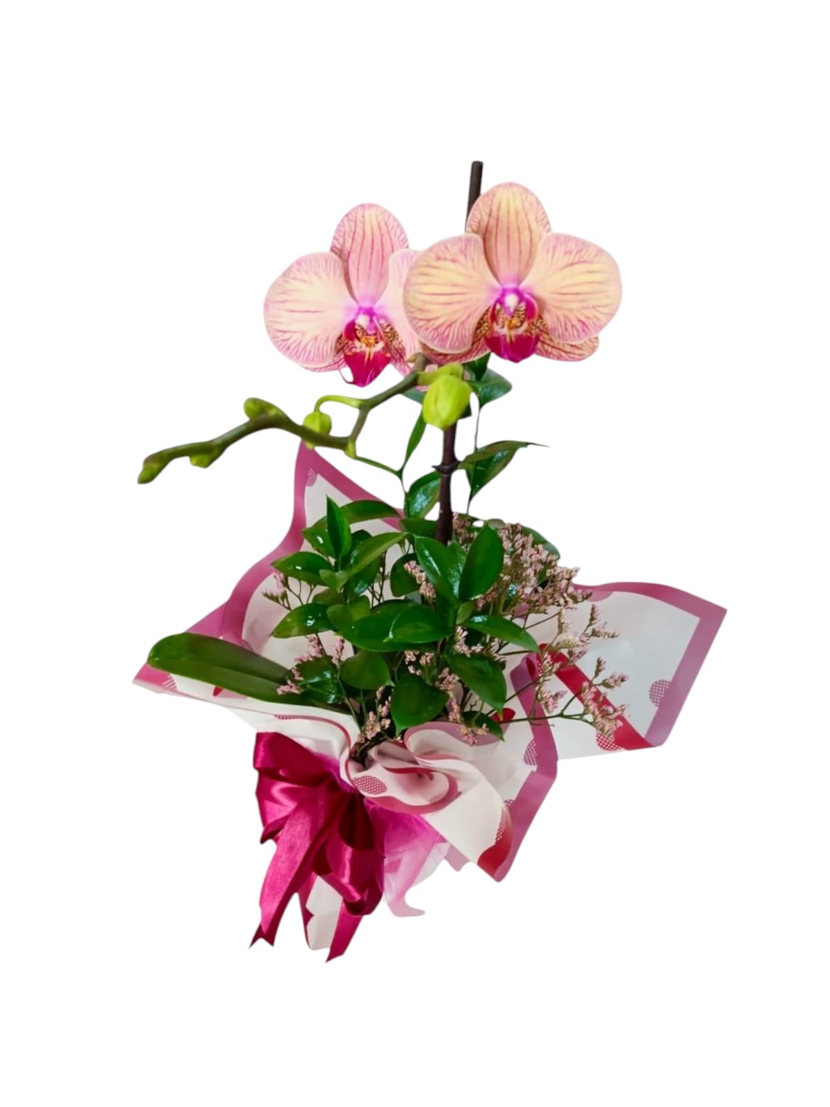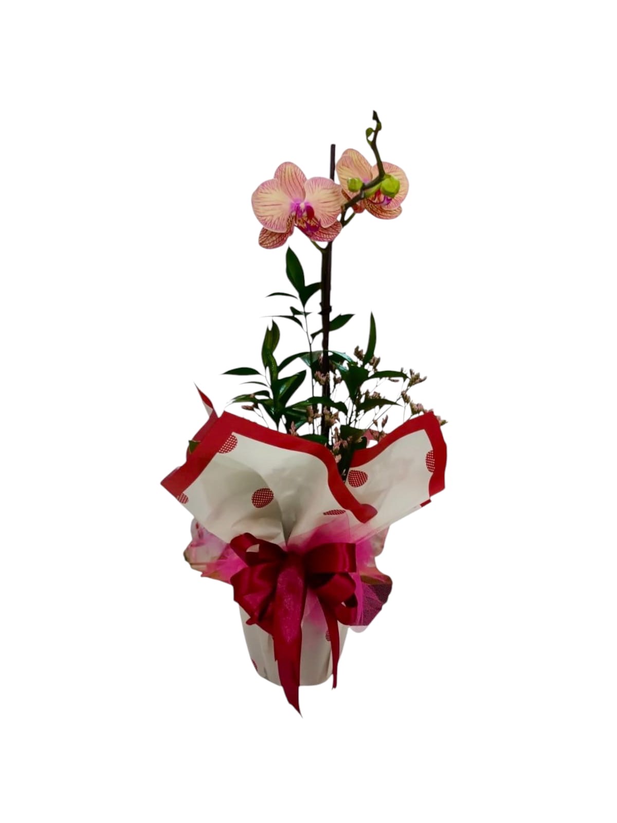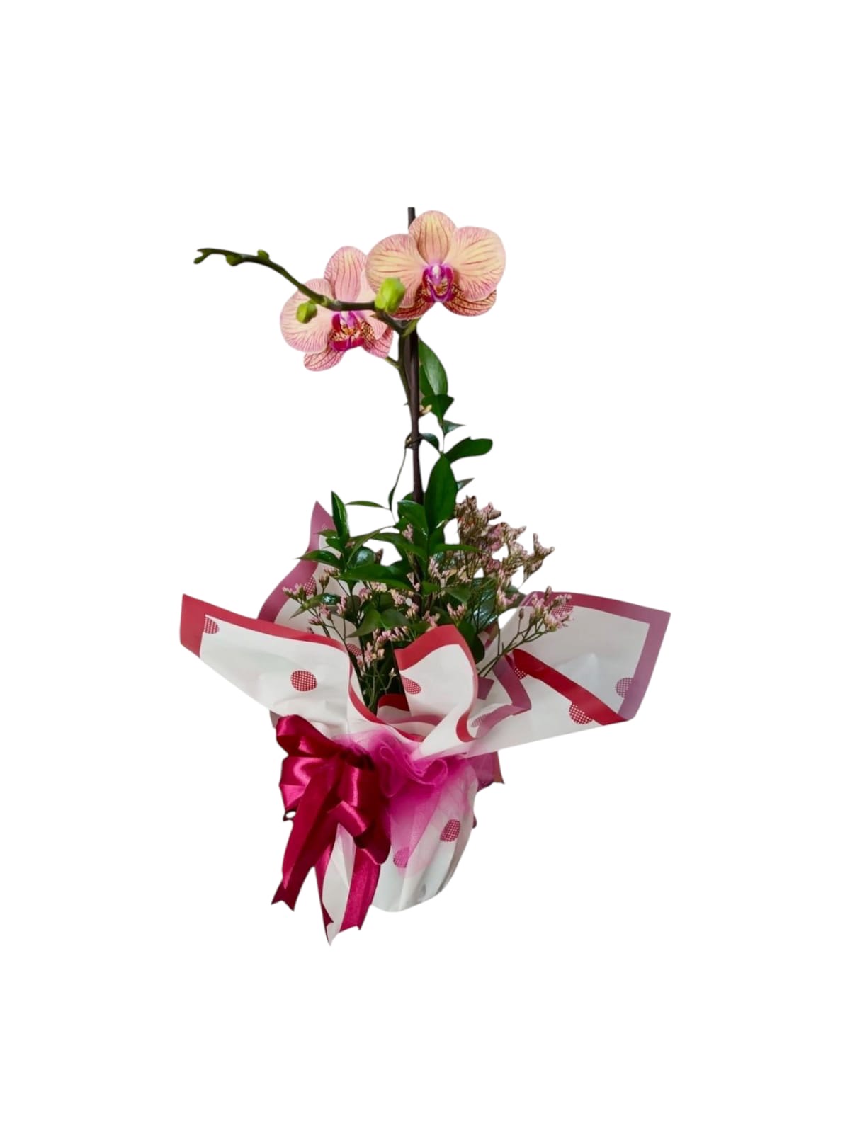 Orquídea en tonos rosa con flores complementarias, envuelta en papel de lunares y lazo fucsia. Un regalo lleno de ternura y alegría.