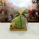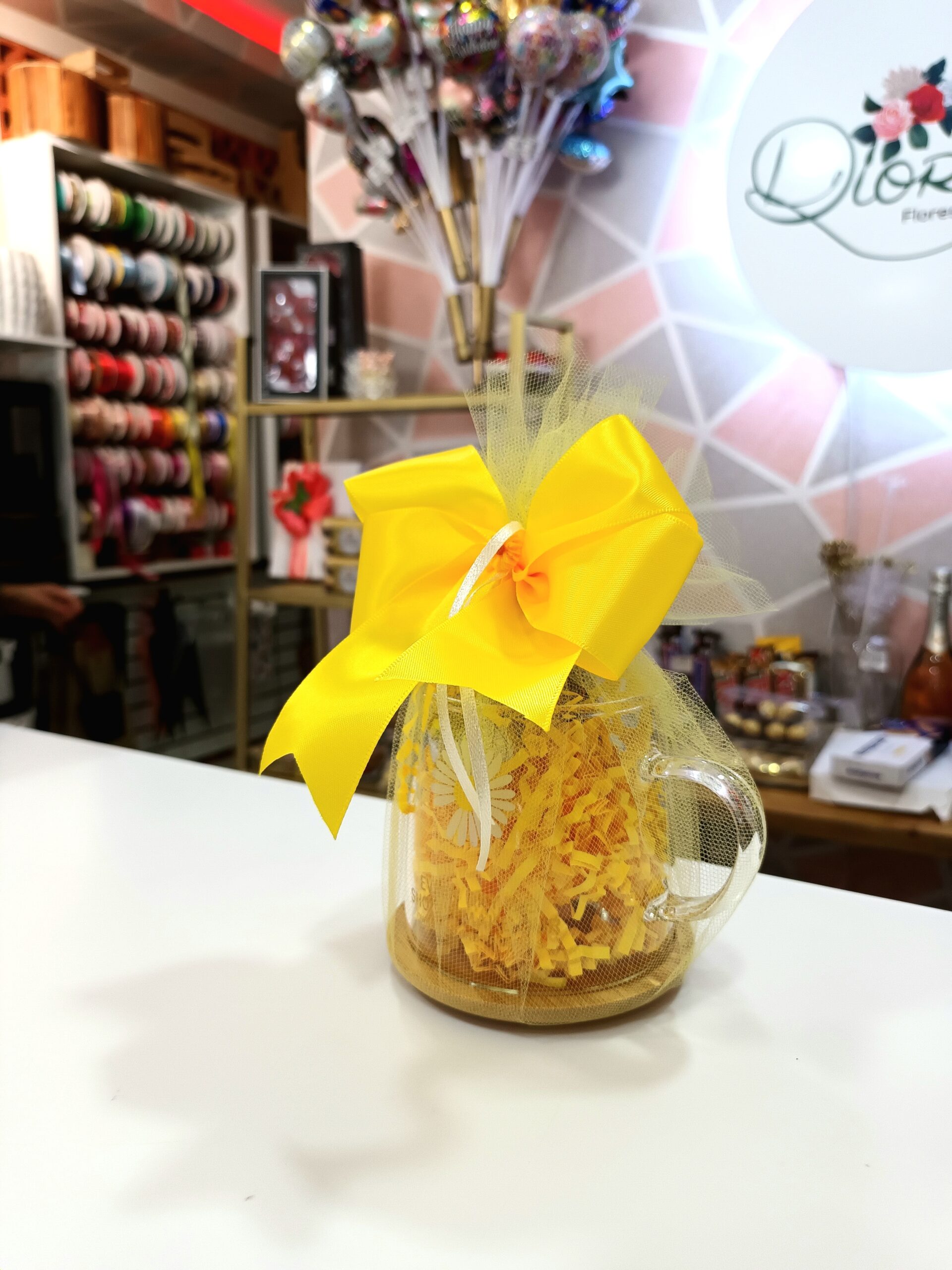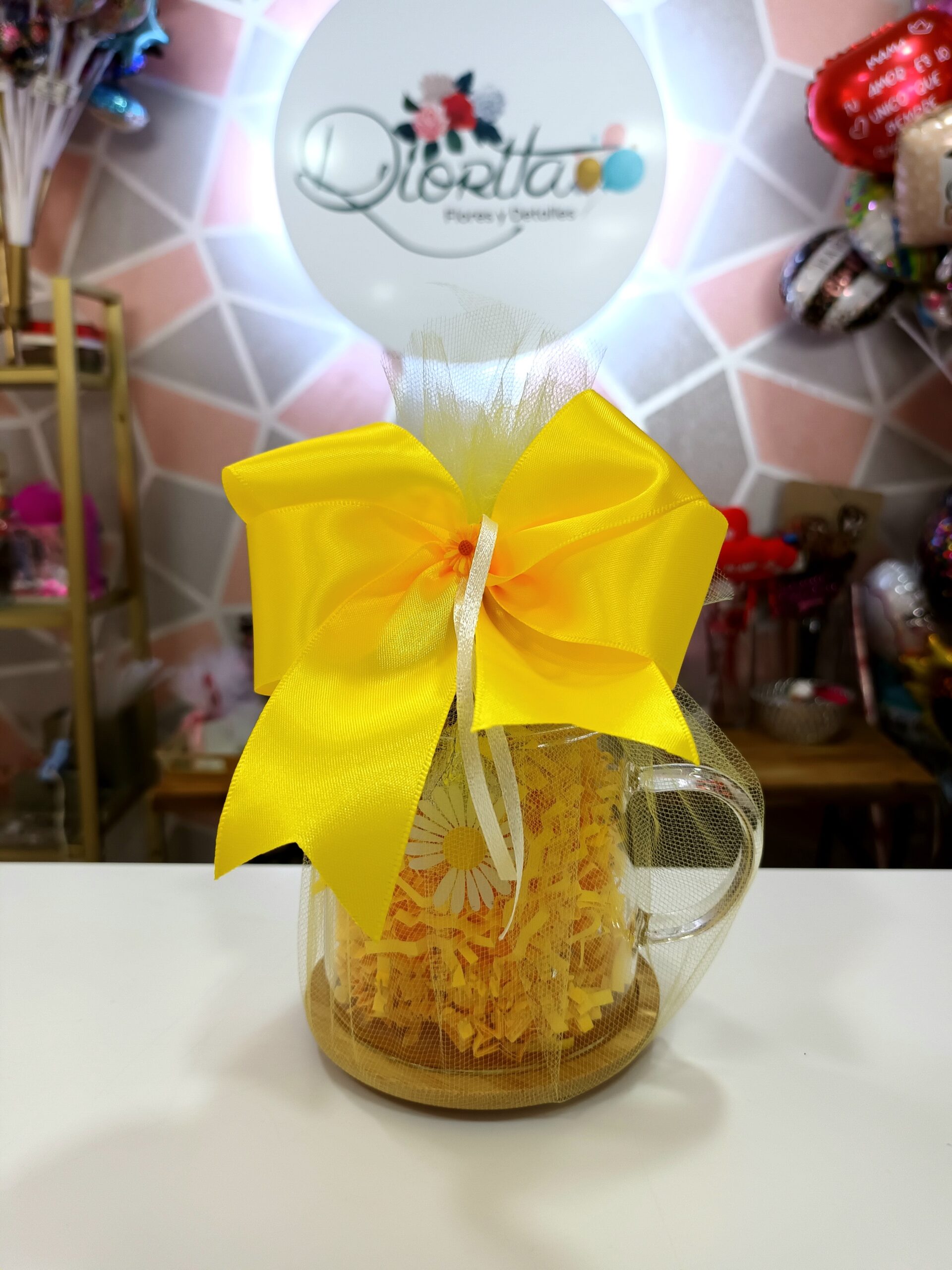 Taza Margaritas con platillo de madera, Snickers y Kisses en elegante envoltura. Dulzura y encanto en un solo detalle.