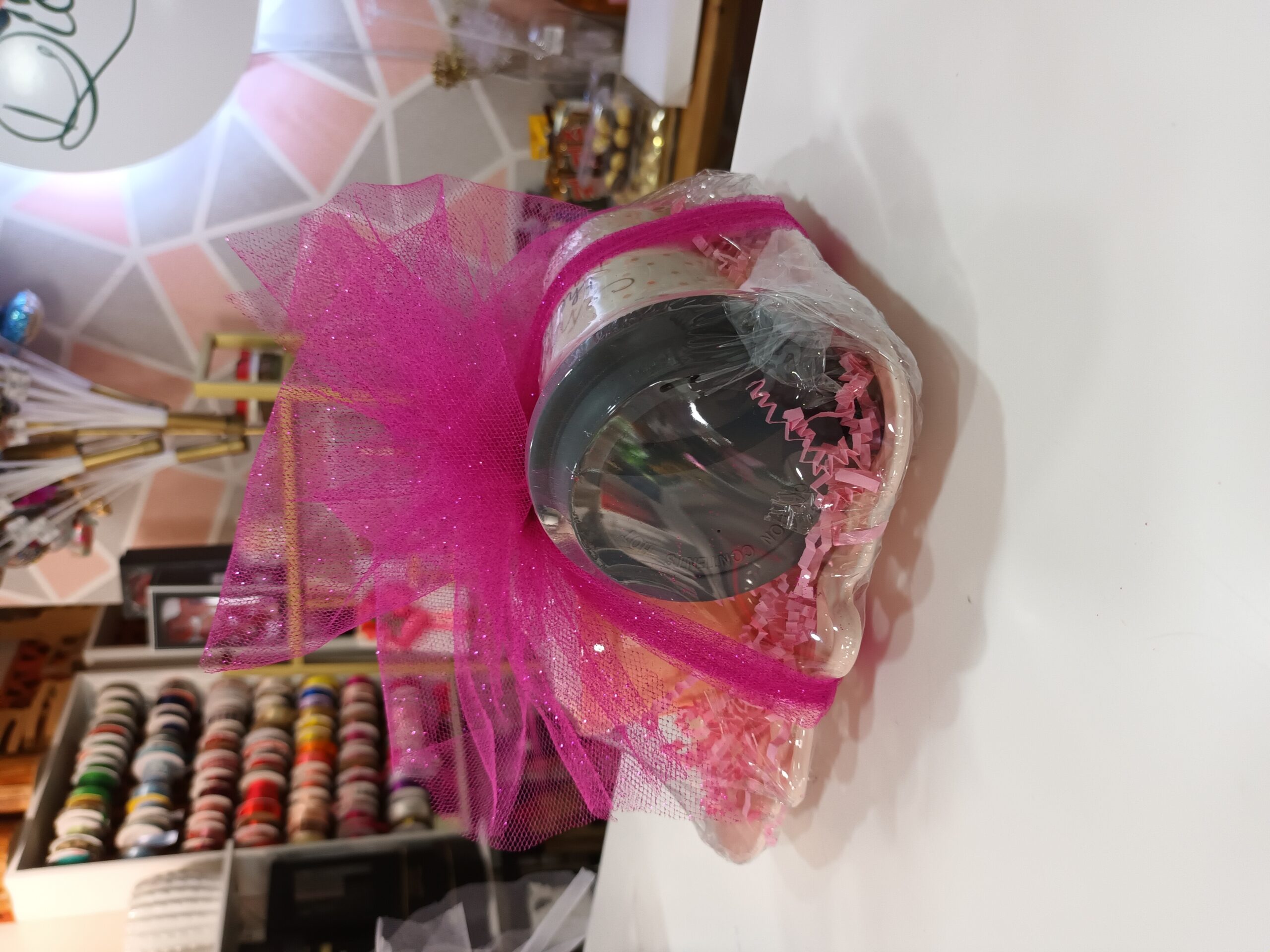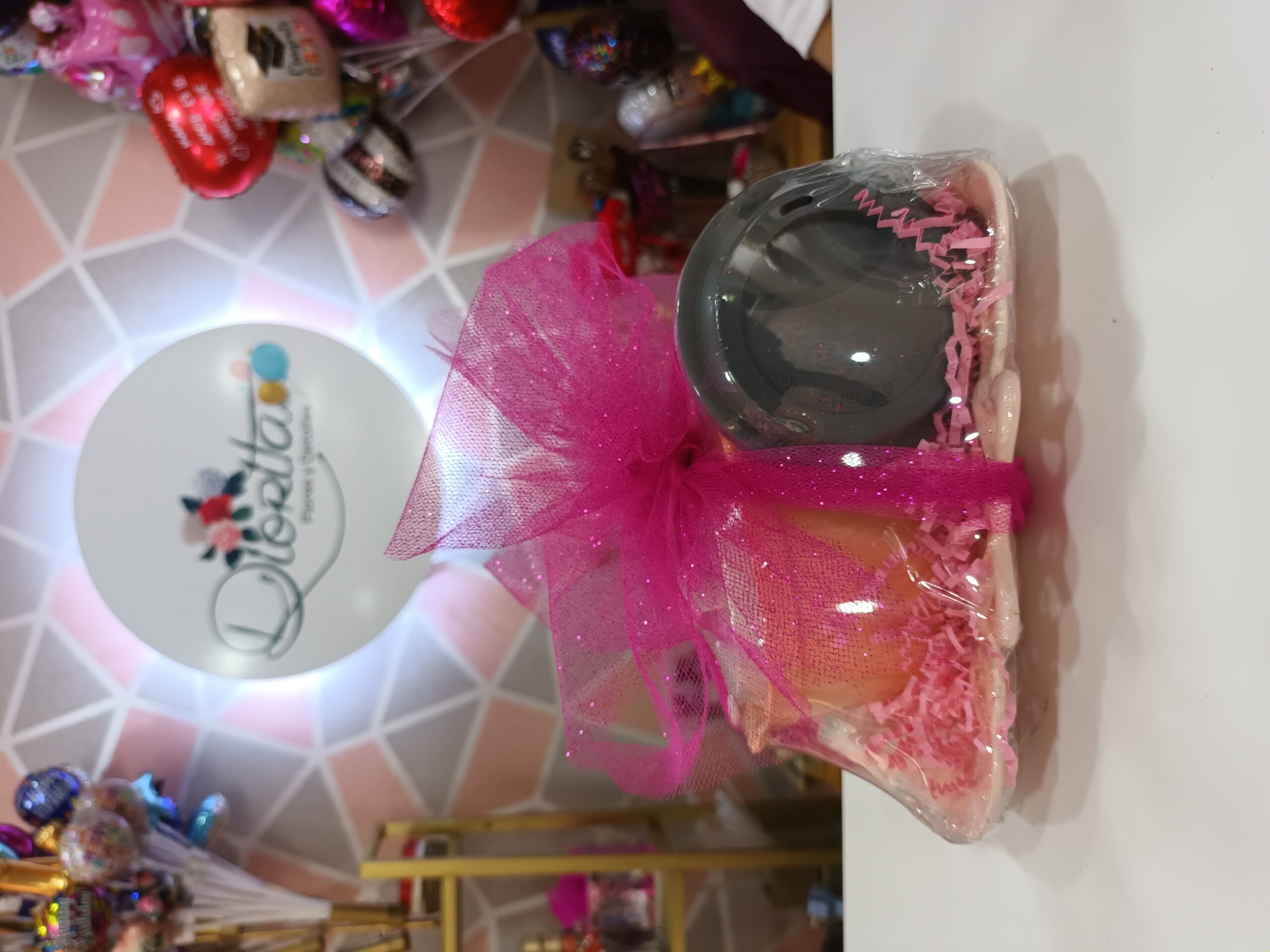 Bandeja en porcelana rosada con 1 azucarera rosada, 1 vaso Enjoy, 1 pajarito cerámica rosada. Envoltura con lazo rosa.