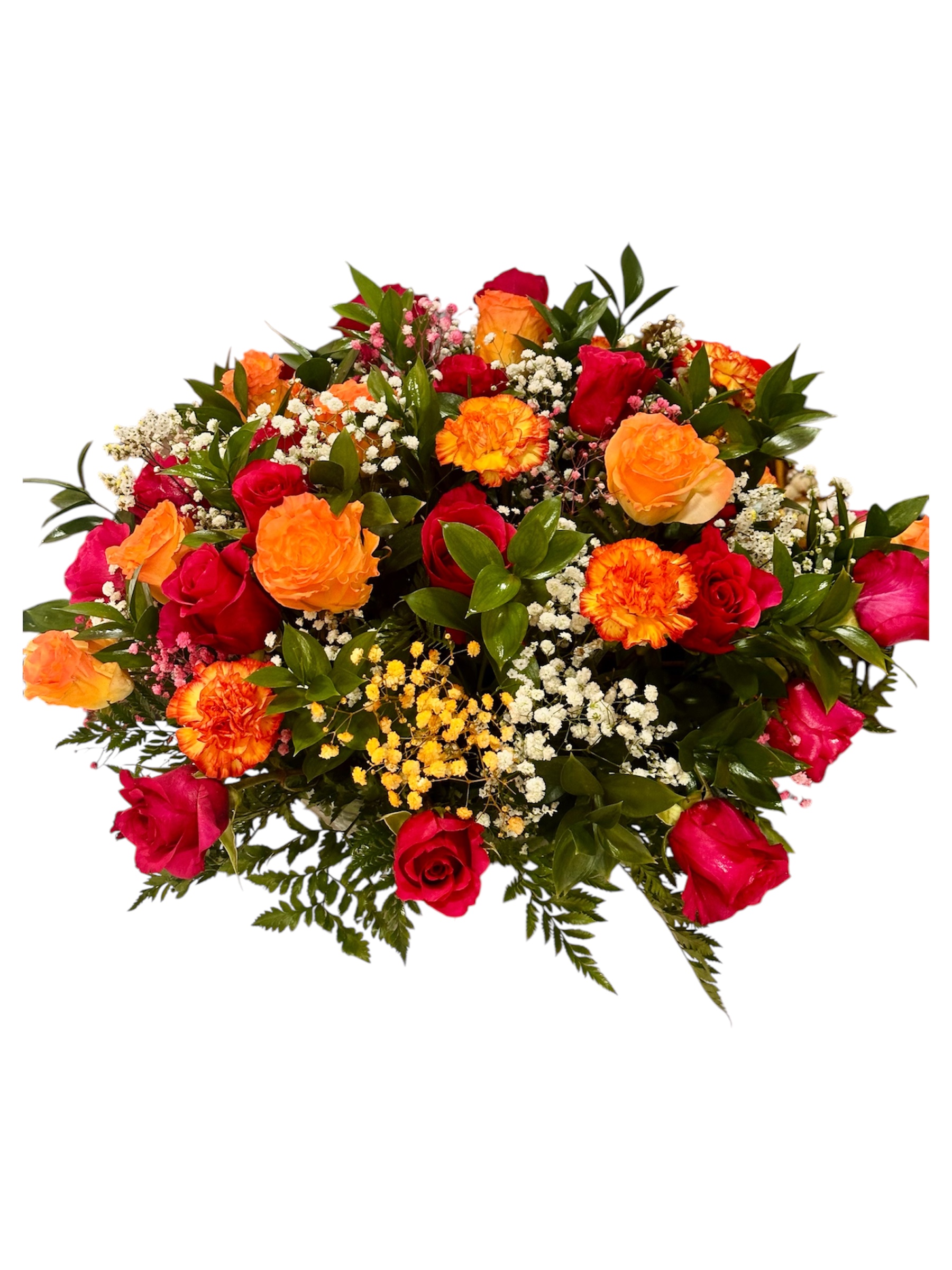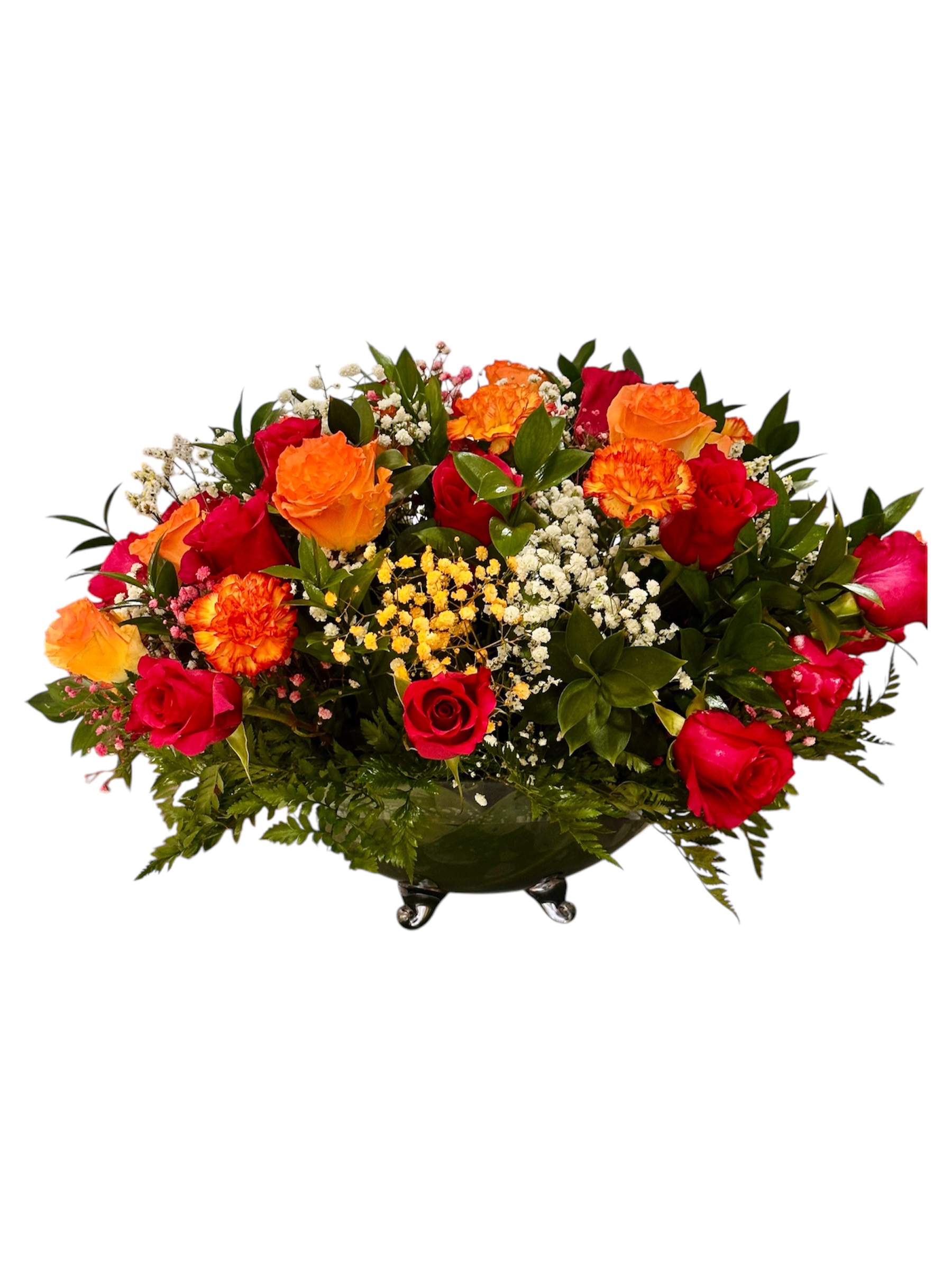 Arreglo de rosas frescas acompañado de ruscus, leather leaf y baby breath, presentado en una refinada base de cristal. Un detalle lleno de distinción, ideal para expresar sentimientos con estilo y delicadeza.