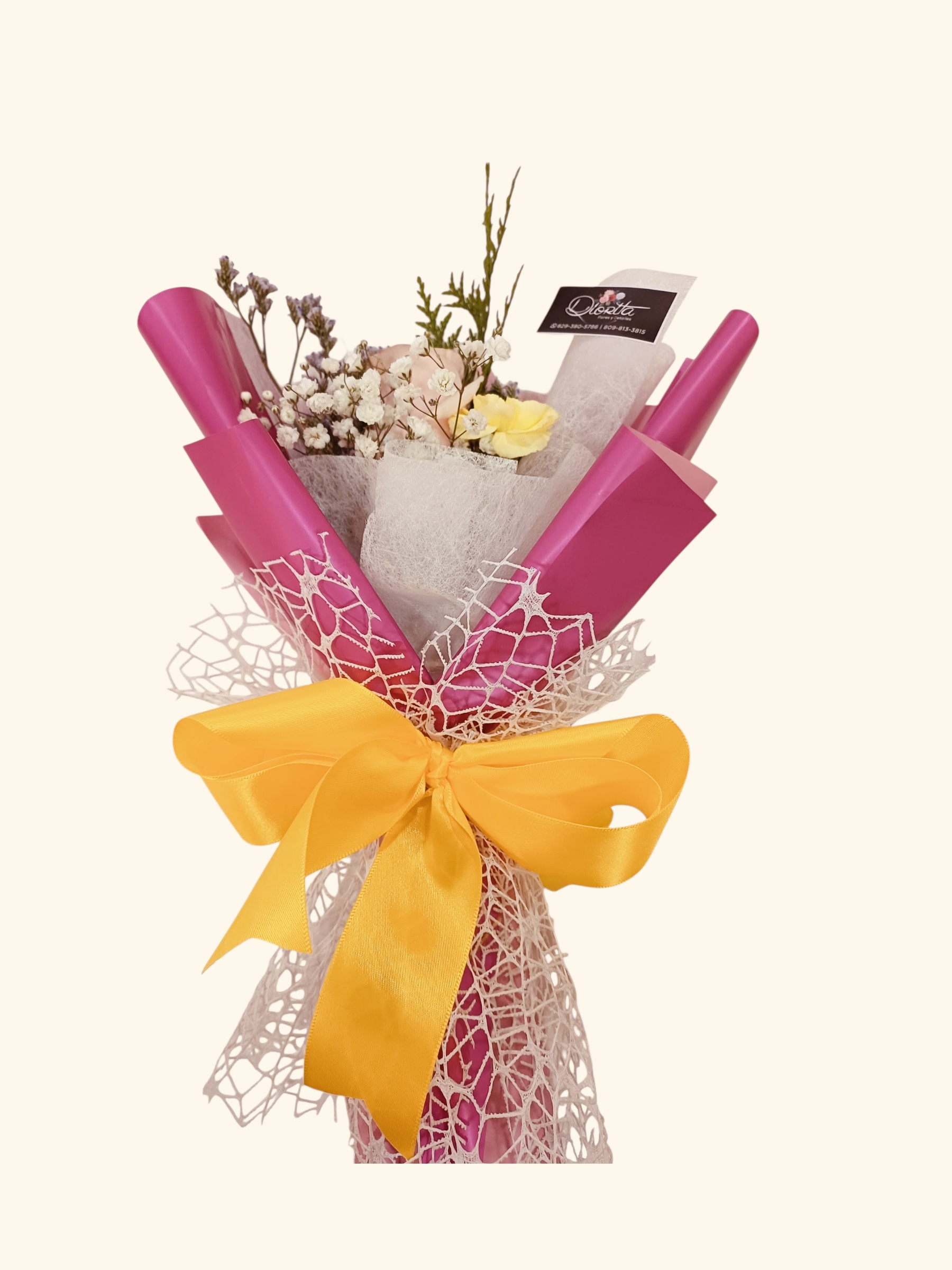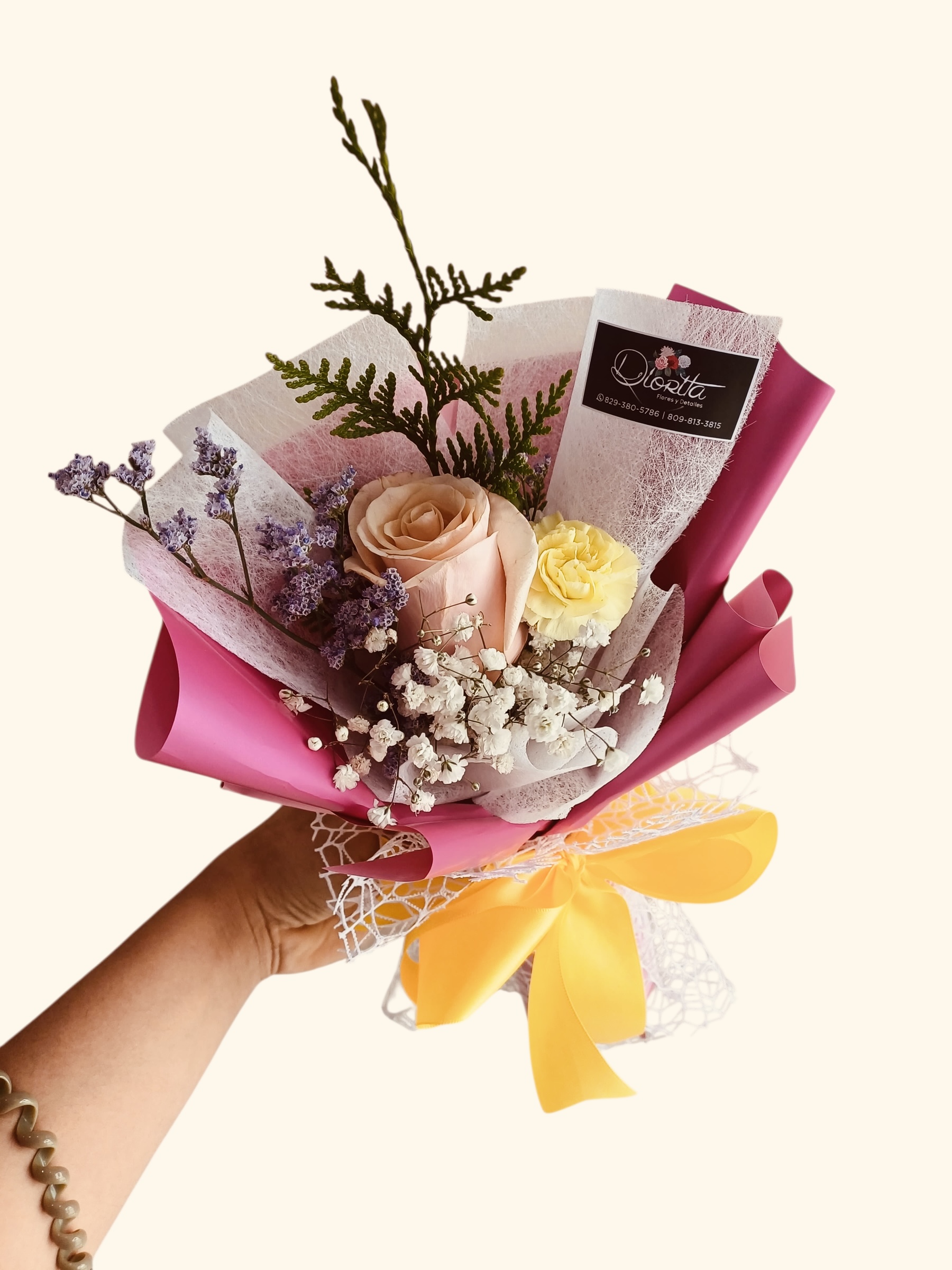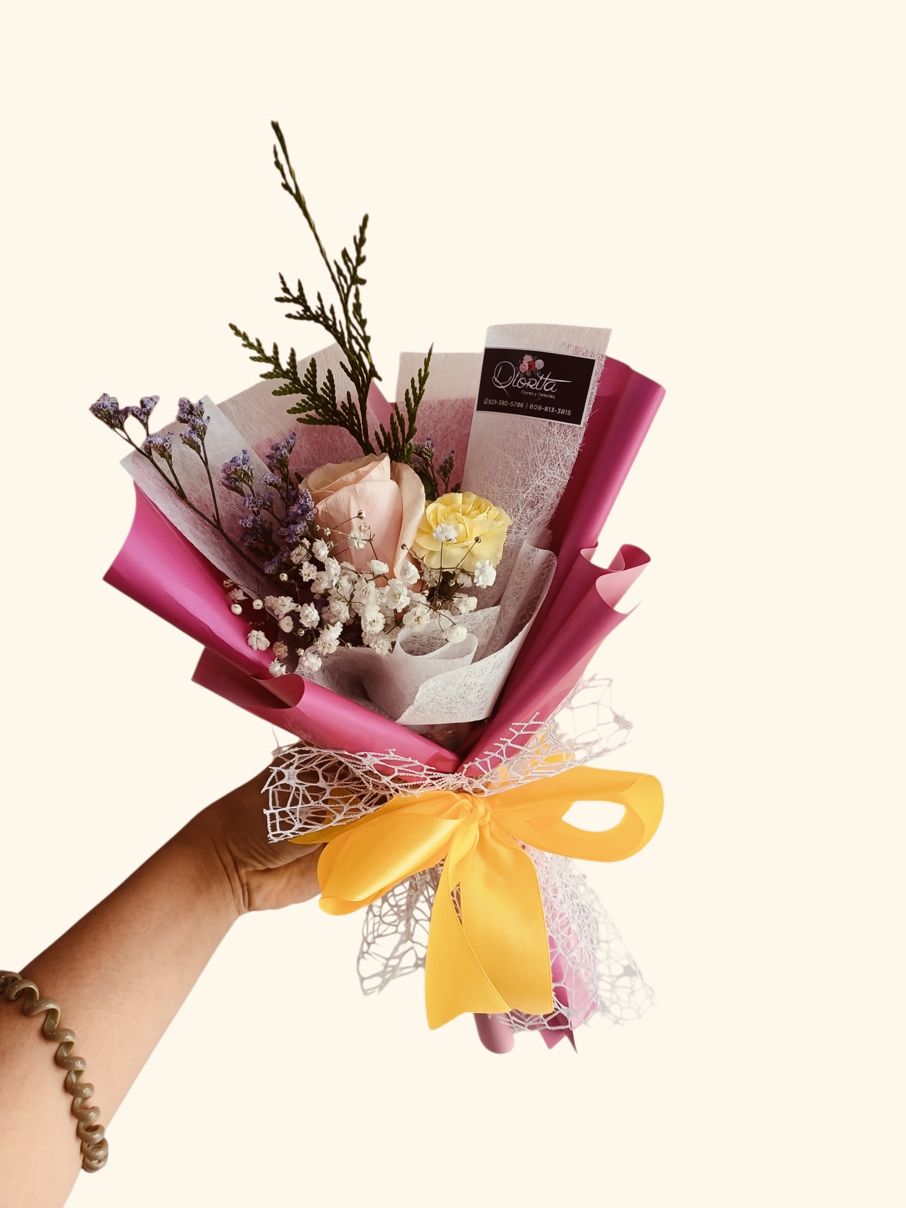 01 Envoltura en papel coreano combinado con papel pellón y malla. –Colores variables al gusto del cliente y sujeto a disponibilidad.