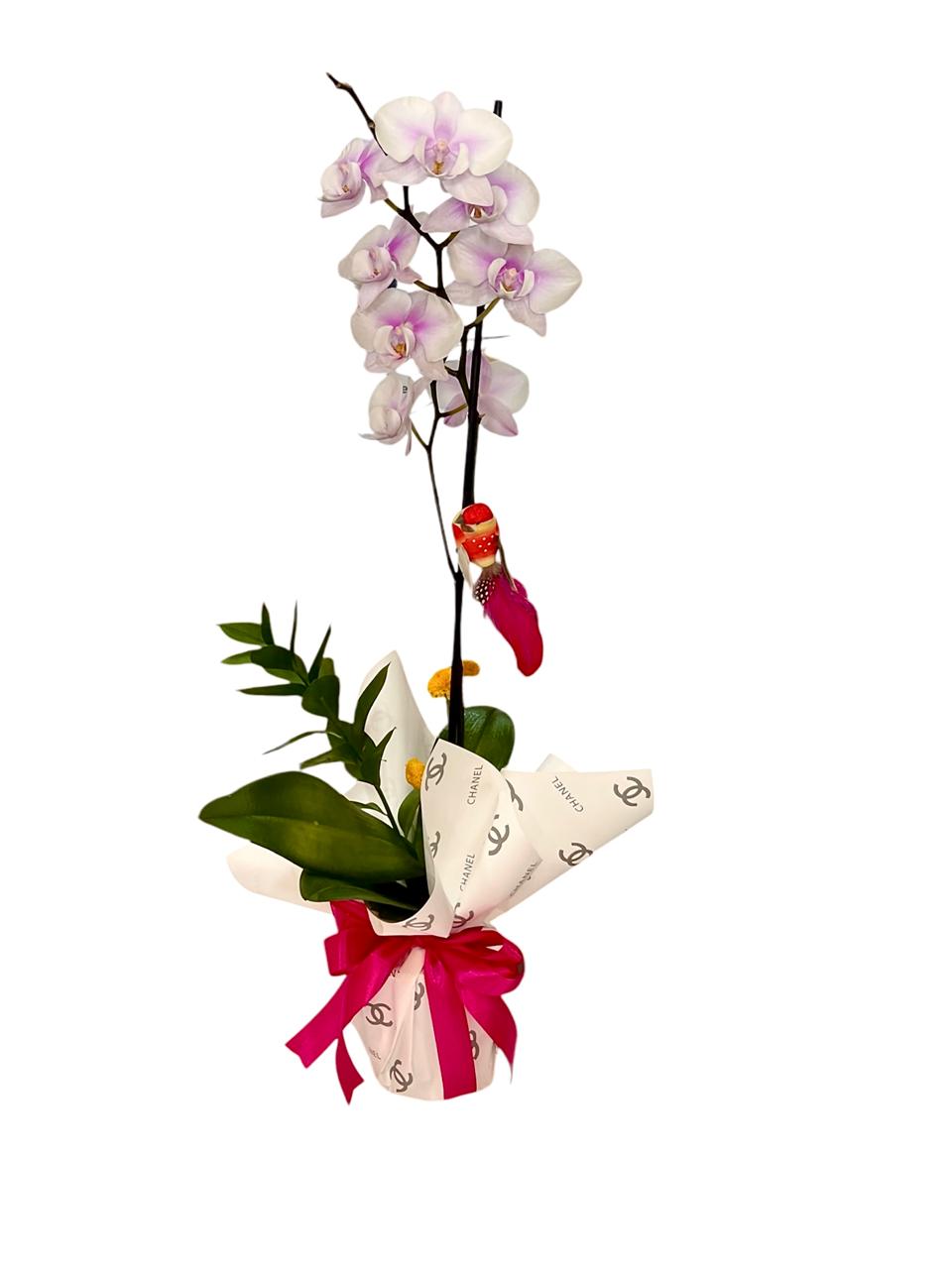 Una delicada orquídea blanca con destellos rosados, acompañada de follaje natural y un tierno pajarito, ideal para regalar un suspiro de ternura y frescura.